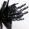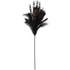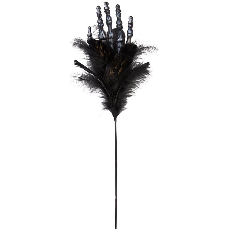 A decorative pick displaying a black skeleton hand with black feather accents perfect for adding to a seasonal vessel. Pair with faux botanicals to create a rich, natural display without the worry of withering away. Our Skeleton Hand Feather floral pick stands 7.25 inches tall and complements well with décor from our Halloween Collection.