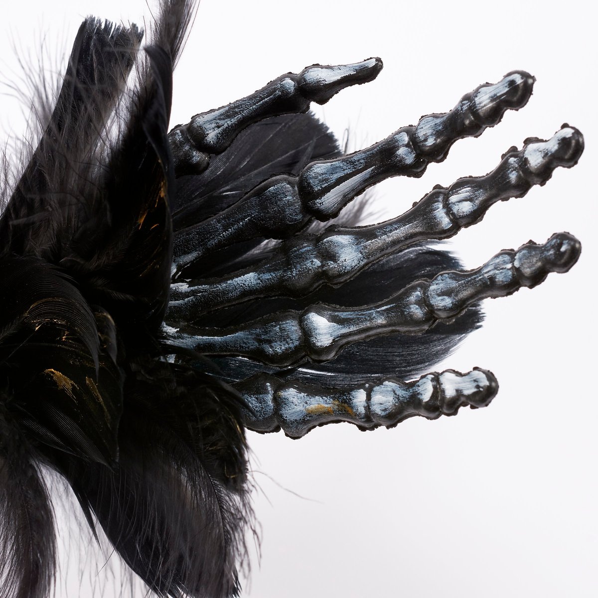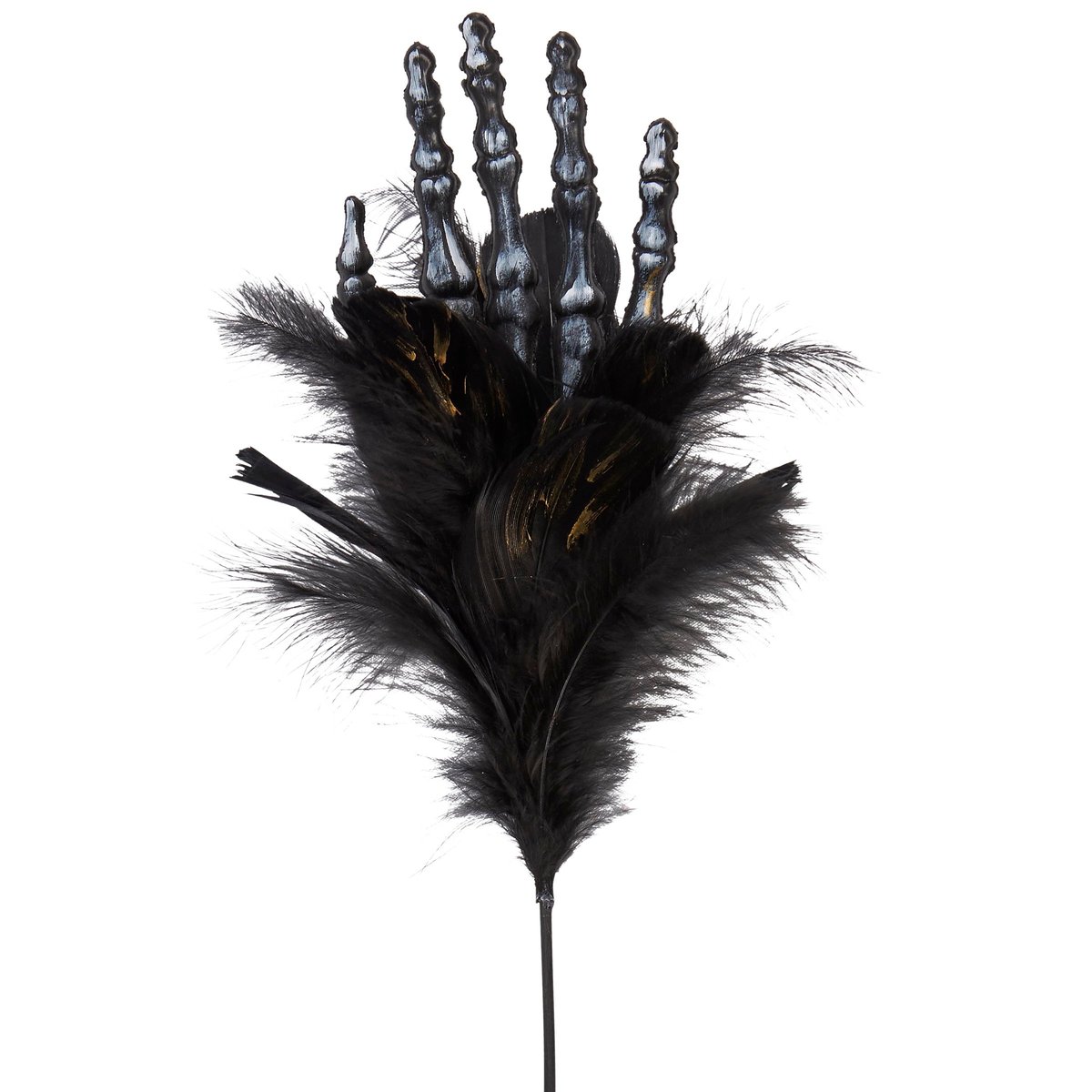 A decorative pick displaying a black skeleton hand with black feather accents perfect for adding to a seasonal vessel. Pair with faux botanicals to create a rich, natural display without the worry of withering away. Our Skeleton Hand Feather floral pick stands 7.25 inches tall and complements well with décor from our Halloween Collection.