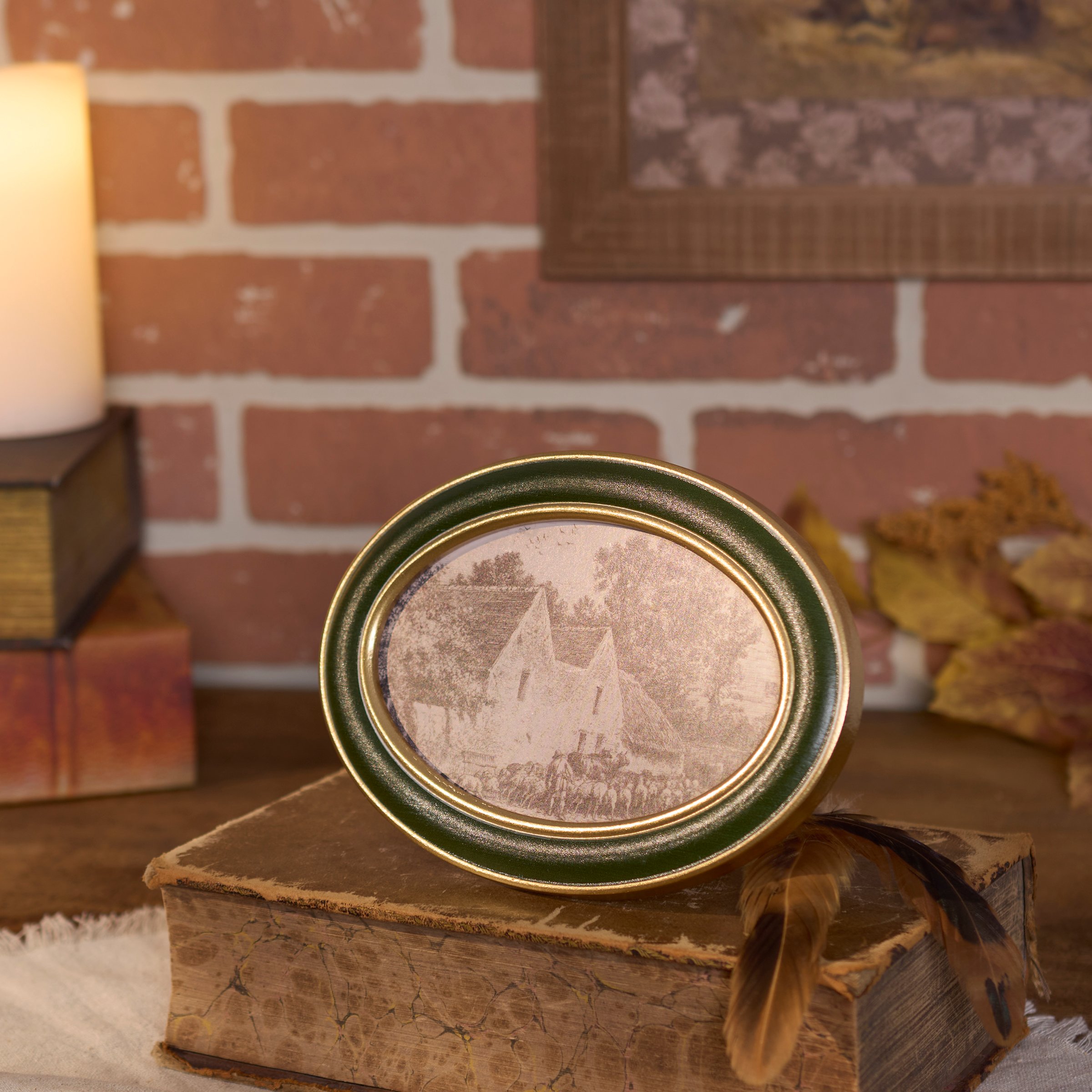 A small framed art piece from our Cottage Charm Collection displaying vintage art of a cottage farm in a hand illustrated sketch style. Vintage frame features oval shape with green color finish with metallic gold accents. Our Cottage Farm framed art is easy to hang for display via the attached sawtooth hanger or can free stand using the back easel. A vintage farm-themed home accent perfect for everyday display.