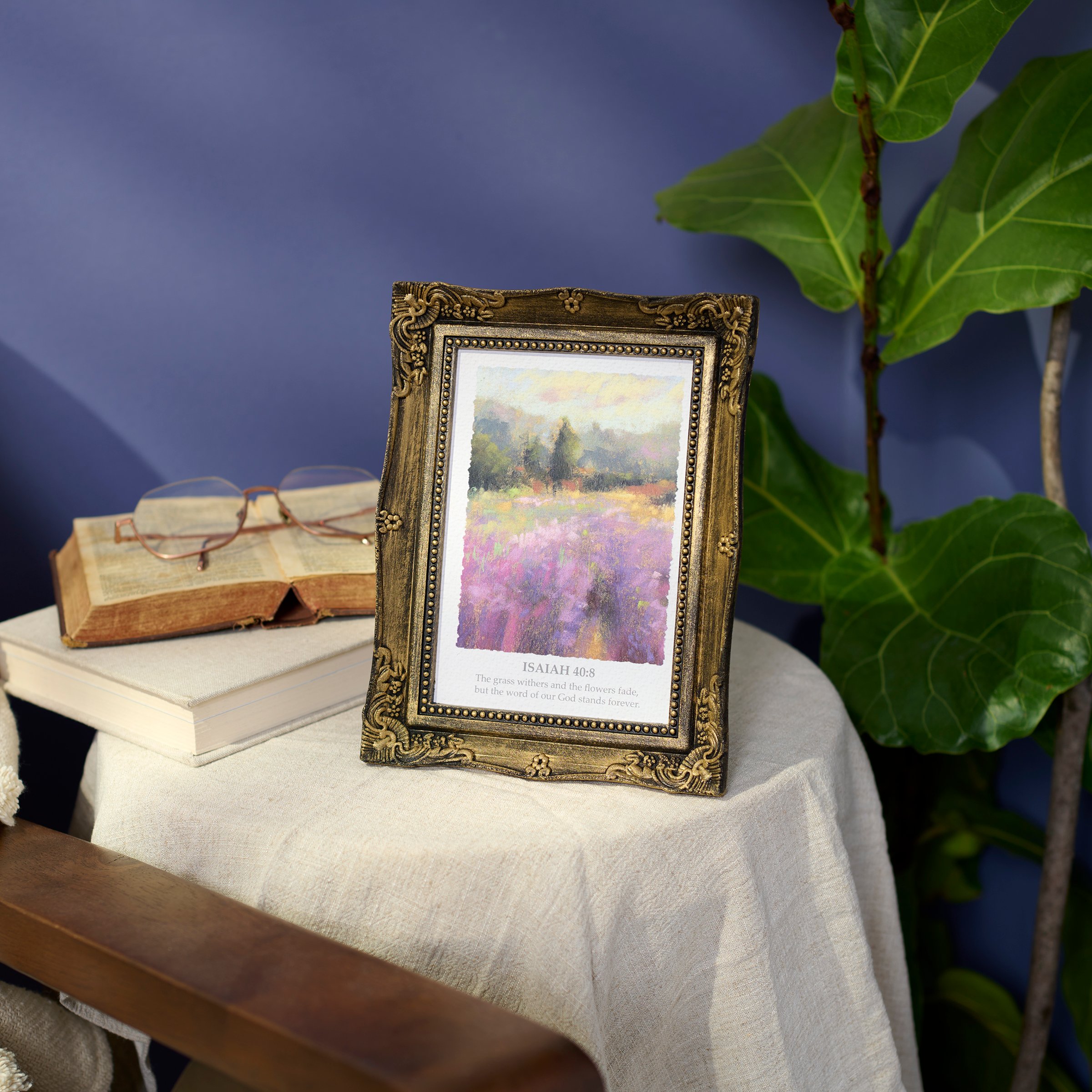 A framed art piece from our Faith Collection featuring a calming landscape replicated from gorgeous original oil pastel artwork complemented by the uplifting scripture of Isaiah 40:8. The faith inspired art and scripture are displayed inside an ornate sculpted frame with metallic antique wash for a vintage style. Our God Stands Forever framed art is easy to hang for display via the attached sawtooth hanger or can free stand using the back easel. An inspirational home accent perfect for everyday display.