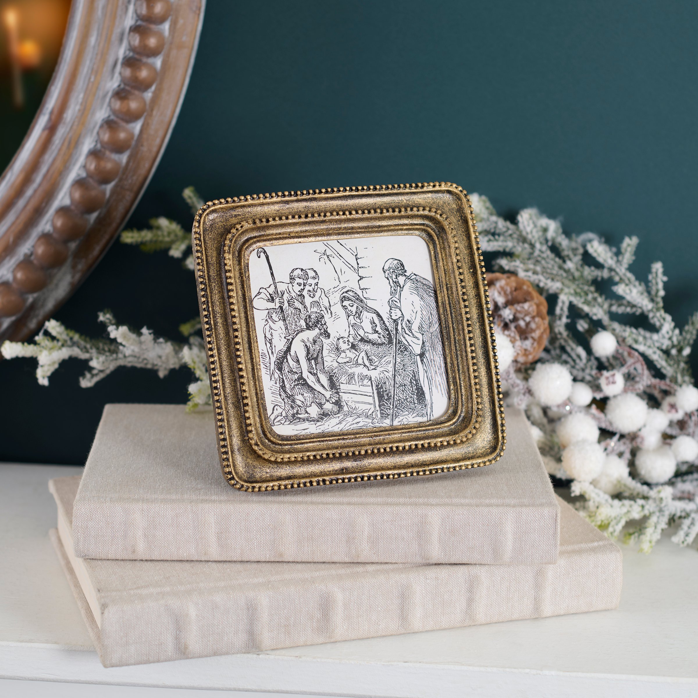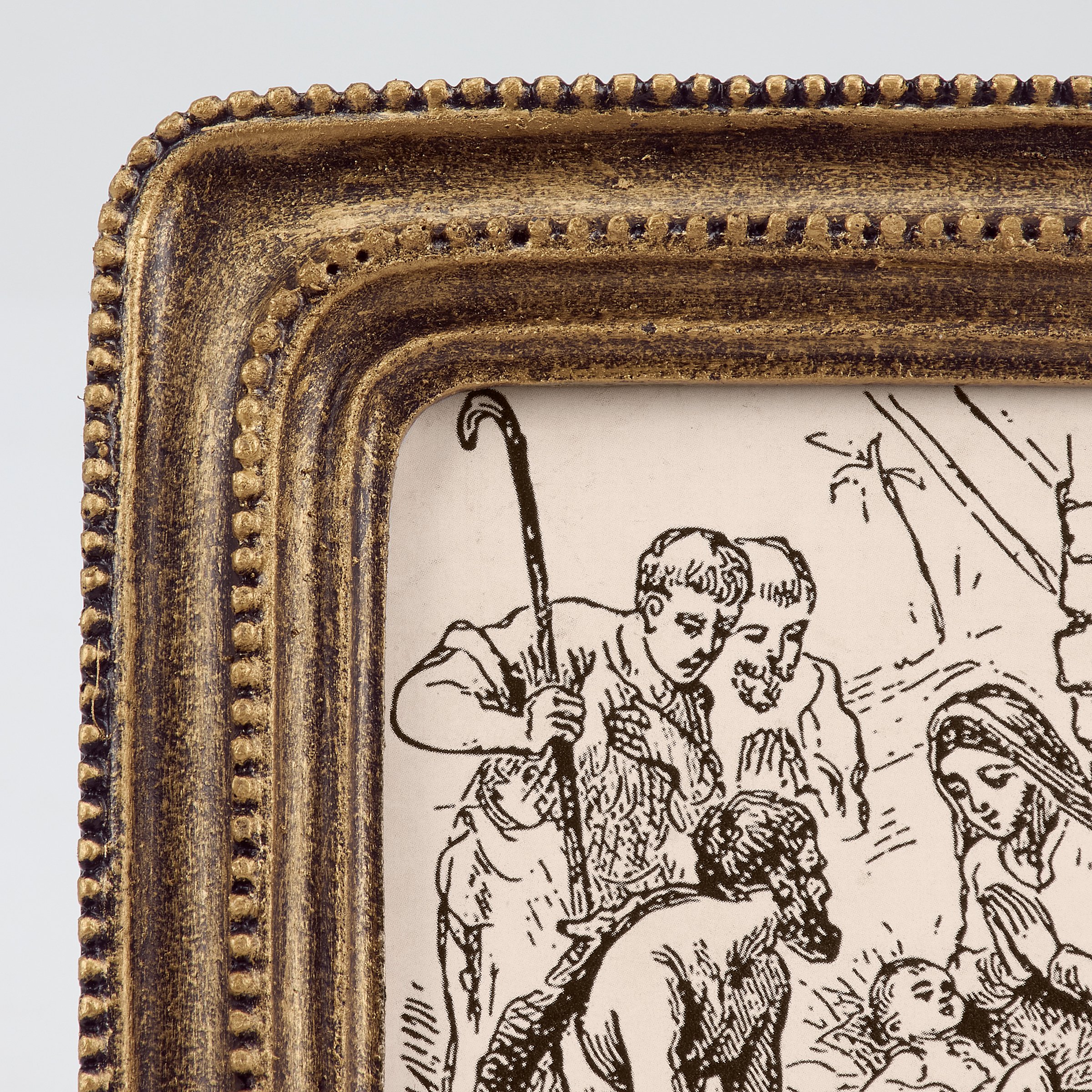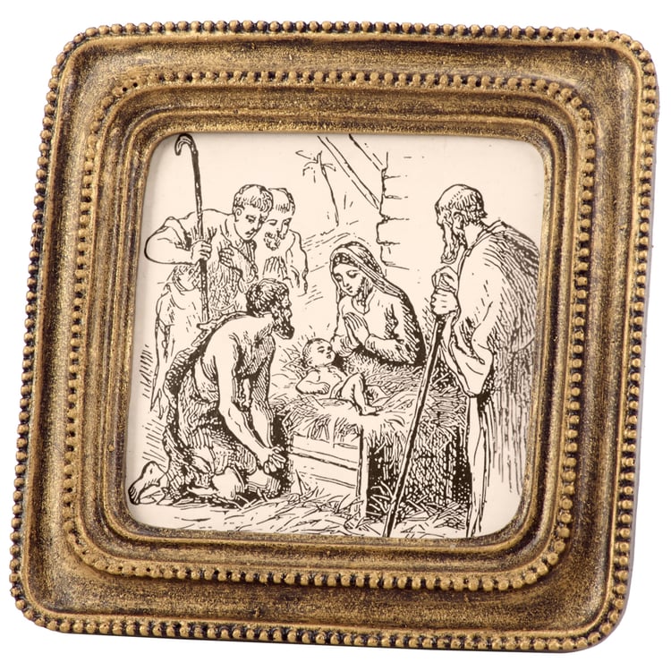 A framed art piece from our Christmas Collection featuring a nativity scene in a hand sketched style inside a sculpted frame with metallic antique wash for a vintage style. Our Nativity Sketch framed art is ready to hang via the attached sawtooth hanger or can free-stand using the easel back. A vintage Christmas home accent perfect for seasonal display.