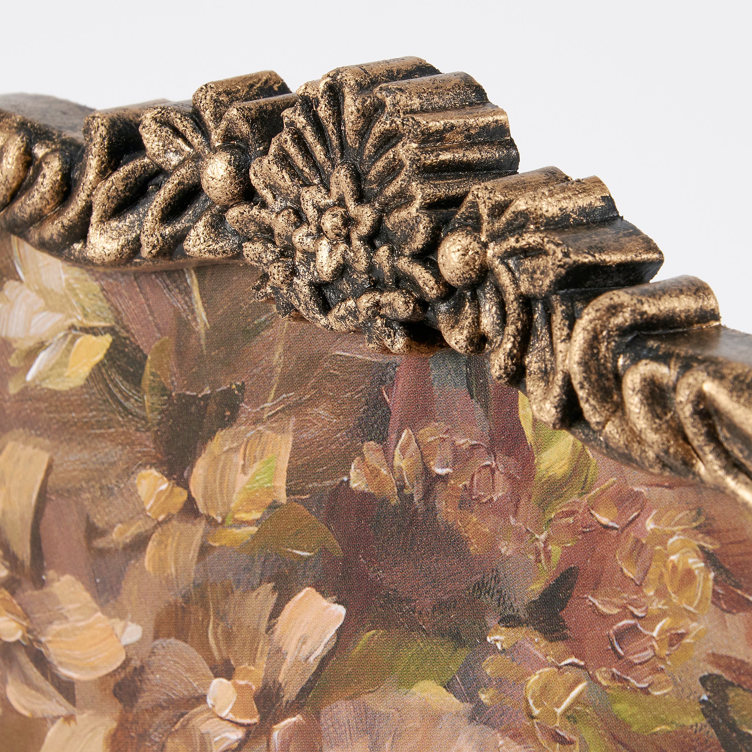 A set of small framed art pieces from our Moody Collection displaying hand painted florals in deep color palettes inside sculpted frames with metallic antique wash for a vintage style. Art set includes 2 individual designs replicated from original artwork hand painted in a unique watercolor style. Our Moody Floral framed art set is easy to display using the attached easels to free-stand. A set of stylish home accents perfect for everyday displays.