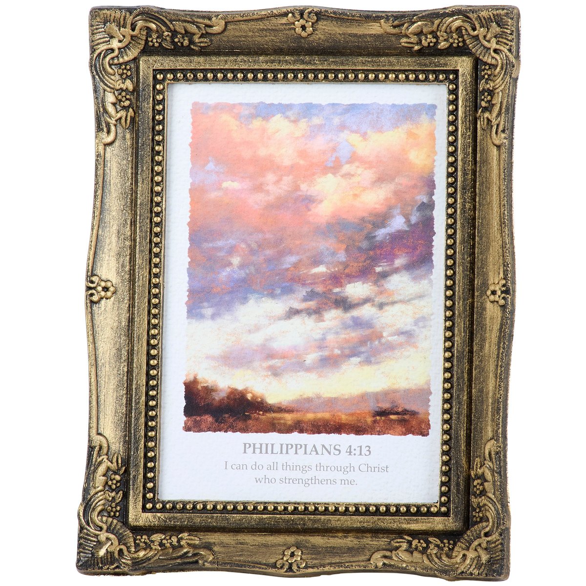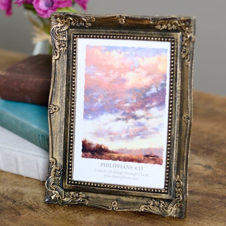 A framed art piece from our Faith Collection featuring a calming landscape replicated from gorgeous original oil pastel artwork complemented by the uplifting scripture of Philippians 4:13. The faith inspired art and scripture are displayed inside an ornate sculpted frame with metallic antique wash for a vintage style. Our Through Christ framed art is easy to display via the attached easel to free-stand. An inspirational home accent perfect for everyday display.