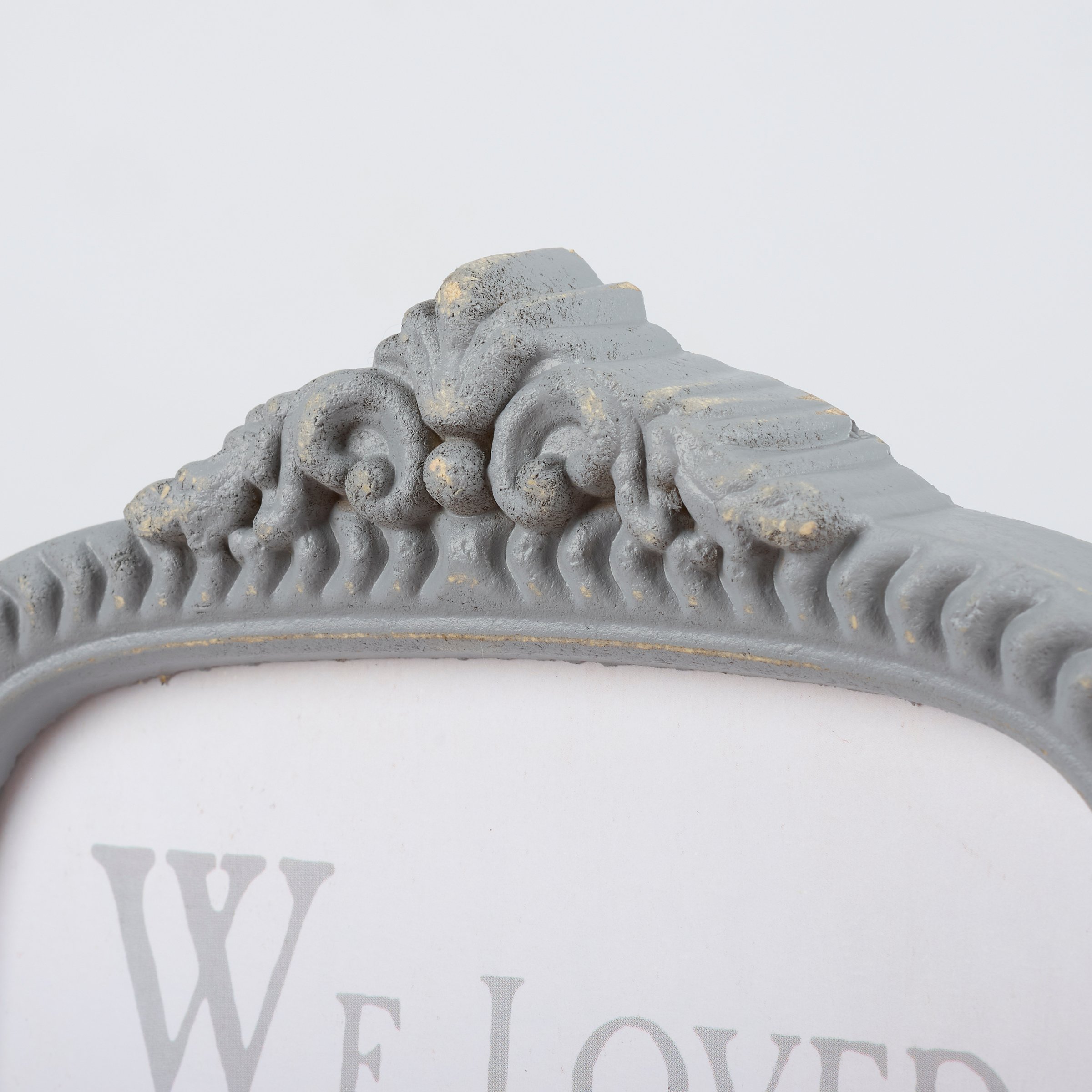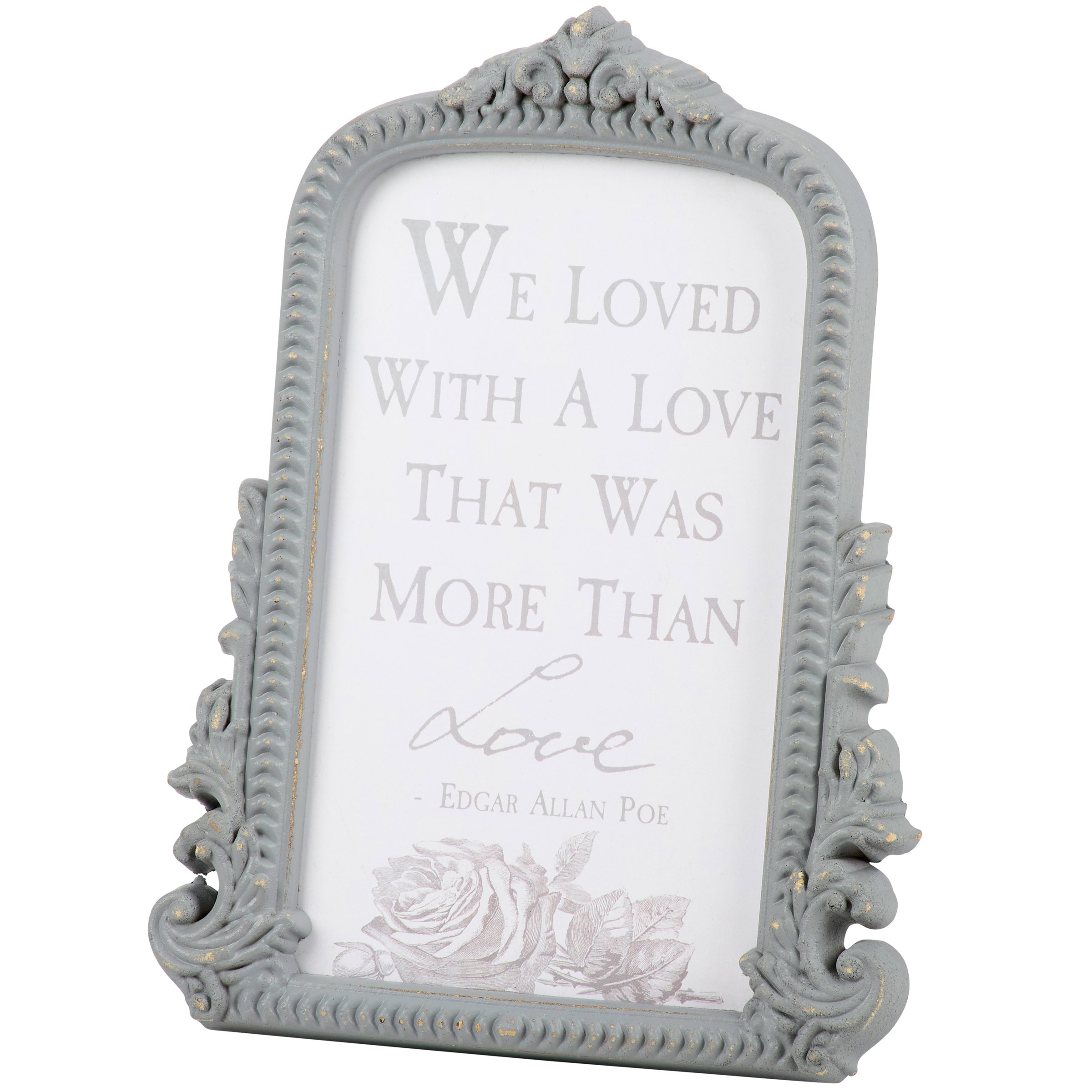 A framed art piece from our Haunted White Collection displaying a line from an Edgar Allan Poe that reads "We Loved With A Love That Was More Than Love" above a sketch of a flower. Frame features an ornate design with matte gray color finish and distressed details to complete the neutral palette. Our We Loved framed art is ready to hang via the attached sawtooth hanger or can free-stand using the easel back. A neutral Halloween home accent perfect for seasonal display or as everyday literature themed decor.
