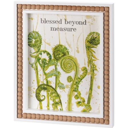 Inset wall art from our Botanical Collection features watercolor greenery designs with a "Blessed Beyond Measure" sentiment. White wooden frame features natural wooden bead details for added interest. Blessed Beyond Measure wall art is easy to hang via two predrilled keyhole slots. This house plant home decor is perfect for any space.