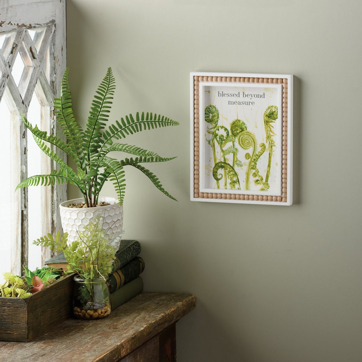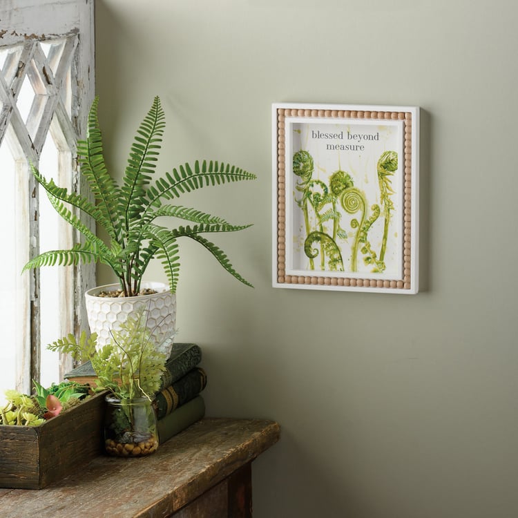 Inset wall art from our Botanical Collection features watercolor greenery designs with a "Blessed Beyond Measure" sentiment. White wooden frame features natural wooden bead details for added interest. Blessed Beyond Measure wall art is easy to hang via two predrilled keyhole slots. This house plant home decor is perfect for any space.