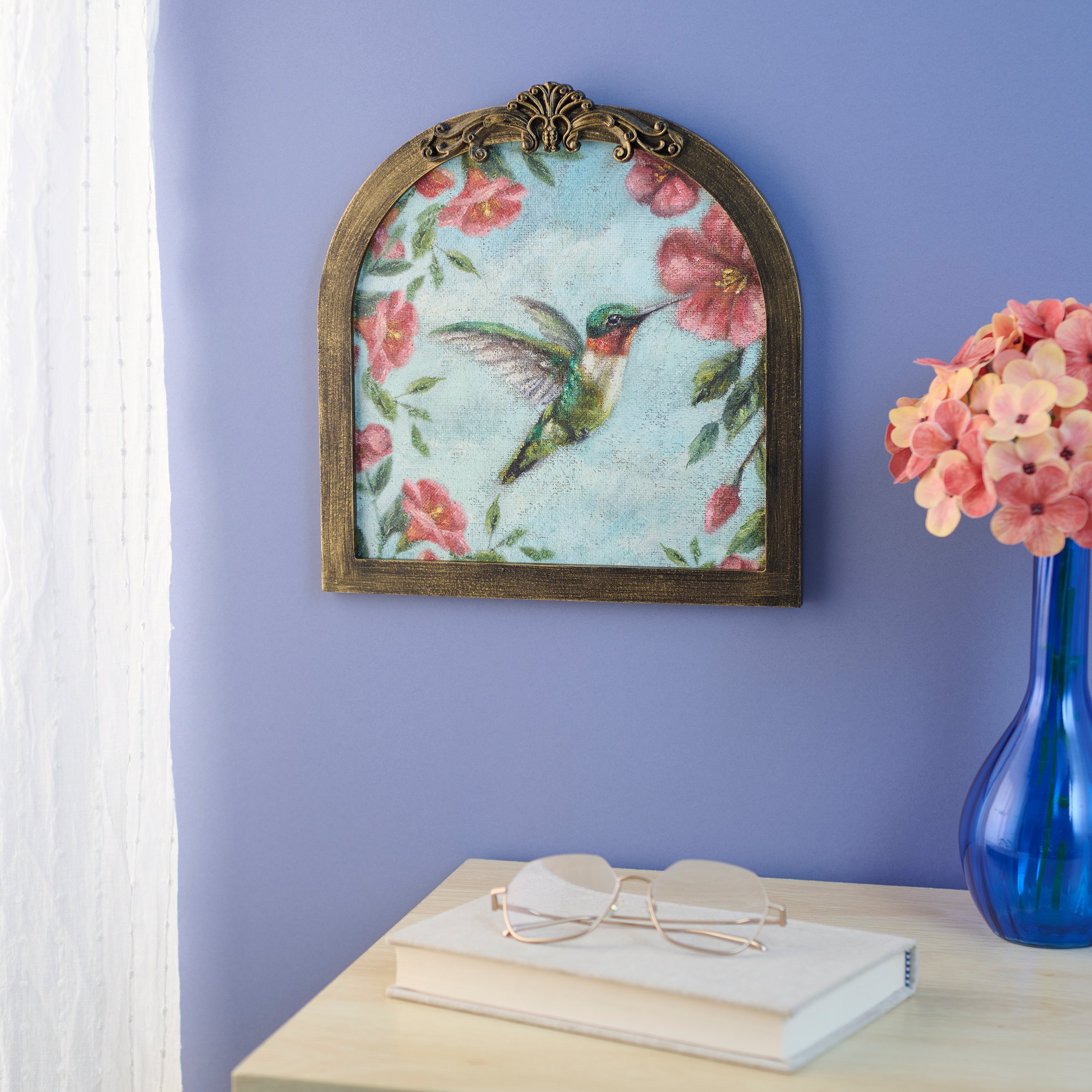 A framed art piece from our Art Nouveau Collection displaying a charming scene of a hummingbird and flowers inspired by art nouveau inside a molded frame with metallic antique finish for a vintage style. Hummingbird design is replicated from original artwork painted onto burlap canvas, giving the art a unique depth and texture. Our Hummingbird framed wall art is ready to hang for display using the attached sawtooth hanger on the back. A botanical home accent perfect for adding vintage style to an everyday display.