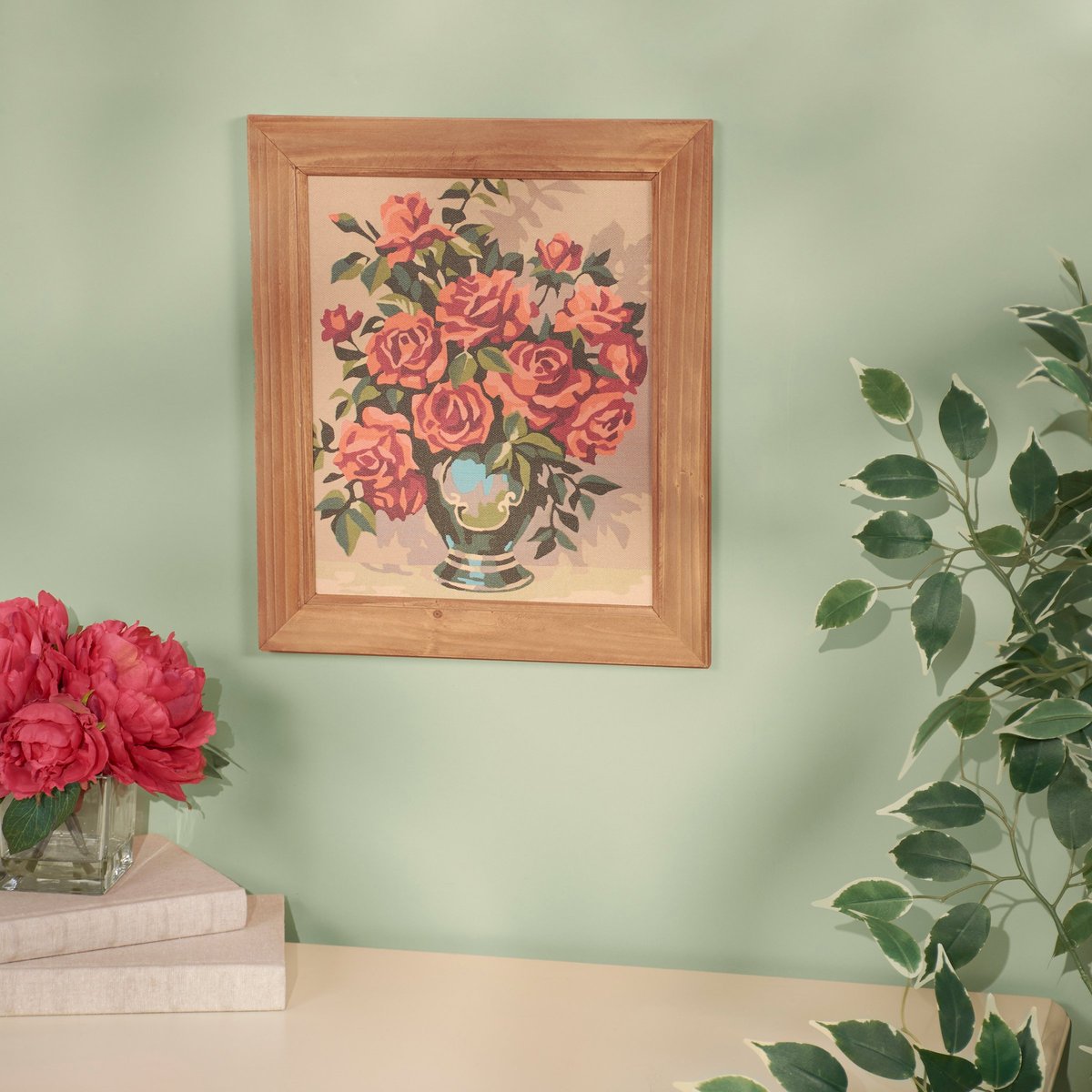 A framed art piece from our Valentine's Day Collection displaying hand painted art roses in a vase. Frame features complementing natural wood. Our Rose Vase framed wall art is easy to hang via attached sawtooth hanger on the back. A charming home accent perfect for seasonal display.