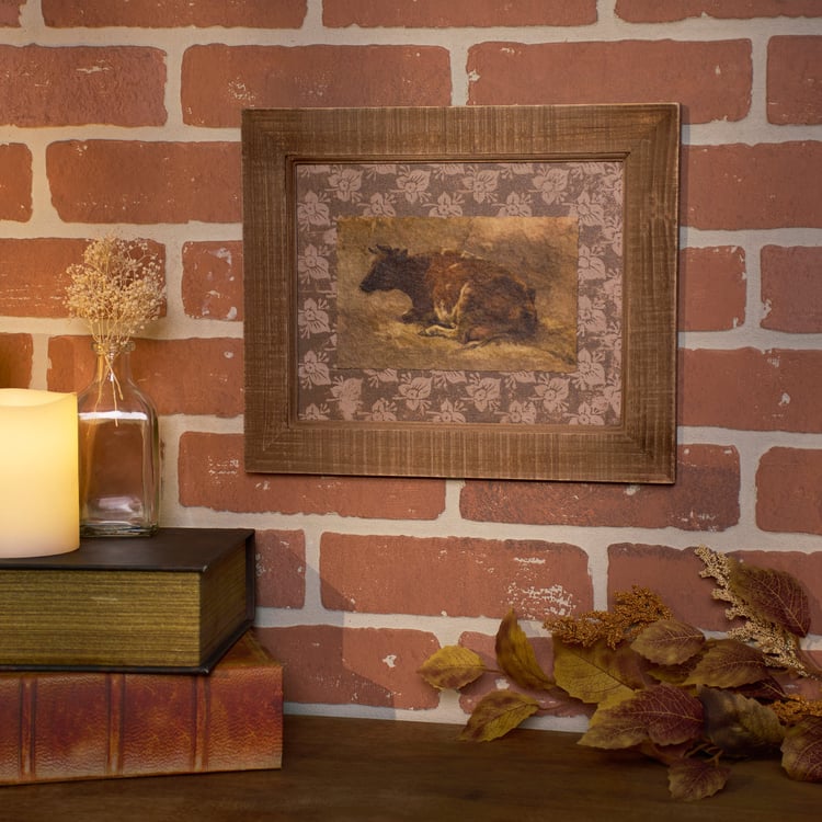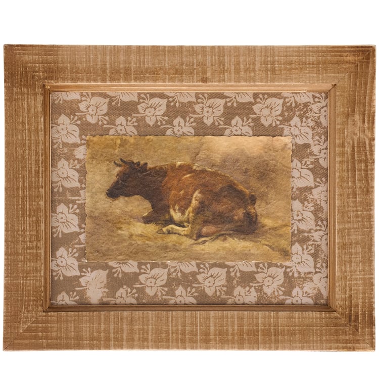 A framed art piece from our Cottage Charm Collection displaying vintage art of a cow on a textured canvas piece and attached to a fabric background displaying a floral pattern for added dimension. Frame features a rustic natural wood design with distressed details. Our Vintage Cow framed wall art is easy to hang for display via the attached sawtooth hanger. A vintage farm-themed home accent perfect for everyday display.