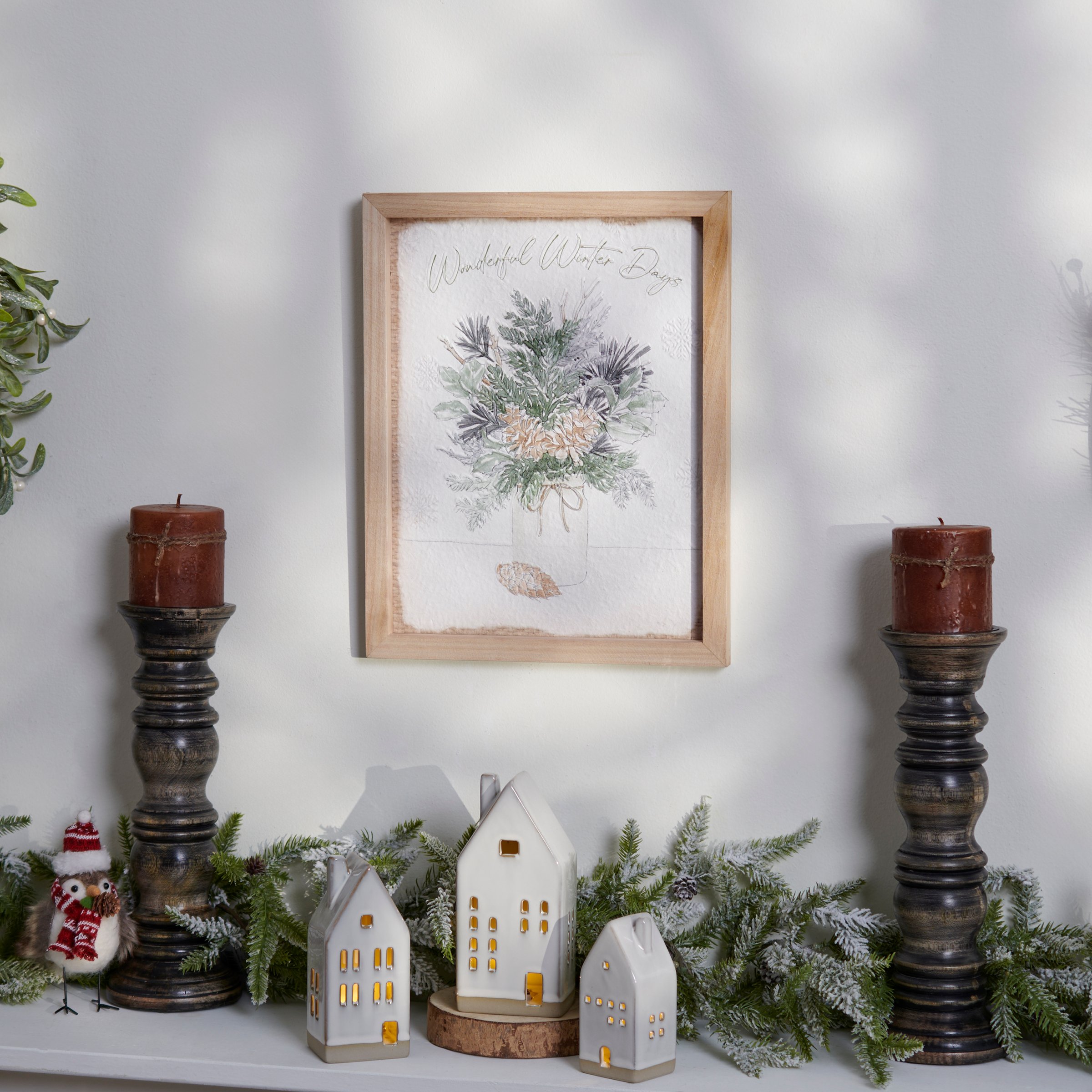 A wooden framed wall art piece from our Christmas Collection displaying a neutral color palette and inset frame design. Design features a vase of winter greenery on a textured background with a seasonal sentiment that reads "Wonderful Winter Days." Our Winter Days framed wall art is easy to hang via attached sawtooth hanger. An inspirational home accent that easily blends with a variety of seasonal home décor.