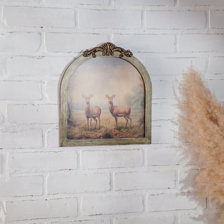 A framed art piece from our Vintage Collection displaying vintage art of young bucks in a woodland scene inspired by old world home décor. Frame features molded ornate design with metallic antique wash for a vintage style. Our Young Bucks framed wall art is easy to hang via attached sawtooth hanger on the back. A rustic home accent perfect for everyday display.