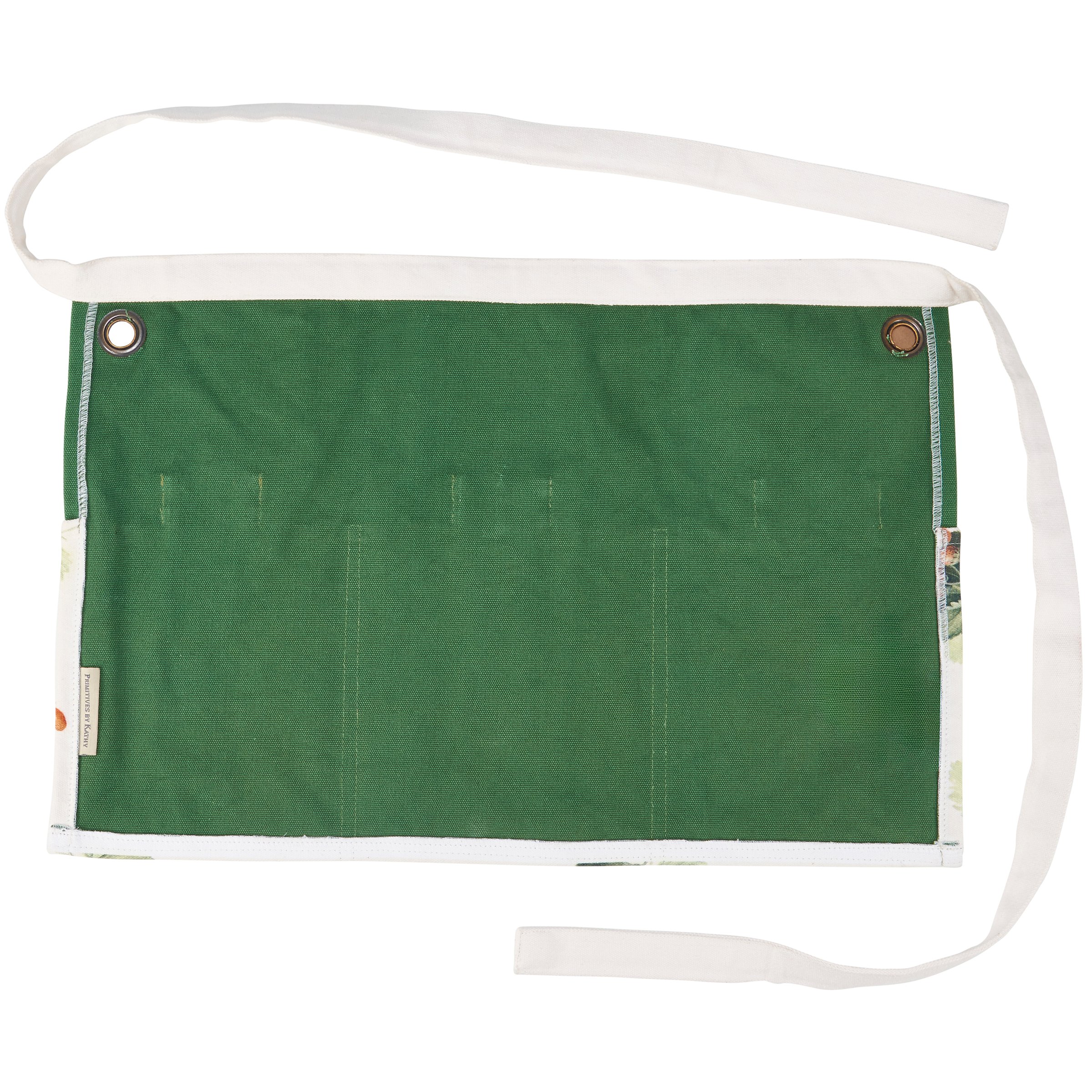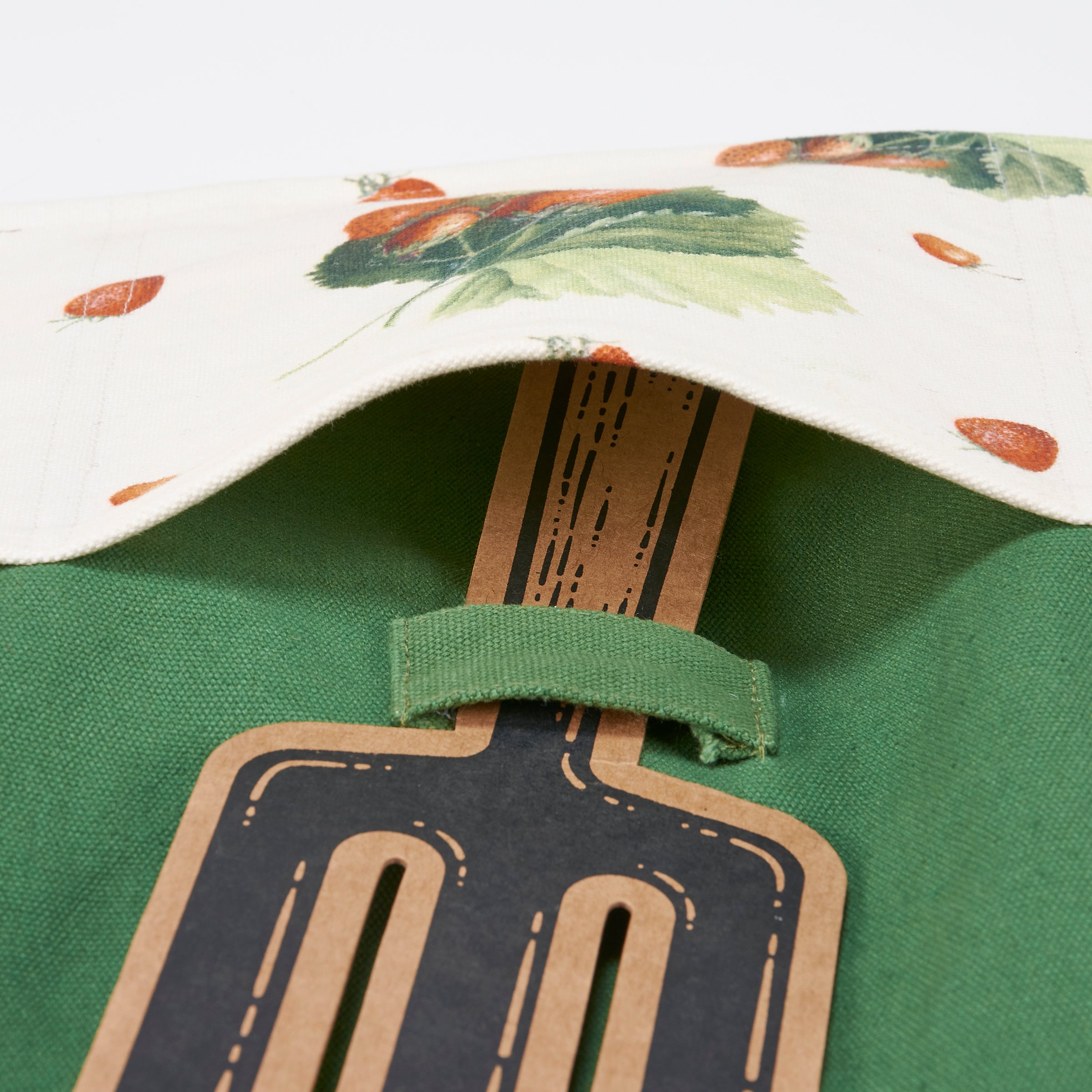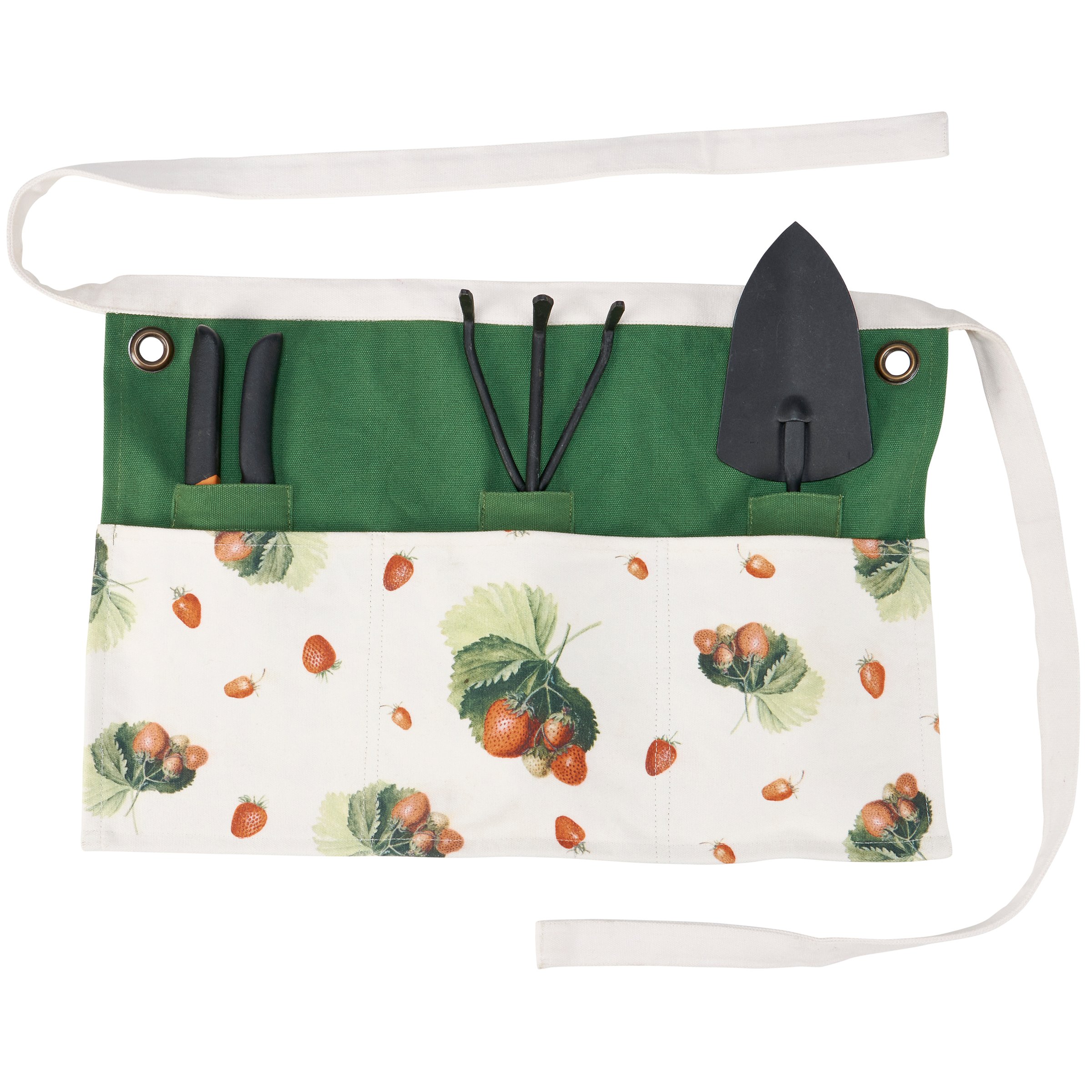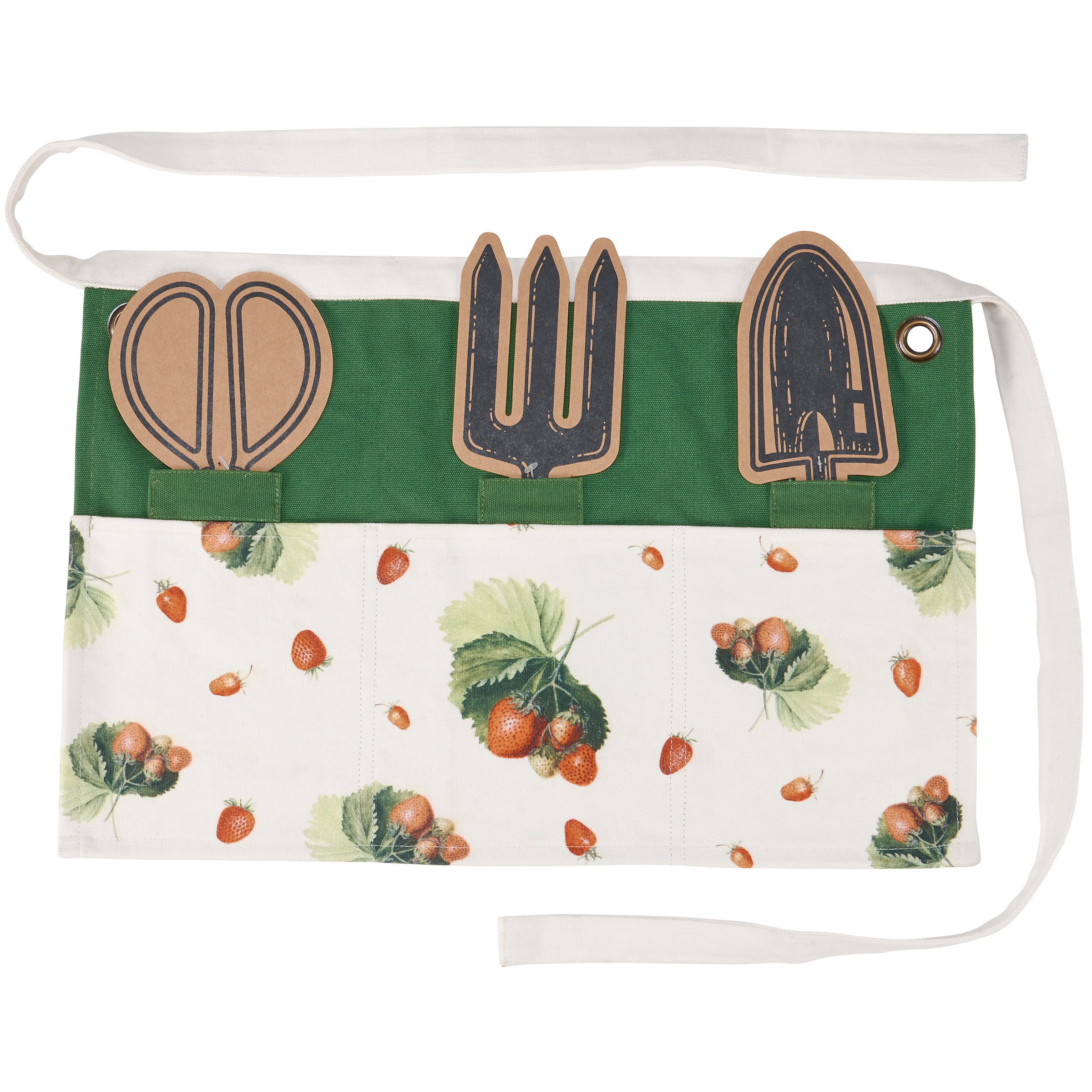 A thick canvas apron from our Garden Collection featuring a half apron style with spaces to hold tools and metal grommets on each side to hang accessories, making it perfect to use while gardening. Apron displays an all over pattern of strawberries in a vintage style on the pockets and coordinating green color on back and tool holders. Garden apron includes waist ties to create the perfect fit. Our Strawberries apron is machine-washable for convenient cleaning. Packaged with 3 cardboard cutouts displaying tool designs to show how garden apron can be used. Actual garden tools pictured not included. A charming strawberry-themed gift that adds functional style to outdoor activities.