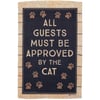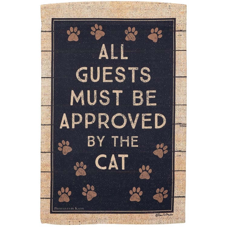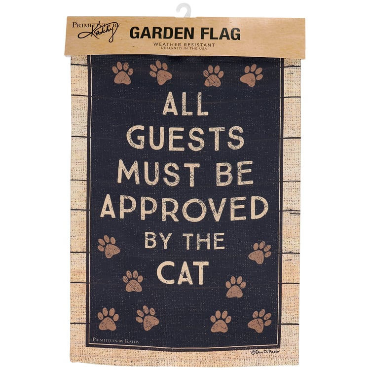 A double-sided polyester garden flag from our Pet Collection displaying a pet-themed design in a rustic style. Design features paw prints and "All Guests Must Be Approved By The Cat" sentiment. Garden flag is weather-resistant and features an opening to hang on our Garden Flag Pole. Hand-wash only. Our Approved By Cat garden flag is packaged with a header card and hook to easily hang on rack. A fun pet-themed home accent perfect for everyday display in any yard or garden.