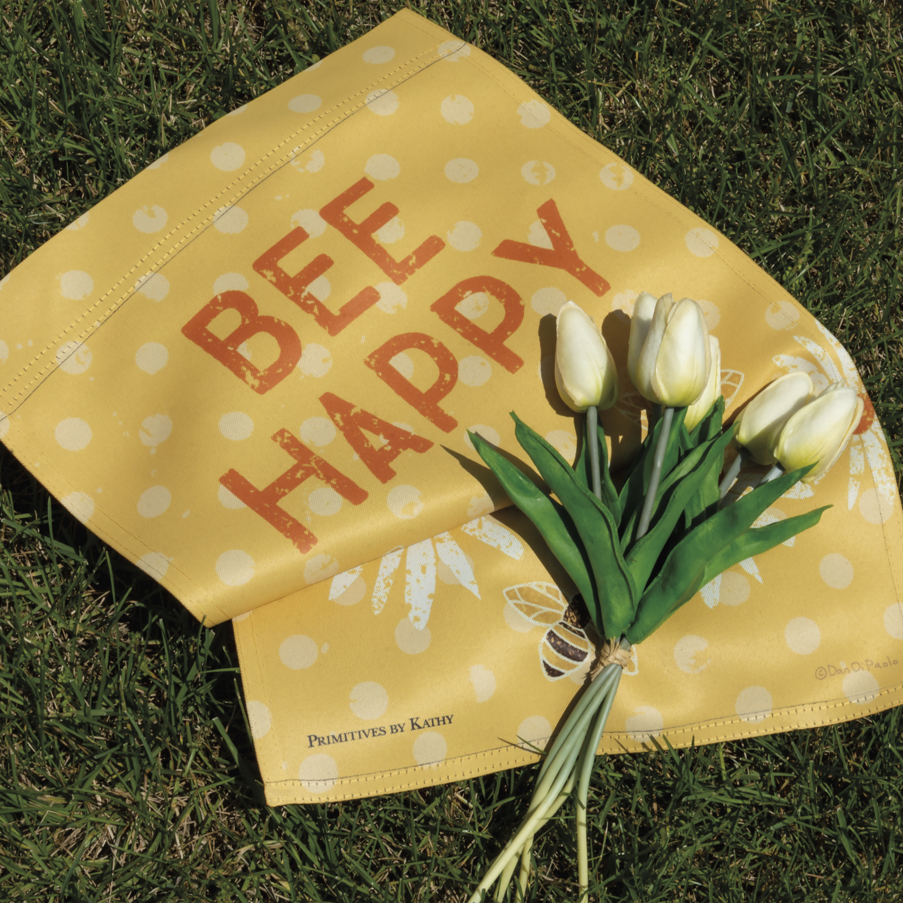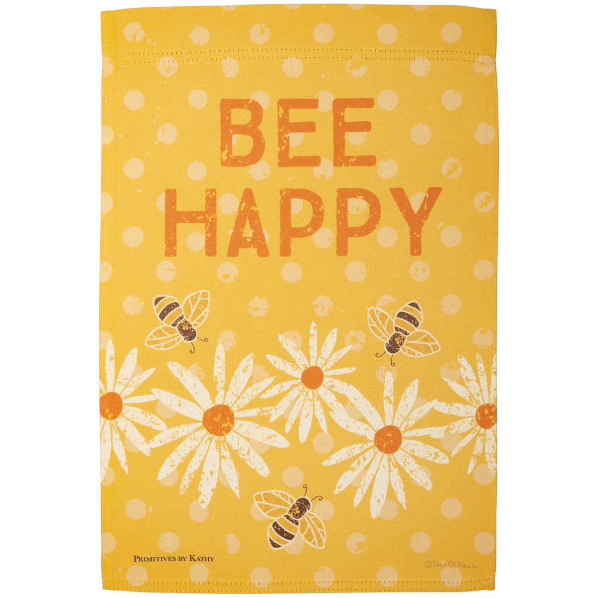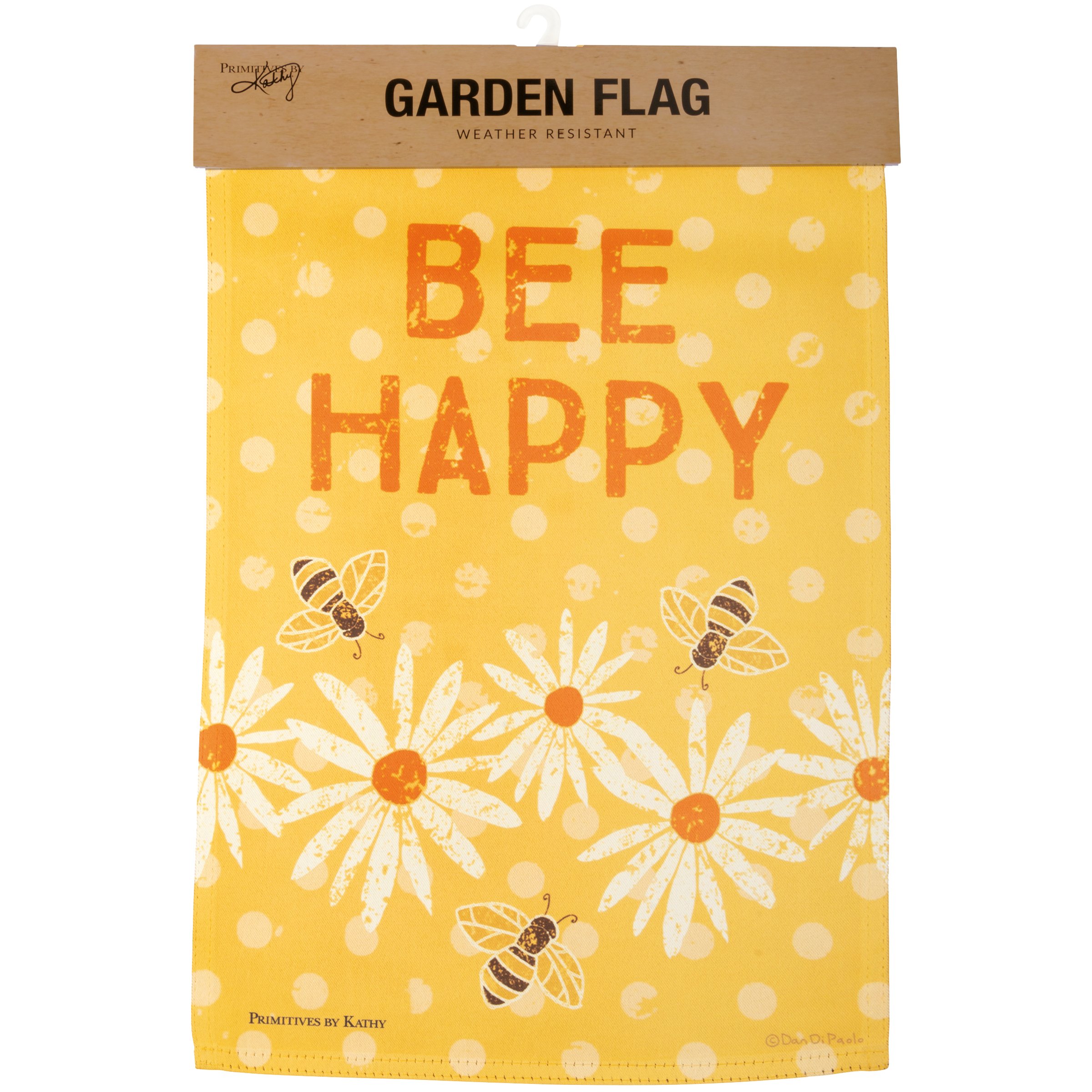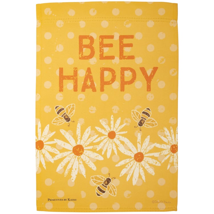 A double-sided polyester garden flag from our Garden Collection features a polka dot background design with bees and daisies and "Bee Happy" sentiment. Our garden Bee flag is weather-resistant and feature an opening to hang on our Garden Flag Pole. Hand-wash only.