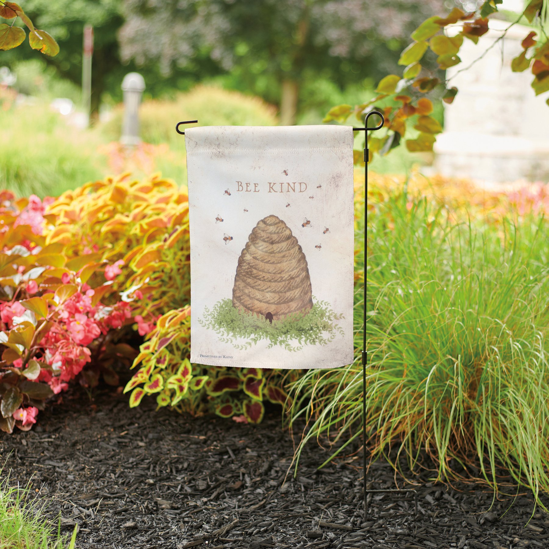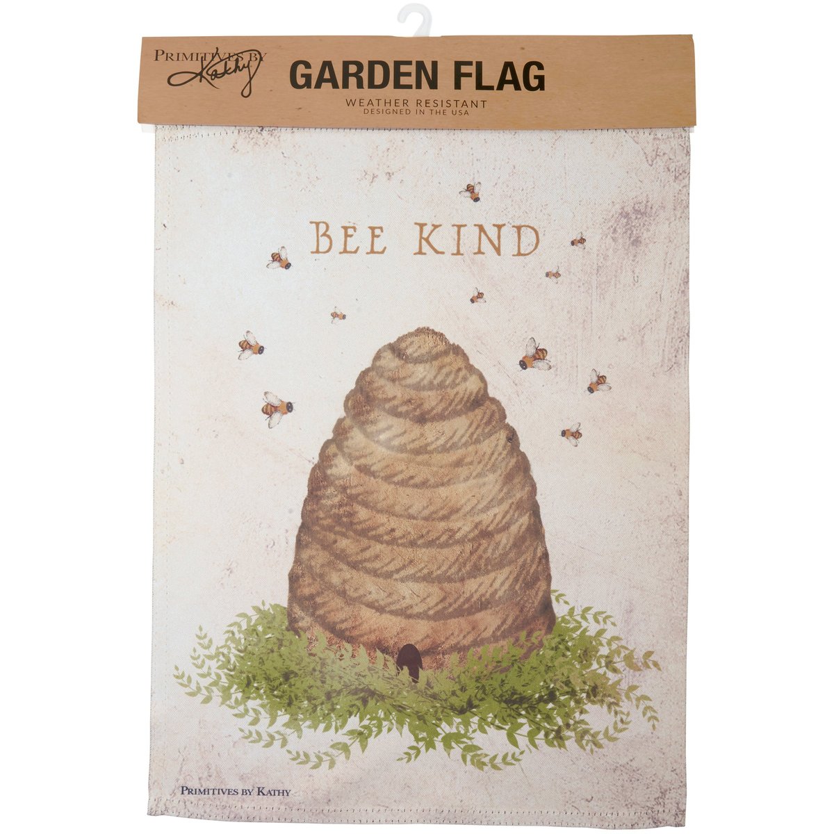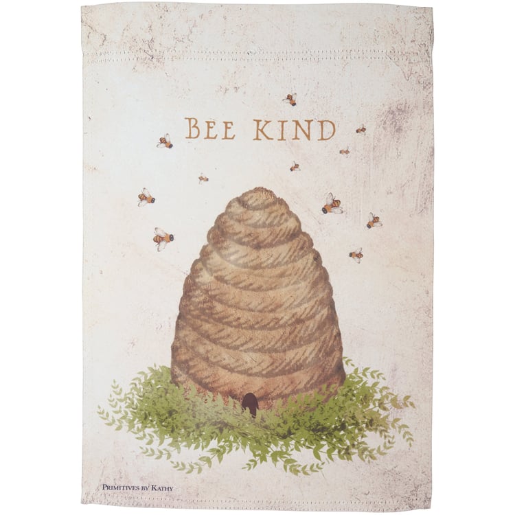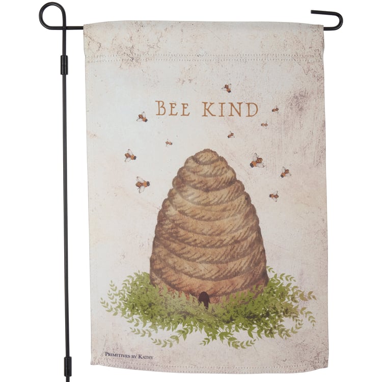 A double-sided polyester garden flag from our Garden Collection displaying a primitive inspired design of a beehive surrounded by greenery with "Bee Kind" sentiment. Flag is weather-resistant and features an opening to hang on ourĀ Garden Flag Pole. Hand-wash only. Our Bee Kind garden flag is packaged with a header card and hook to hang on rack.