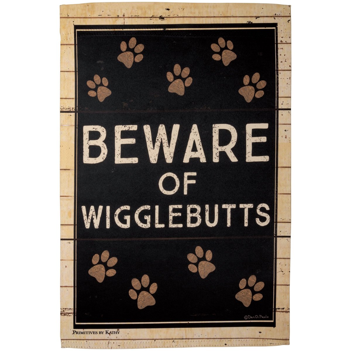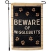 A double-sided polyester garden flag featuring a rustic design with paw print icons and "Beware Of Wigglebutts" sentiment. Garden flags are weather-resistant and feature an opening to hang on our Garden Flag Pole. Hand-wash only.