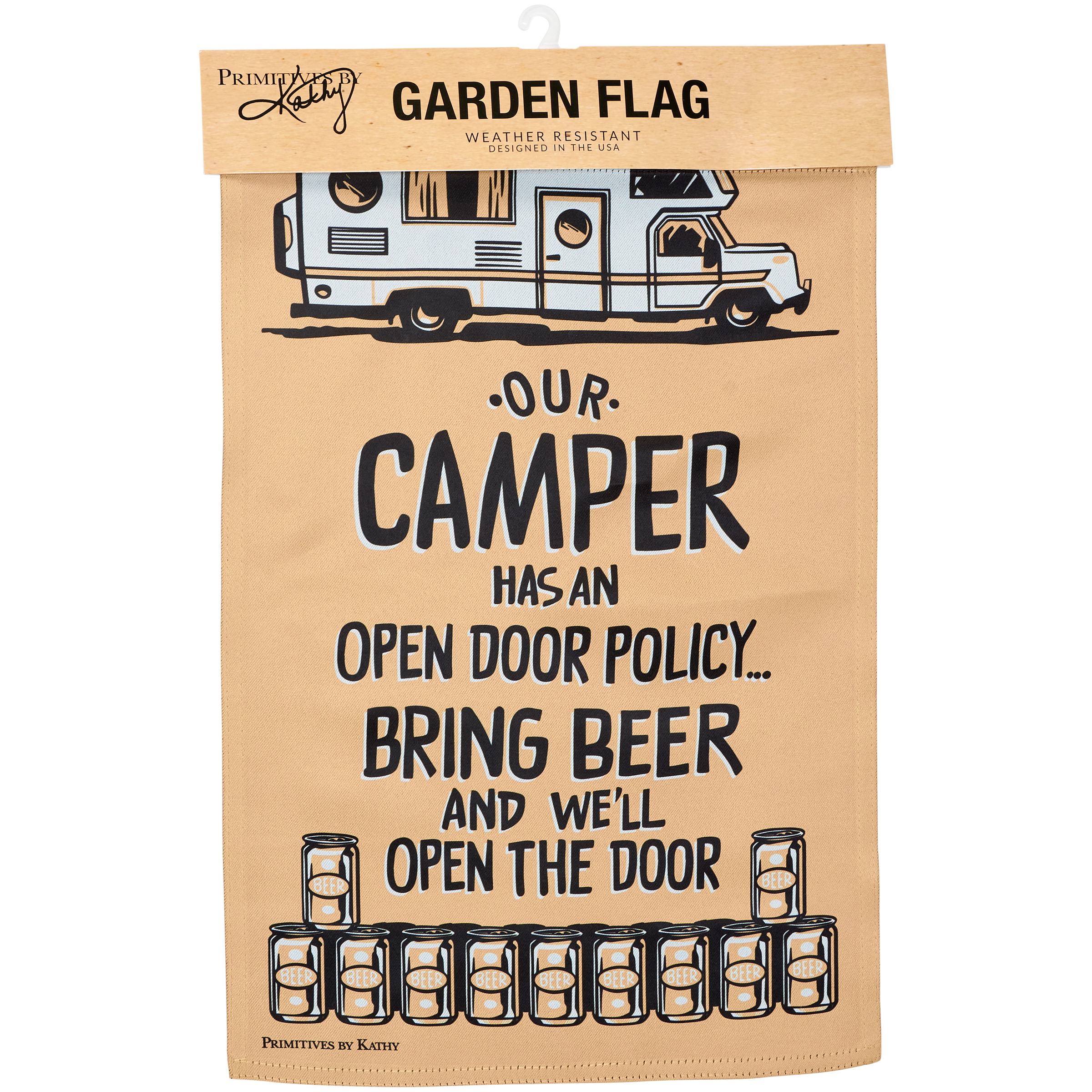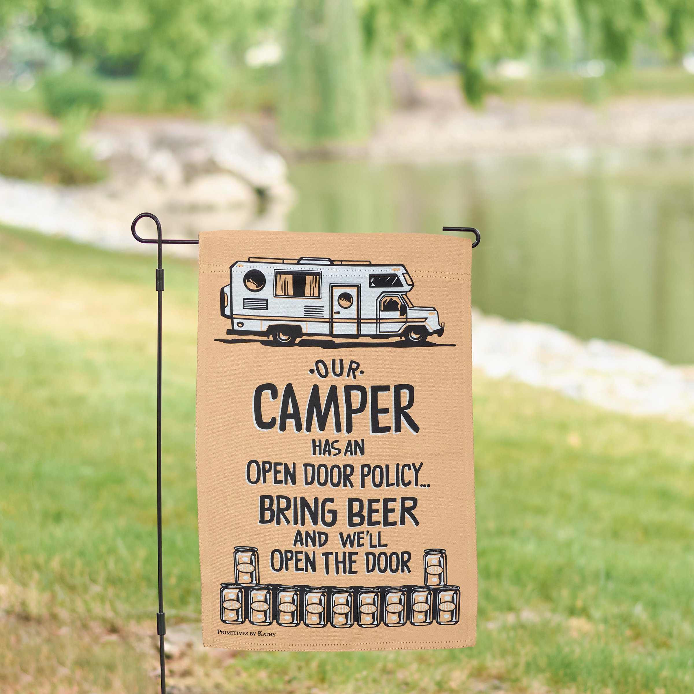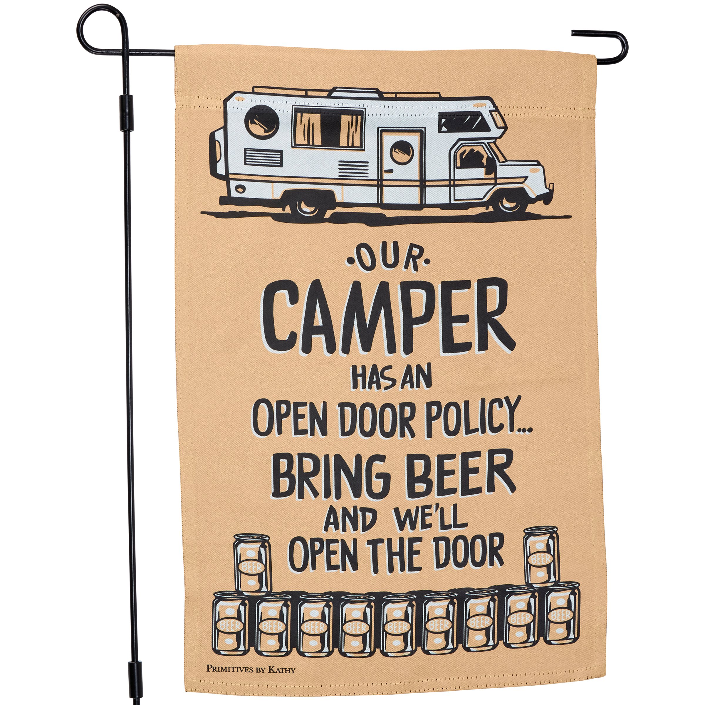 A double-sided polyester garden flag from our Lake & Cabin Collection displaying a hand illustrated design of a camper and stacked beer cans accenting a humorous camping-themed sentiment that reads "Our Camper Has An Open Door Policy... Bring Beer And We'll Open The Door." Garden flag is weather-resistant and features an opening to hang on our Garden Flag Pole. Our Bring Beer garden flag is packaged with a header card and hook to easily hang on rack. Hand wash only. A fun everyday home accent perfect for any yard or campsite.