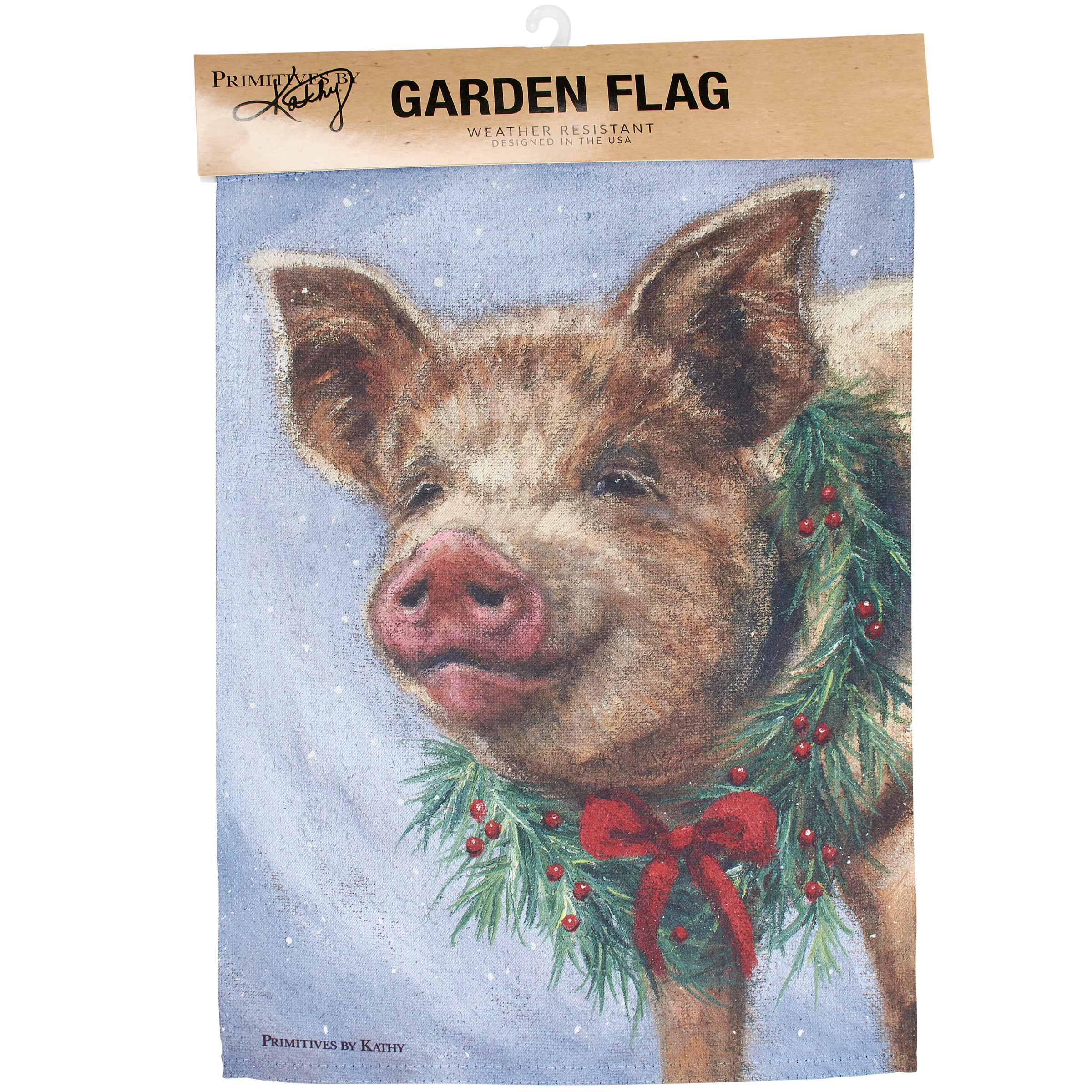 A double-sided polyester garden flag from our Christmas Collection displaying a charming hand painted design of a pig in a winter scene wearing a holiday wreath. Design is replicated from original artwork painted onto burlap canvas, giving the art a unique depth and texture. Flag is weather-resistant and features an opening to hang on ourĀ Garden Flag Pole. Hand-wash only. Our Christmas Pig garden flag is packaged with a header card and hook to easily hang on rack. A rustic seasonal home accent perfect for any yard or garden.