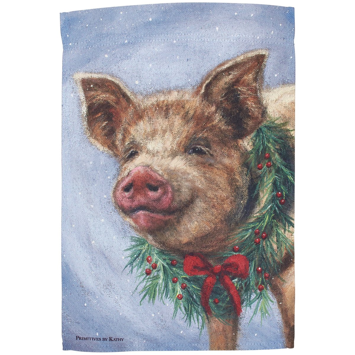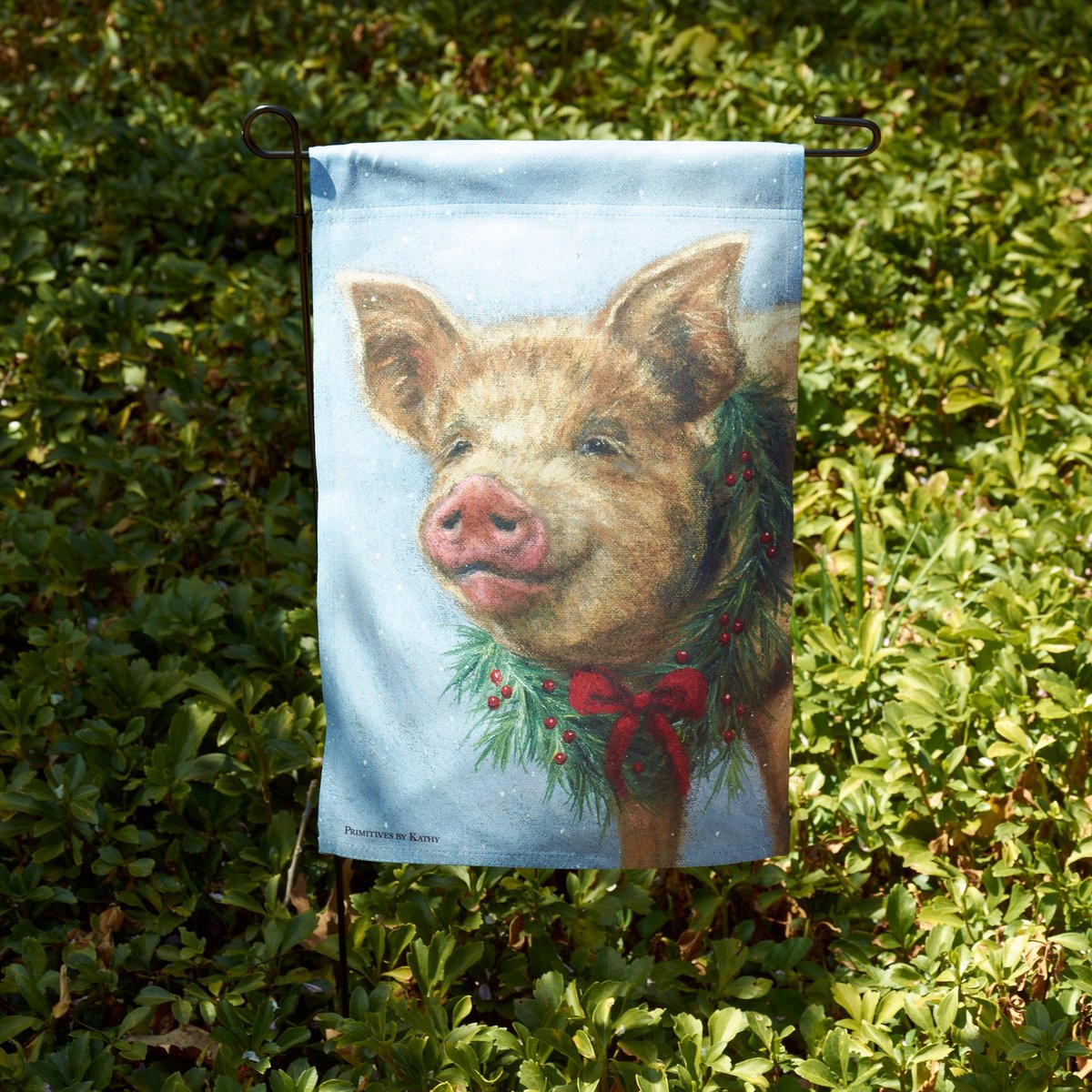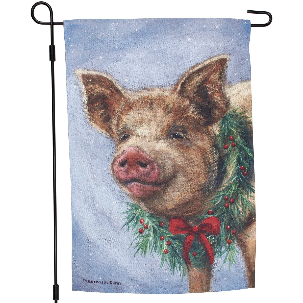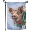 A double-sided polyester garden flag from our Christmas Collection displaying a charming hand painted design of a pig in a winter scene wearing a holiday wreath. Design is replicated from original artwork painted onto burlap canvas, giving the art a unique depth and texture. Flag is weather-resistant and features an opening to hang on ourĀ Garden Flag Pole. Hand-wash only. Our Christmas Pig garden flag is packaged with a header card and hook to easily hang on rack. A rustic seasonal home accent perfect for any yard or garden.