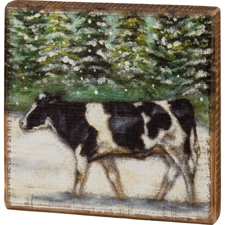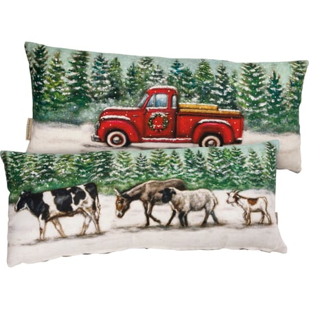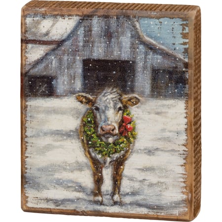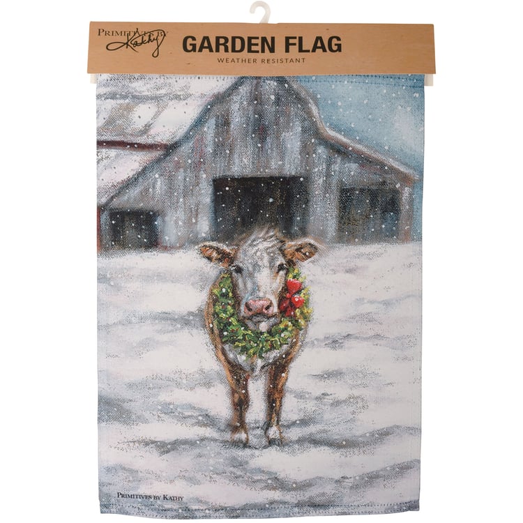 A double-sided polyester garden flag from our Christmas Collection depicting a snowy design featuring a cow with a wreath in front of a barn. Design is replicated from original artwork painted onto burlap canvas, giving the art a unique depth and texture. Garden flags are weather-resistant and feature an opening to hang on our Garden Flag Pole. Hand-wash only.