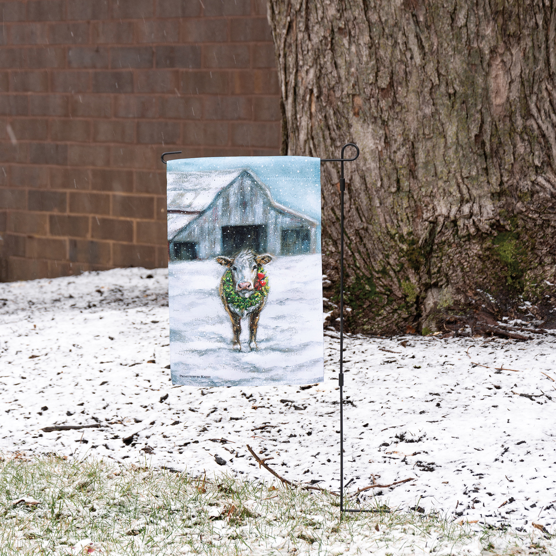 A double-sided polyester garden flag from our Christmas Collection depicting a snowy design featuring a cow with a wreath in front of a barn. Design is replicated from original artwork painted onto burlap canvas, giving the art a unique depth and texture. Garden flags are weather-resistant and feature an opening to hang on our Garden Flag Pole. Hand-wash only.