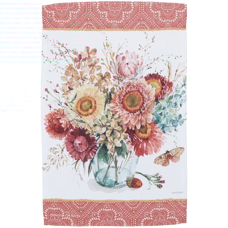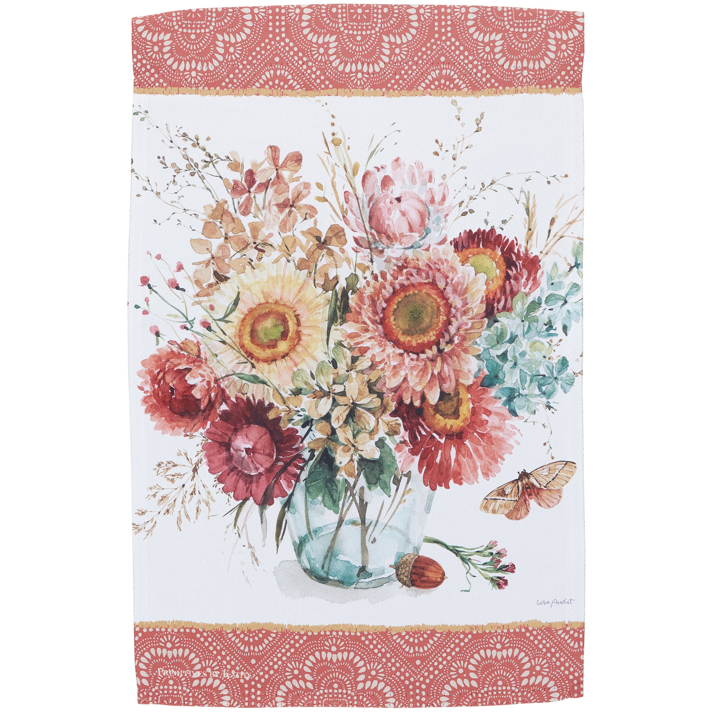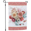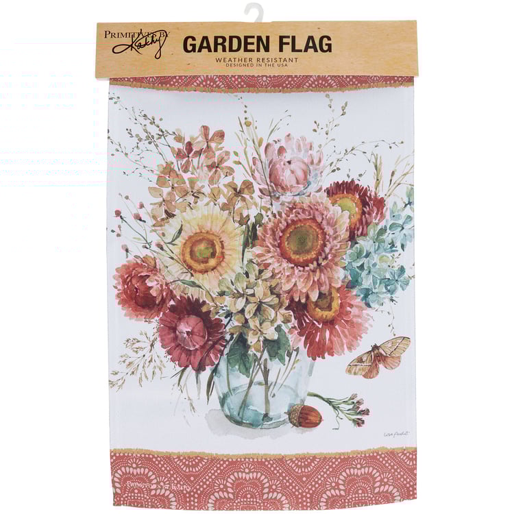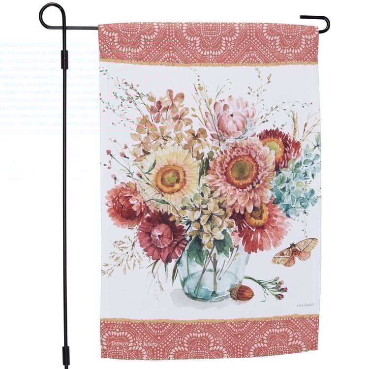 A double-sided polyester garden flag from our Fall & Harvest Collection displaying a vase full of fall florals. Design also features coordinating fall inspired patterns at the top and bottom. Flag design is replicated from original art hand painted in a delicate watercolor style. Seasonal garden flag is weather-resistant and features an opening to hang on our Garden Flag Pole. Our Fall Floral Vase garden flag is packaged with a header card and hook to easily hang on rack. Hand wash only. A charming fall-themed home accent perfect for seasonal display in any yard or garden.