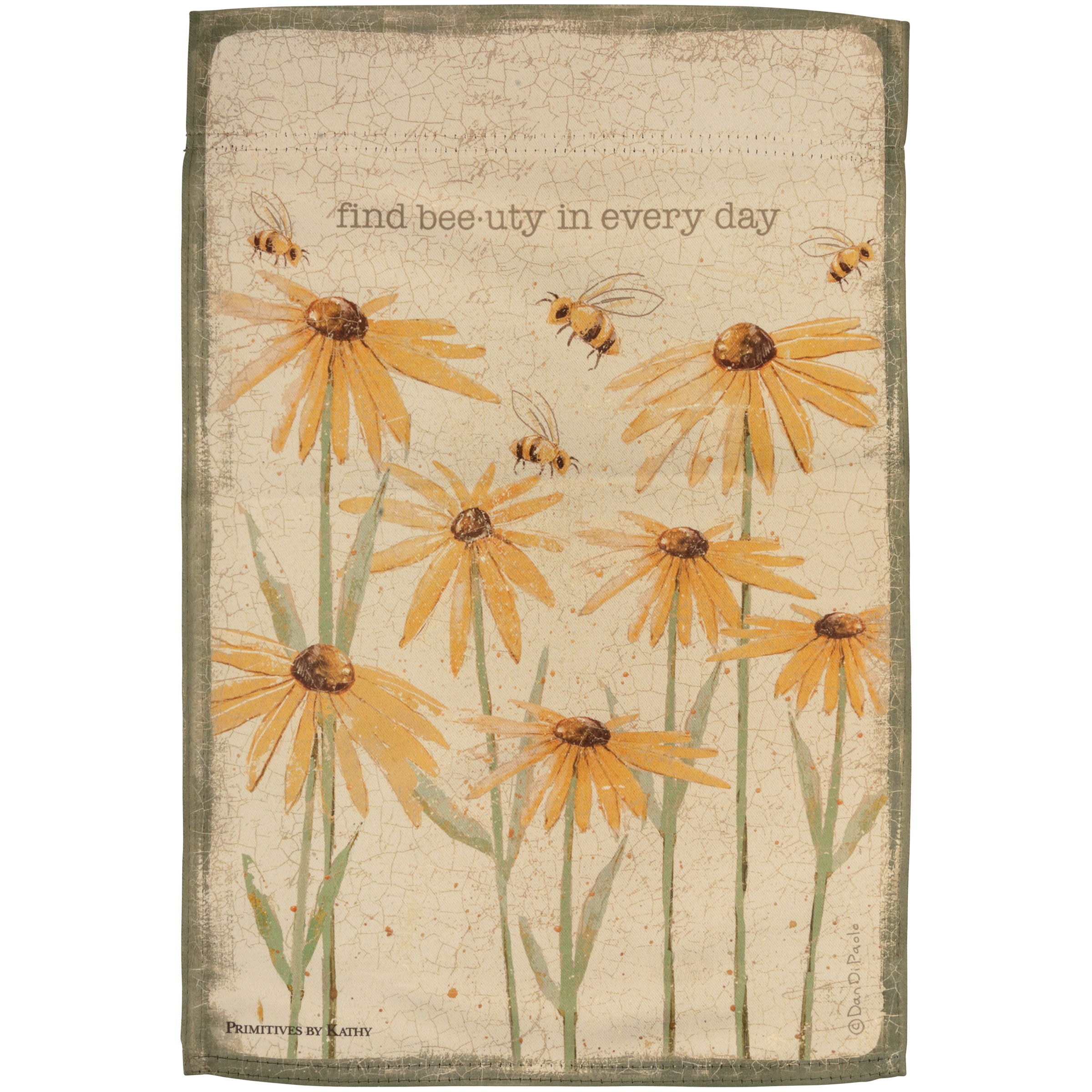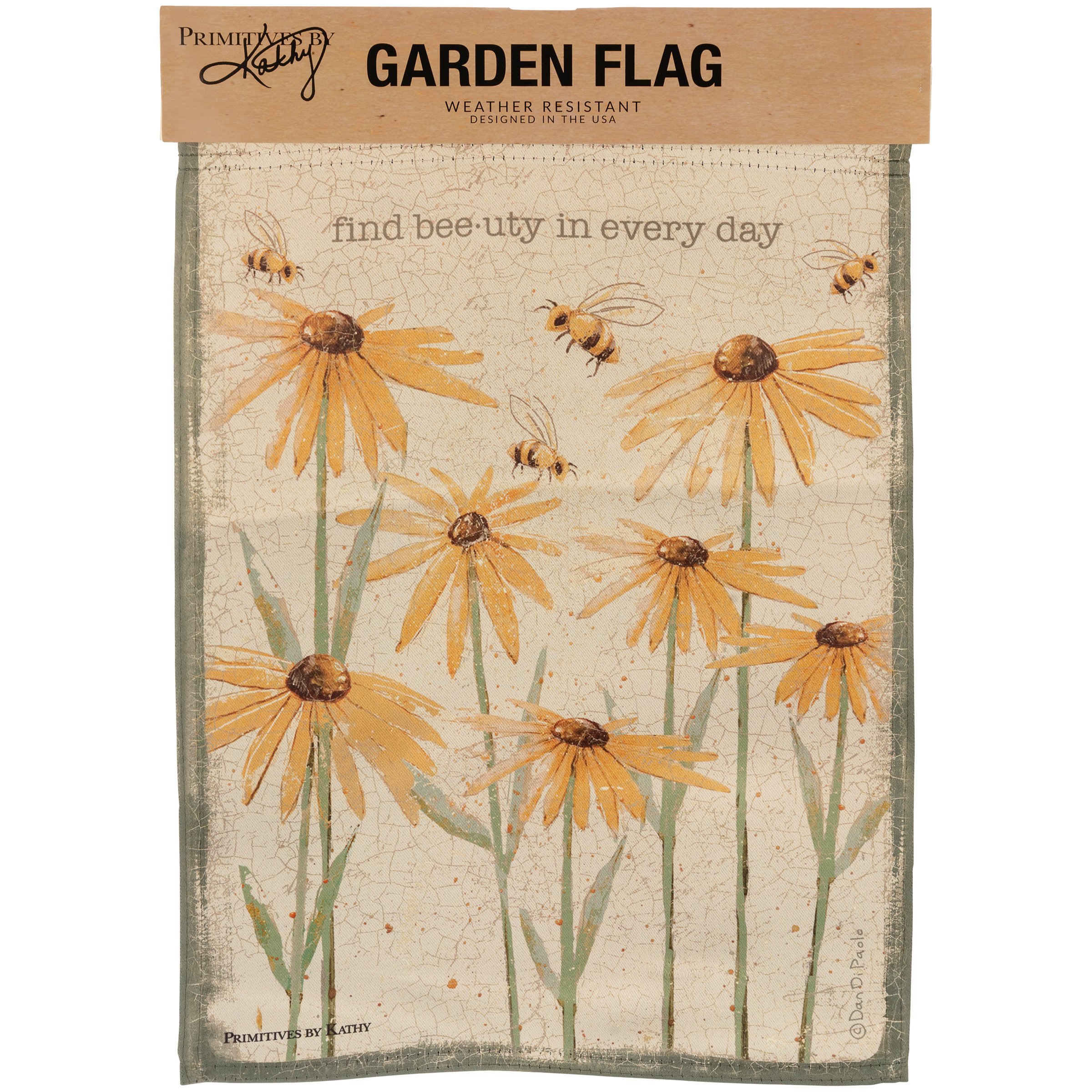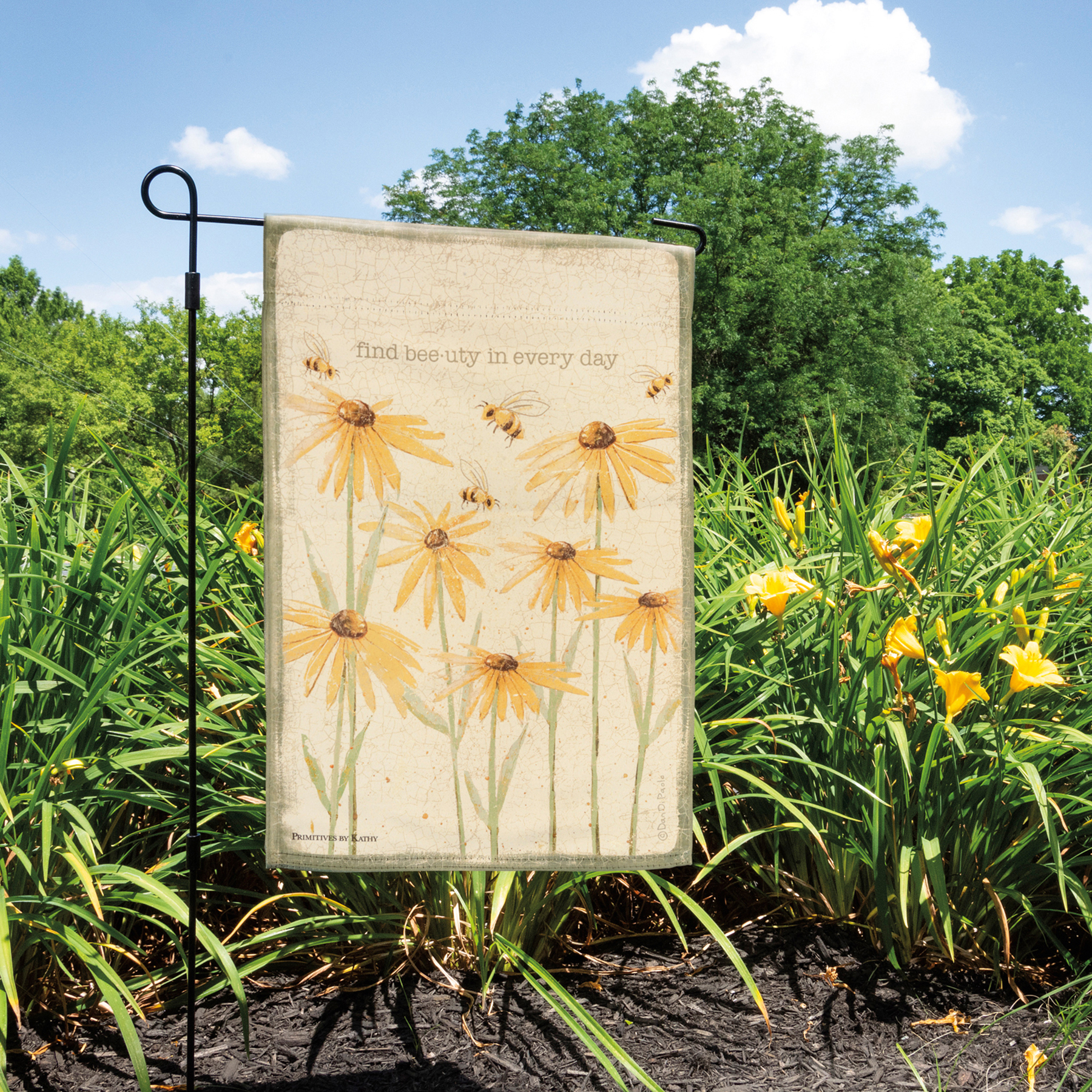 A double-sided polyester garden flag from our Garden Collection featuring rustic bee and coneflower designs with "Find Beeuty In Every Day" sentiment. Our Find Beeuty garden flag is weather-resistant and features an opening to hang on a garden flag pole. Hand-wash only.
