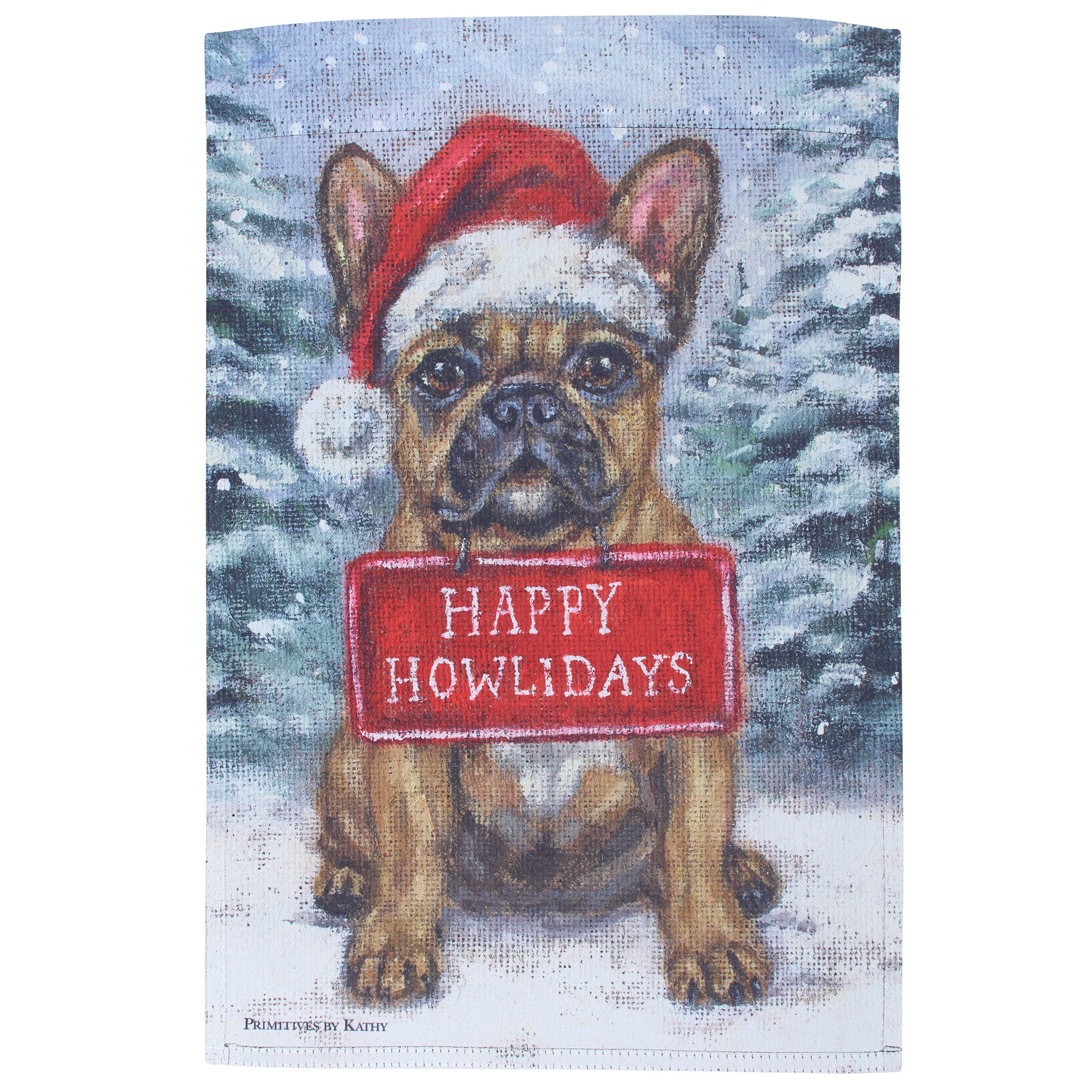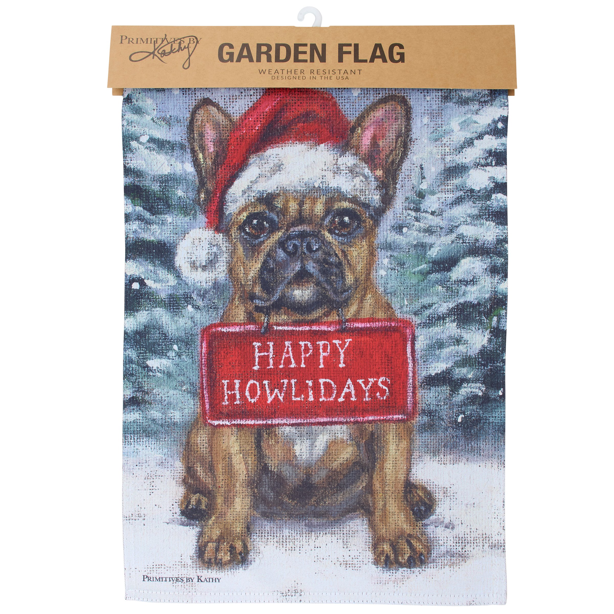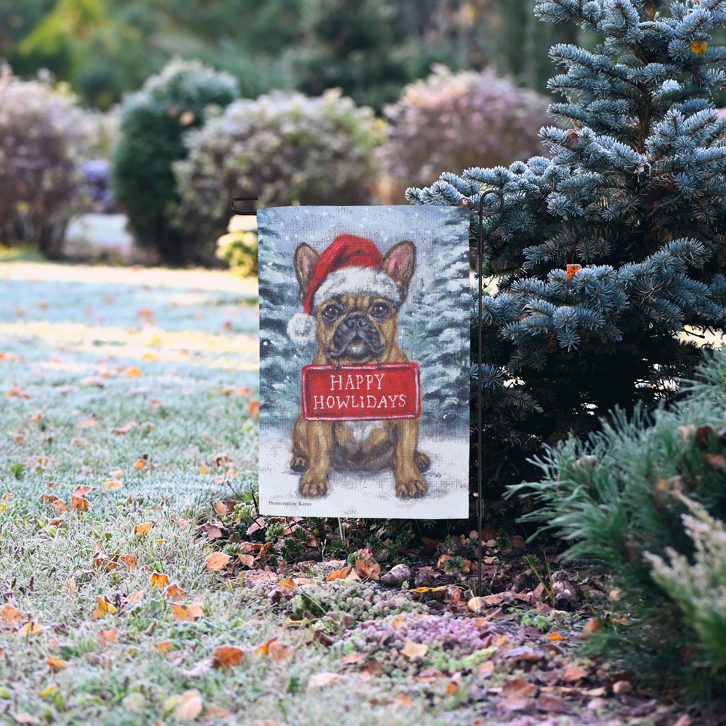 A polyester garden flag from our Holiday Pet Collection featuring a double-sided design displaying a charming winter scene of a Frenchie dog wearing a Santa hat and holding a sign that reads "Happy Howlidays" for a fun combination of a love for Christmas and pets. Christmas Frenchie design is replicated from original artwork painted onto burlap canvas, giving the art a unique depth and texture. Seasonal garden flag is weather-resistant and features an opening to hang on our Garden Flag Pole. Hand-wash only. Our Frenchie Happy Howlidays garden flag is packaged with a header card and hook to easily hang on rack for store display. A fun dog themed home accent perfect for seasonal display in any yard or garden.
