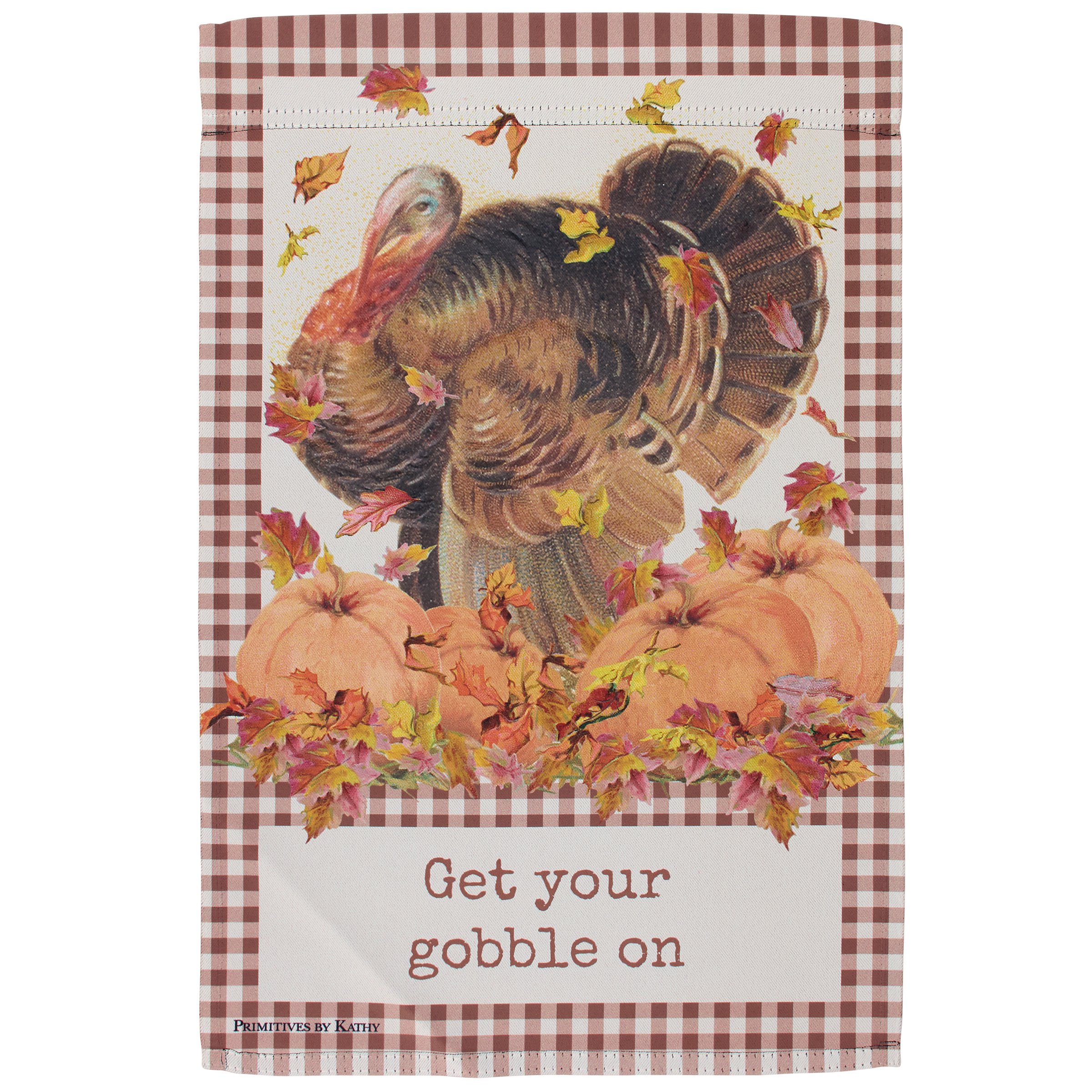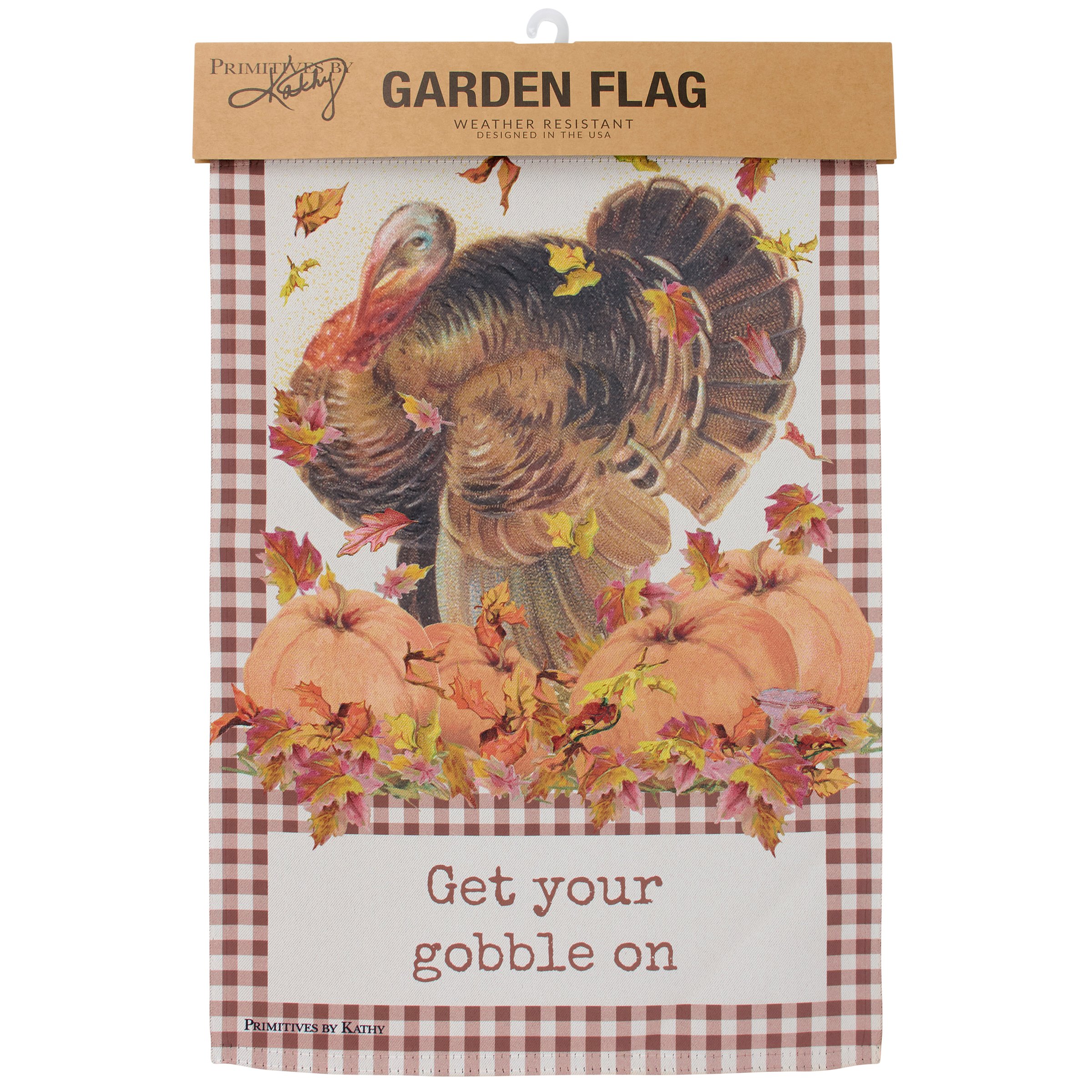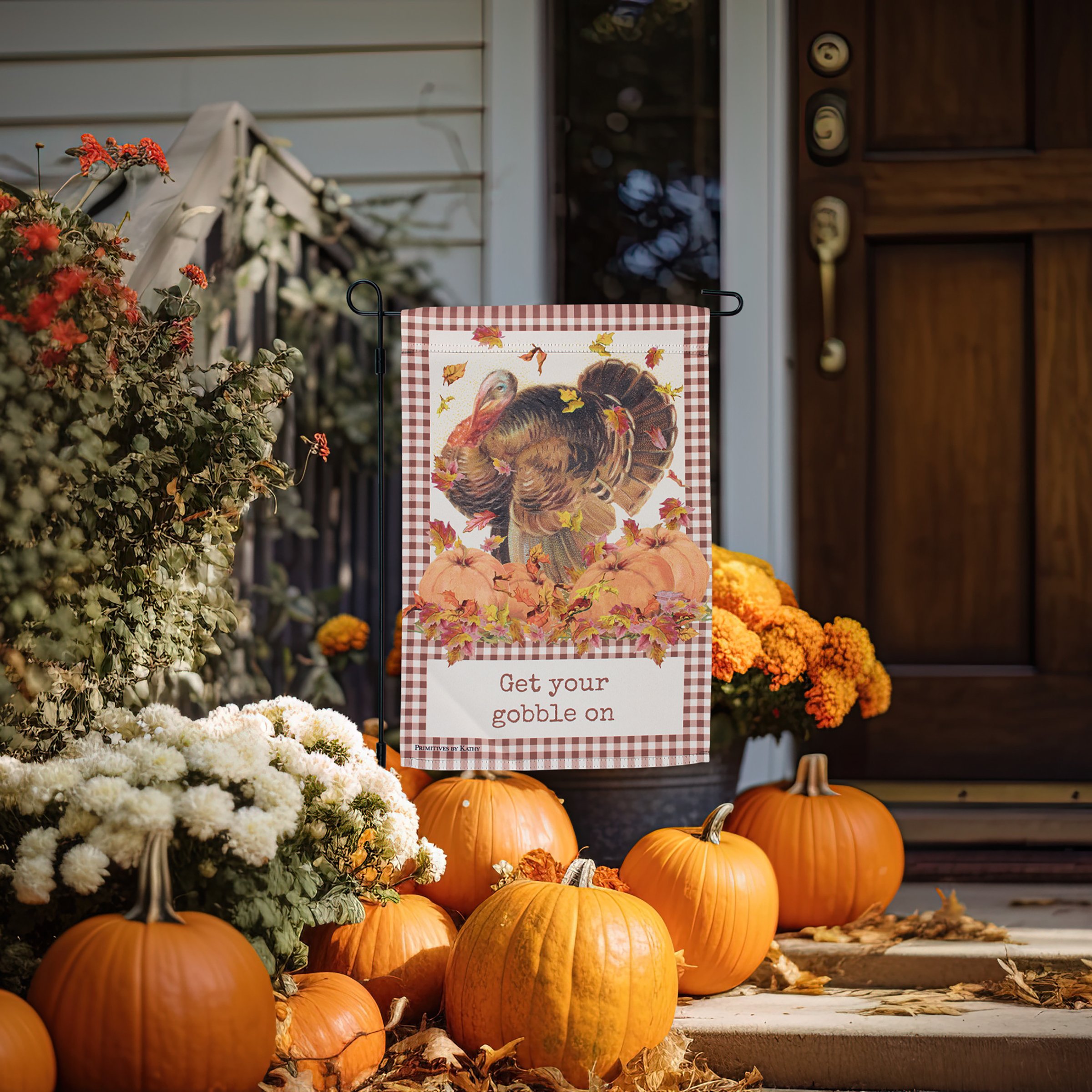 A polyester garden flag from our Fall & Harvest Collection featuring a double-sided design displaying vintage art of a turkey with a brown gingham border and a fun turkey pun that reads "Get Your Gobble On." Seasonal garden flag is weather-resistant and features an opening to hang on our Garden Flag Pole. Hand-wash only. Our Get Your Gobble On garden flag is packaged with a header card and hook to easily hang on rack for store display. A fun fall home accent perfect for seasonal display in any yard or garden.