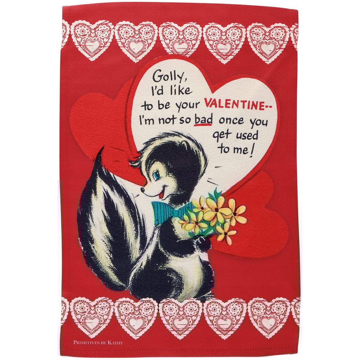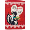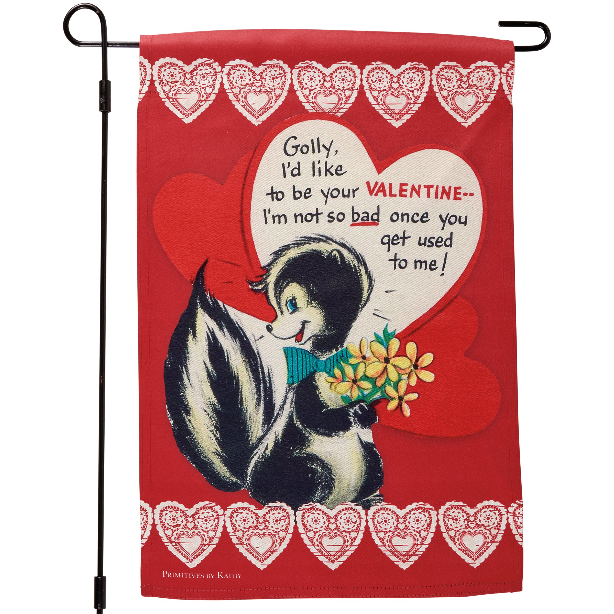A double-sided polyester garden flag from our Valentine's Day Collection displaying a fun vintage inspired Valentine's Day design of a skunk holding flowers with sentiment that reads "Golly, I'd Like To Be Your Valentine... I'm Not So Bad Once You Get Used To Me." Garden flag is weather-resistant and features an opening to hang on our Garden Flag Pole. Our Golly garden flag is packaged with a header card and hook to easily hang on rack. Hand wash only. A fun seasonal home accent perfect for any yard or garden.