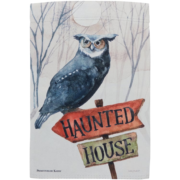 A double-sided polyester garden flag from our Halloween Collection displaying a charming Halloween scene of an owl perched on a haunted house sign. Halloween design is replicated from original art hand painted in a delicate watercolor style. Seasonal garden flag is weather-resistant and features an opening to hang on our Garden Flag Pole. Our Haunted House garden flag is packaged with a header card and hook to easily hang on rack for store display. Hand wash only. A rustic Halloween home accent perfect for seasonal display in any yard or garden.