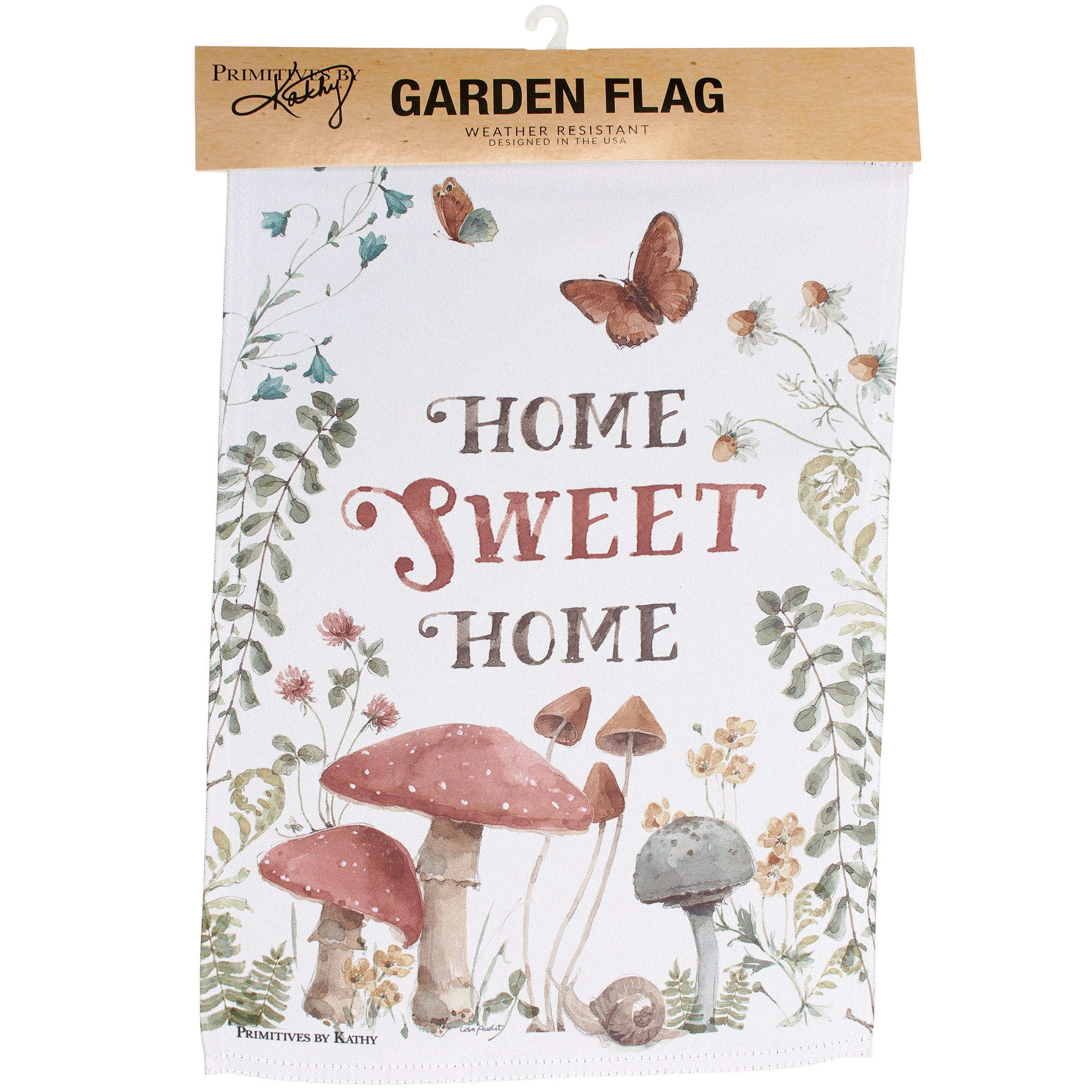 A double-sided polyester garden flag from our Cottagecore Collection displaying a hand painted design of mushrooms, wildflowers, butterflies, and snails in a delicate watercolor style surrounding a comforting sentiment that reads "Home Sweet Home." Flag is weather-resistant and features an opening to hang on ourĀ Garden Flag Pole. Hand-wash only. Our Home Sweet Home garden flag is packaged with a header card and hook to easily hang on rack. A rustic everyday home accent perfect for any yard or garden.