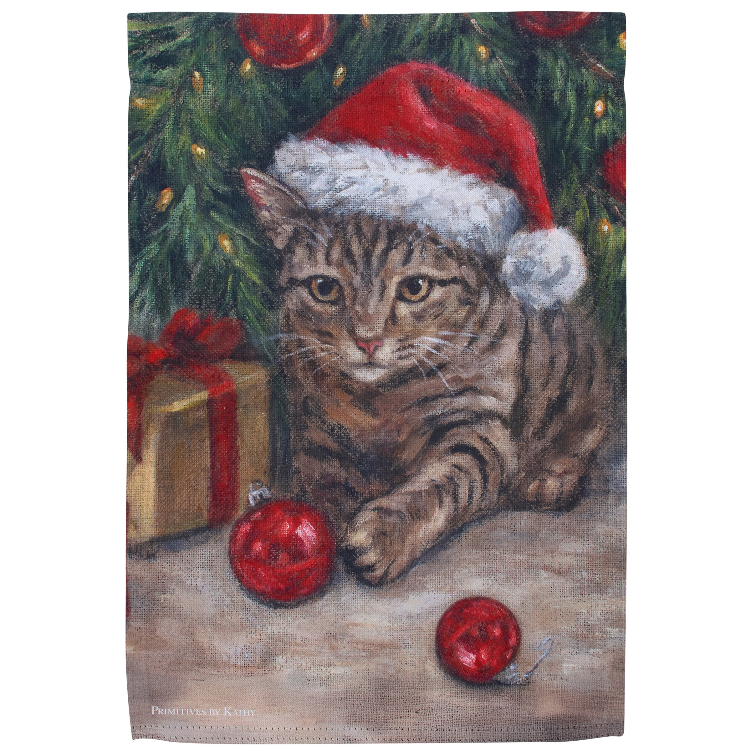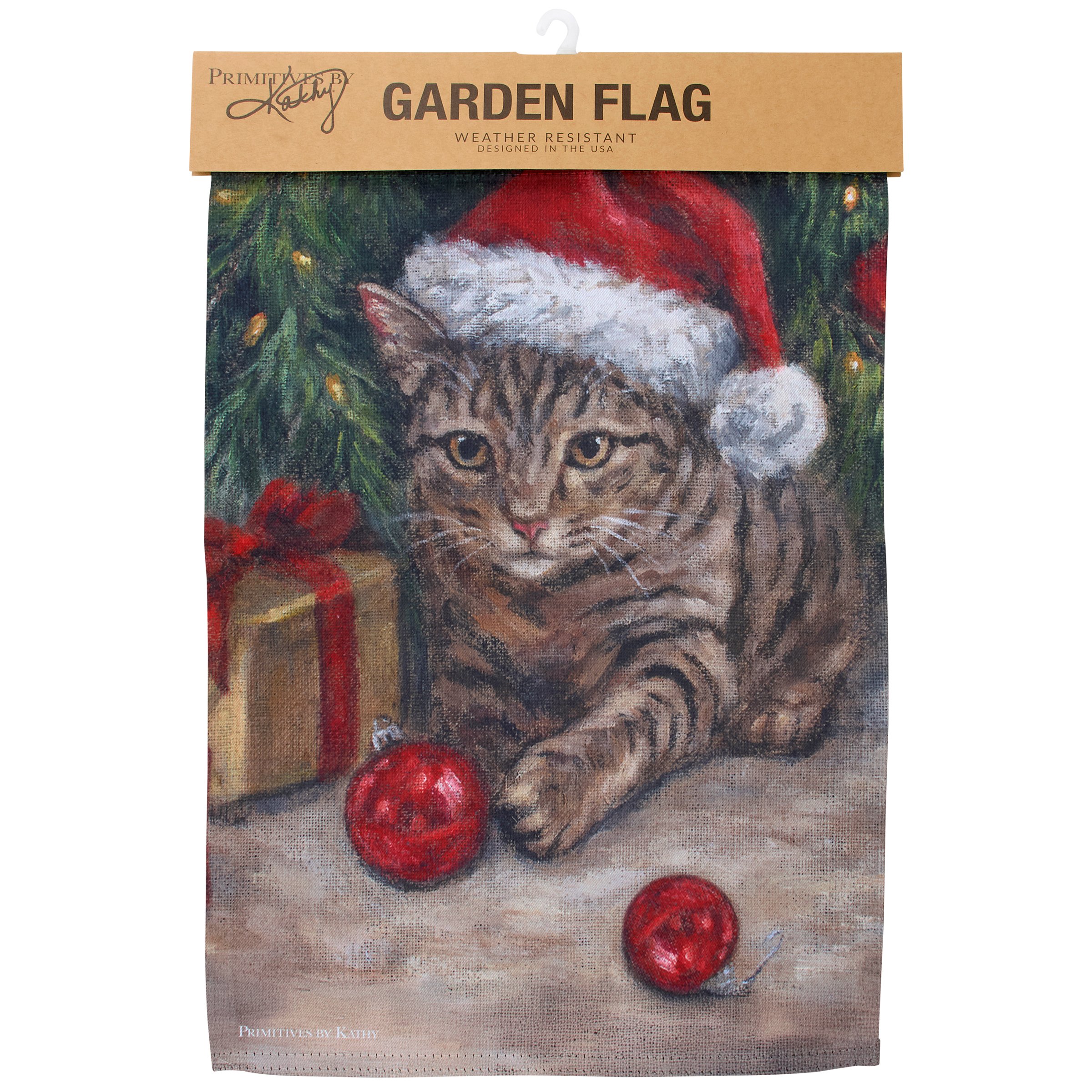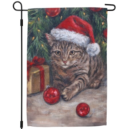 A polyester garden flag from our Holiday Pet Collection featuring a double-sided design displaying a charming scene of a kitty wearing a Santa hat under a Christmas tree getting into mischief by knocking down ornaments for a fun combination of a love for Christmas and pets. Christmas kitty design is replicated from original artwork painted onto burlap canvas, giving the art a unique depth and texture. Seasonal garden flag is weather-resistant and features an opening to hang on our Garden Flag Pole. Hand-wash only. Our Kitty Mischief garden flag is packaged with a header card and hook to easily hang on rack for store display. A fun cat themed home accent perfect for seasonal display in any yard or garden.