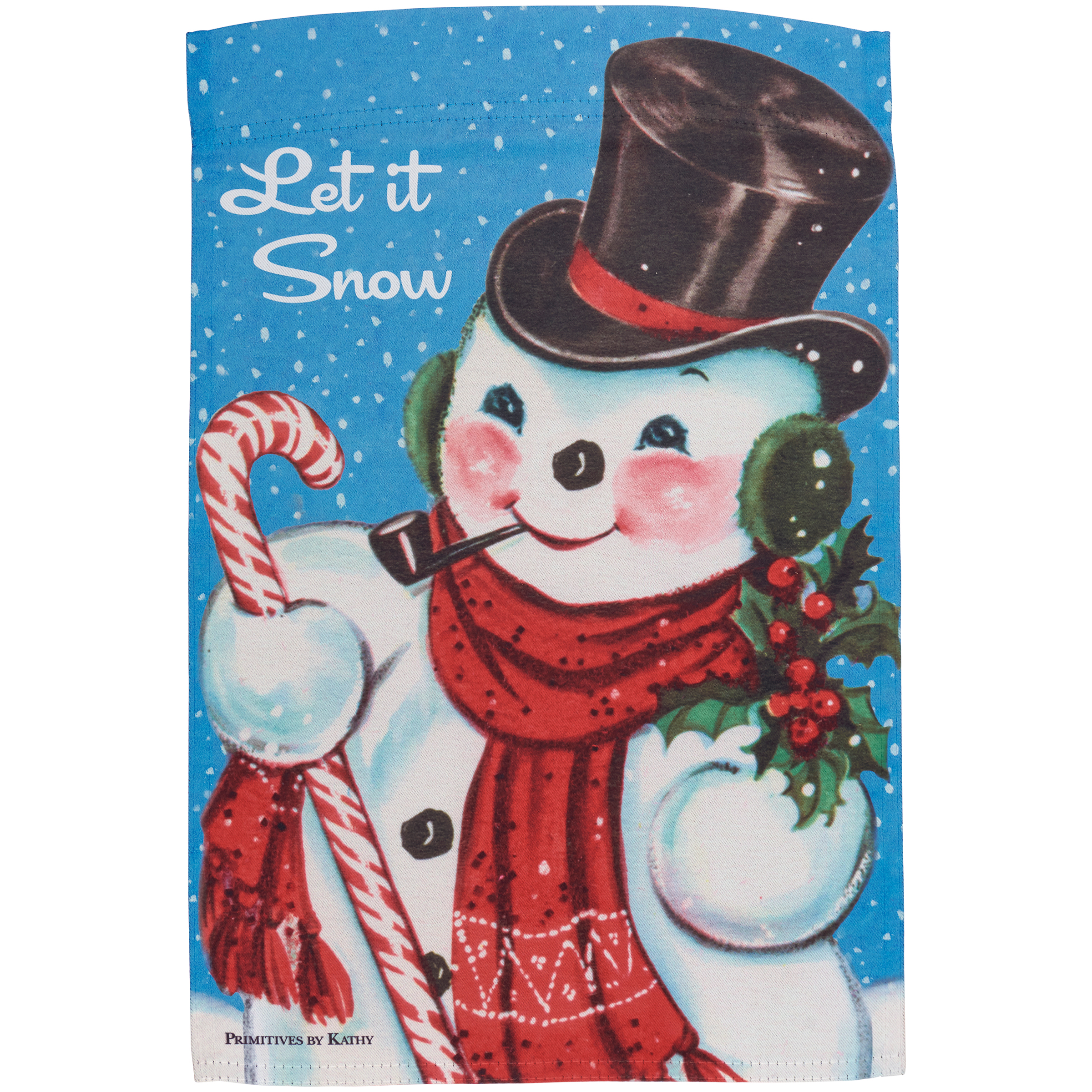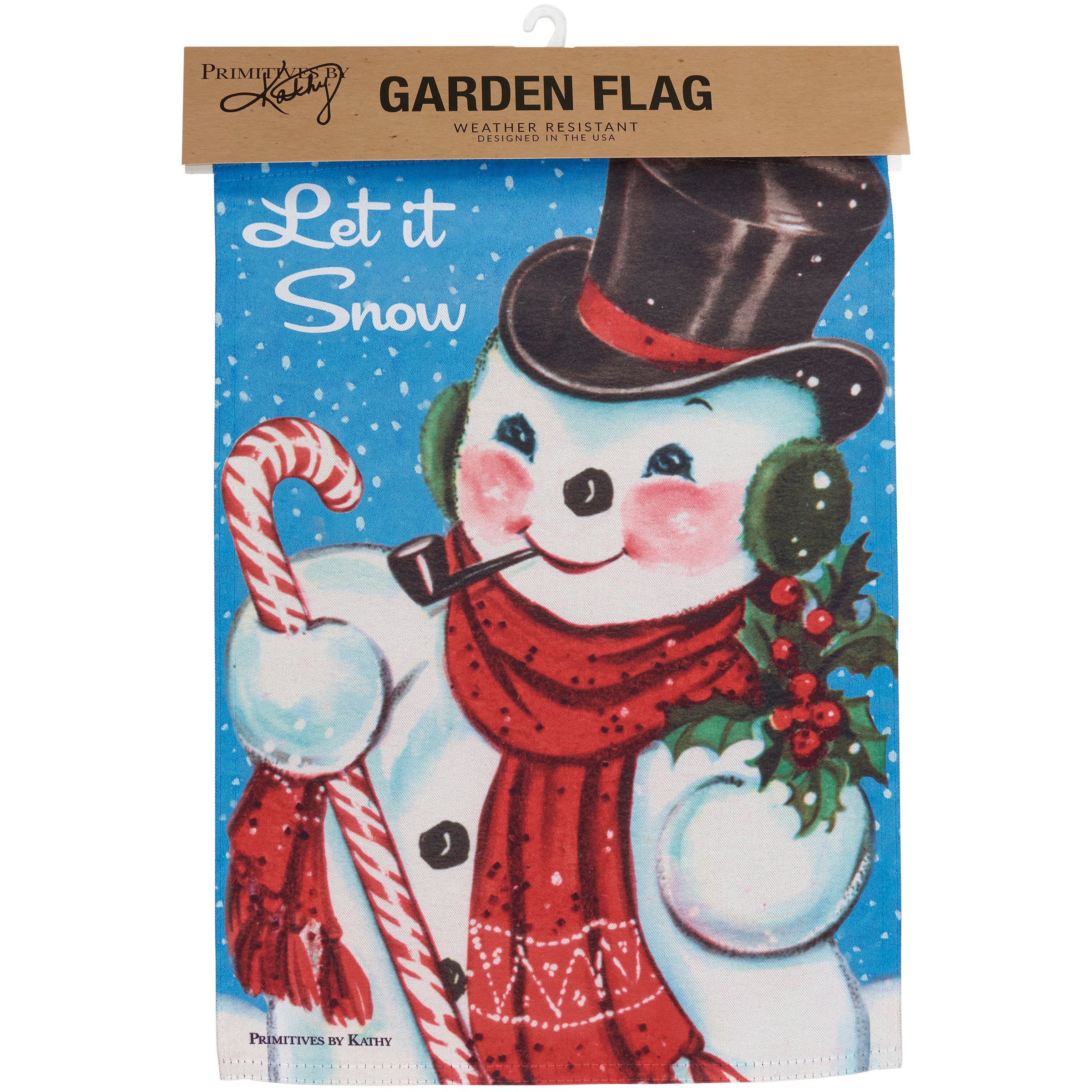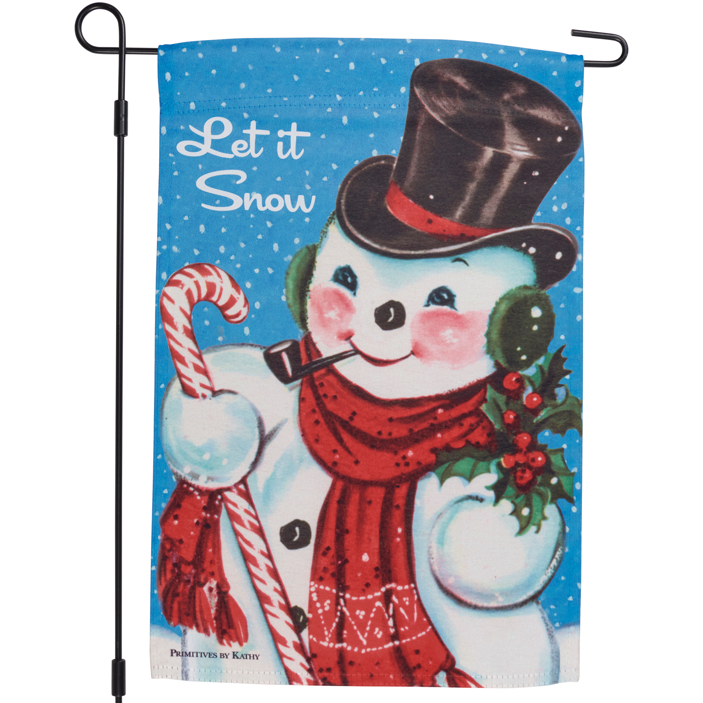 A double-sided polyester garden flag from our Christmas Collection displaying vintage art of a jolly snowman with "Let It Snow" sentiment. Flag is weather-resistant and features an opening to hang on our Garden Flag Pole. Hand-wash only. Our Let It Snow garden flag is packaged with a header card and hook to easily hang on rack. A fun seasonal home accent perfect for any yard or garden.
