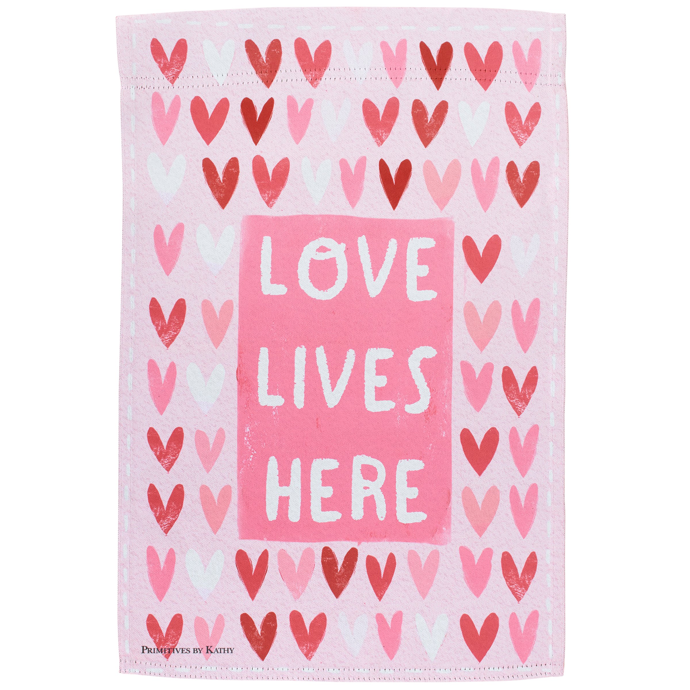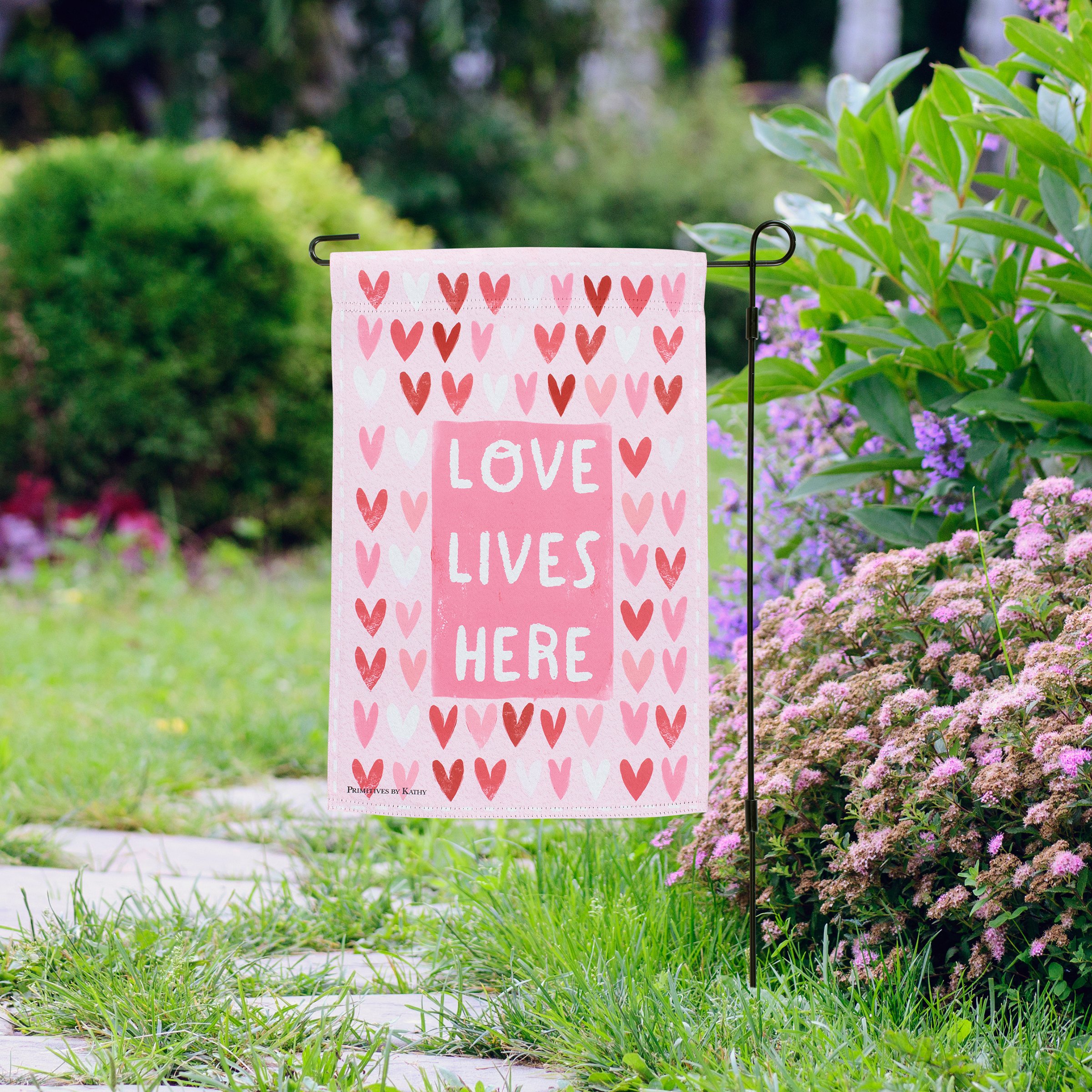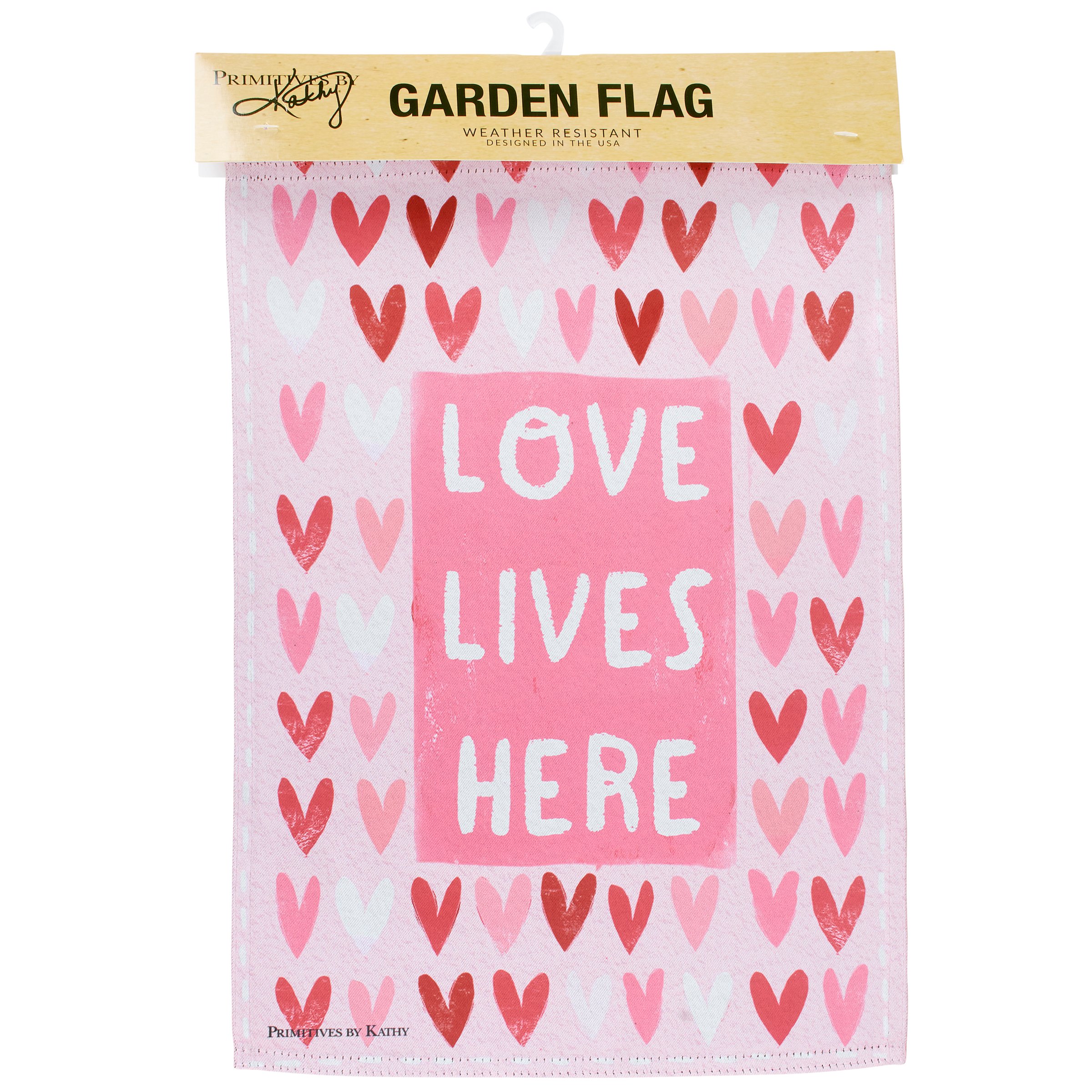 A double-sided polyester garden flag from our Valentine's Day Collection displaying red, white and pink love hearts around a heartwarming love-themed sentiment that reads "Love Lives Here." Hearts design and sentiment is replicated from original hand illustrated artwork. Seasonal garden flag is weather-resistant and features an opening to hang on our Garden Flag Pole. Hand wash only. Our Love Lives Here garden flag is packaged with a header card and hook to easily hang on rack for store display. An inspirational Valentine's Day home accent perfect for seasonal display in any yard or garden.