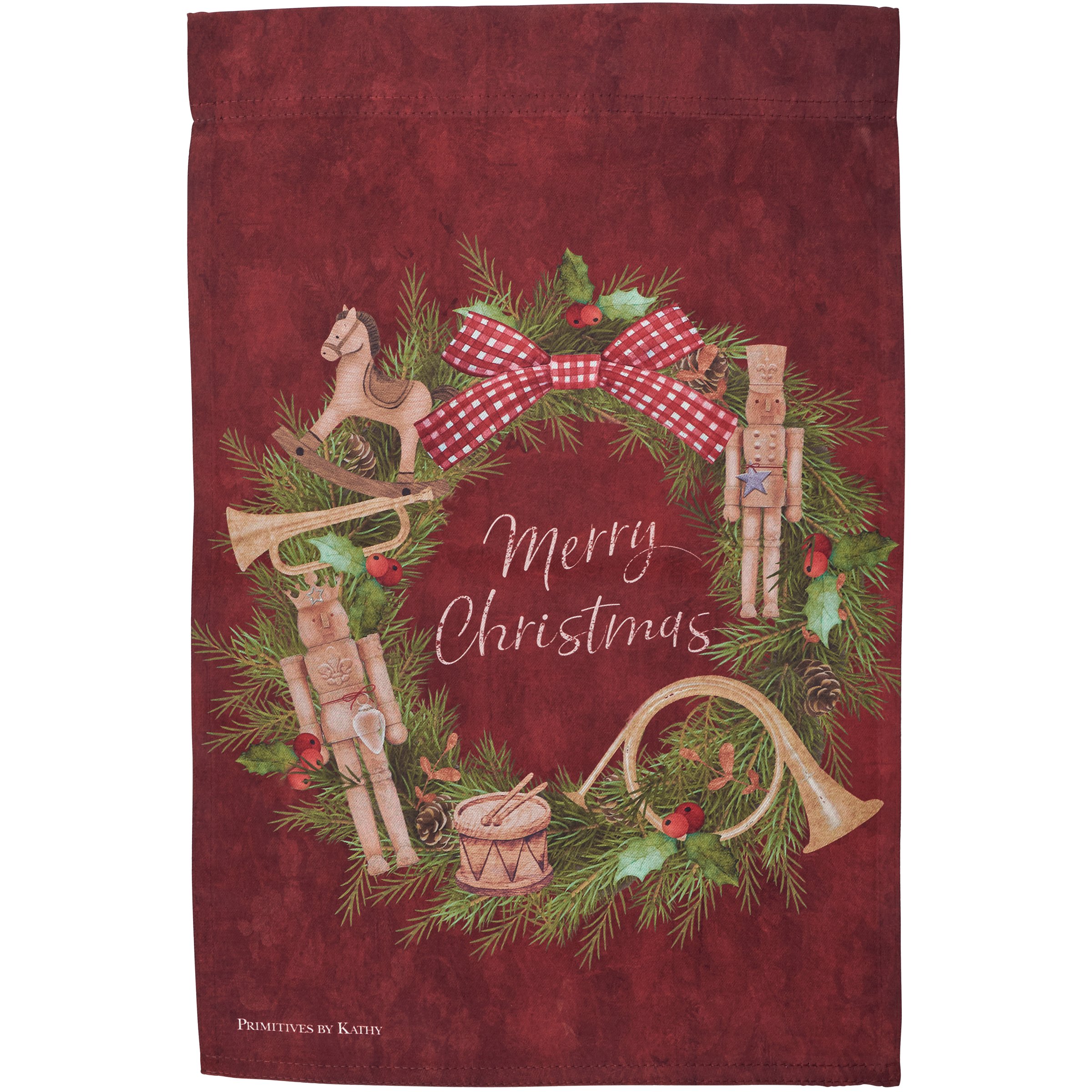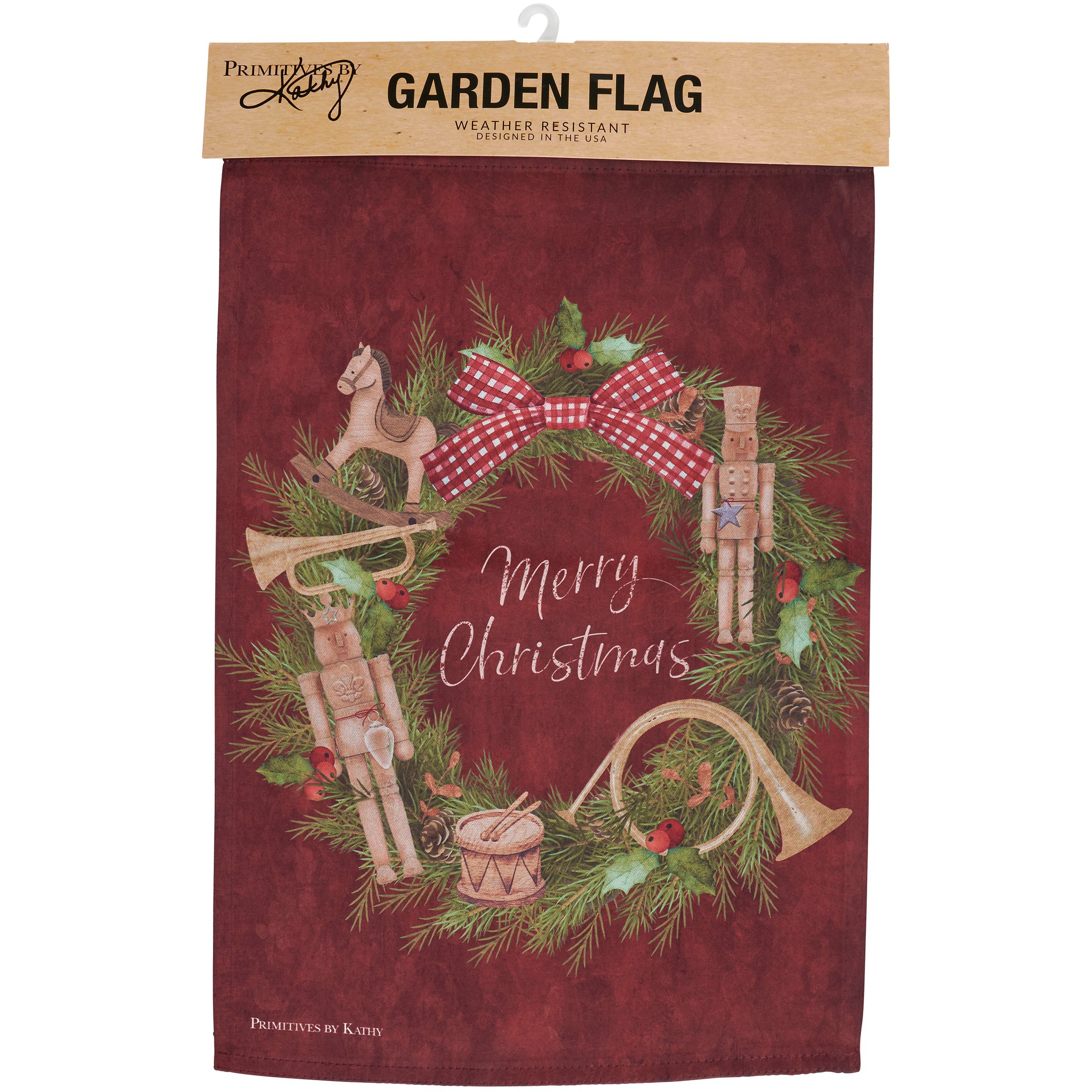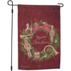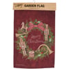 A double-sided polyester garden flag from our Christmas Collection displaying a rustic design of a Christmas wreath with nutcrackers and a seasonal sentiment in the center that reads "Merry Christmas." Seasonal garden flag is weather-resistant and features an opening to hang on our Garden Flag Pole. Our Nutcracker Wreath garden flag is packaged with a header card and hook to easily hang on rack. Hand wash only. A rustic Christmas-themed home accent perfect for seasonal display in any yard or garden.