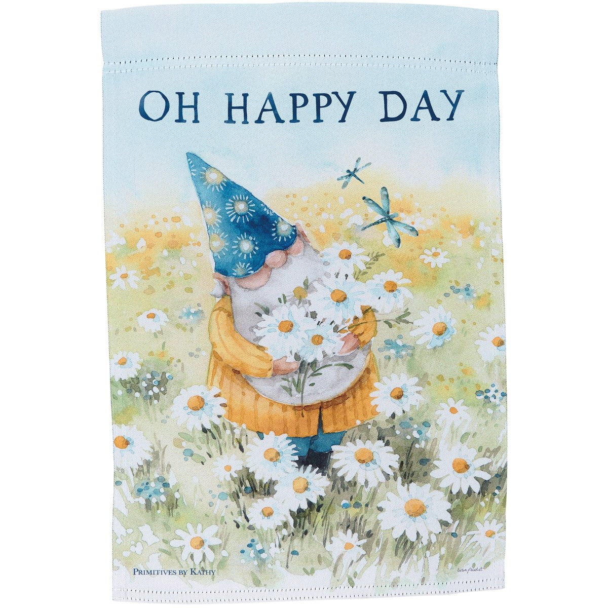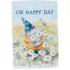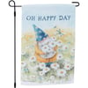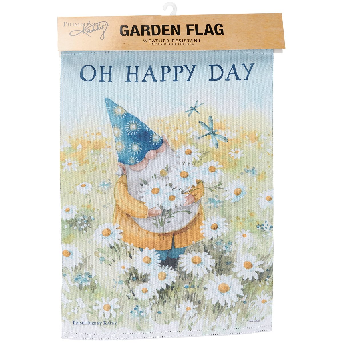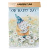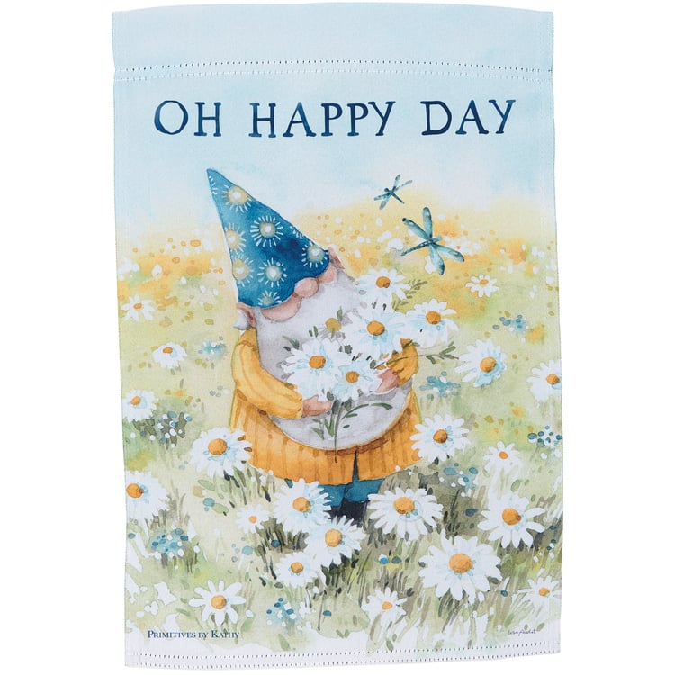 A double-sided polyester garden flag from our Garden Collection displaying a cheerful gnome gathering daisies while looking at blue dragonflies with an inspirational sentiment that reads "Oh Happy Day." Design is replicated from original art hand painted in a delicate watercolor style. Garden flag is weather-resistant and features an opening to hang on our Garden Flag Pole. Our Oh Happy Day garden flag is packaged with a header card and hook to easily hang on rack. Hand wash only. A daisy-themed everyday home accent perfect for any yard or garden.