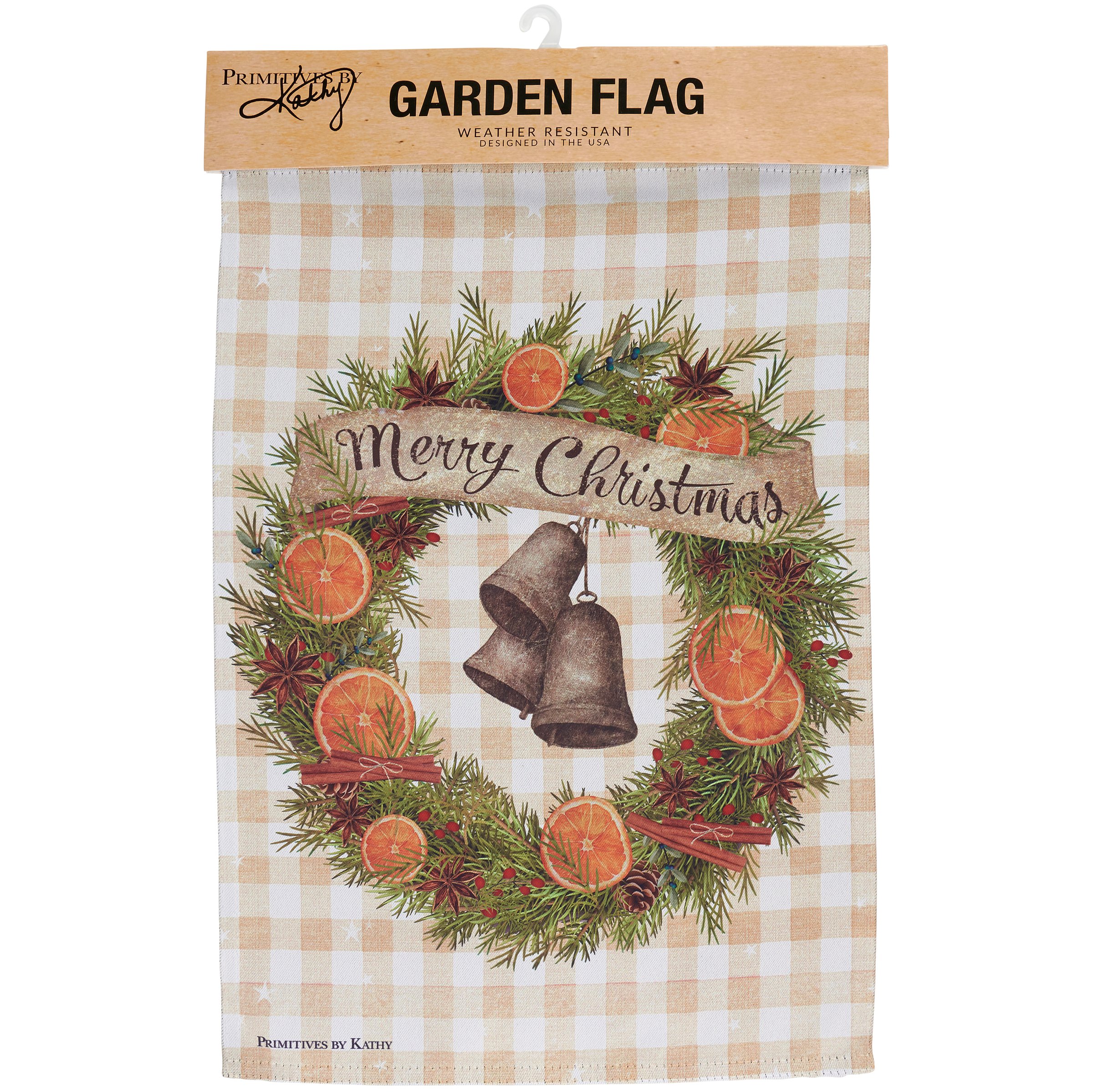 A double-sided polyester garden flag from our Christmas Collection displaying a rustic design of a Christmas wreath with orange slices and cinnamon sticks in the wreath. Design also features a seasonal sentiment that reads "Merry Christmas." Seasonal garden flag is weather-resistant and features an opening to hang on our Garden Flag Pole. Our Orange Wreath garden flag is packaged with a header card and hook to easily hang on rack. Hand wash only. A rustic Christmas-themed home accent perfect for seasonal display in any yard or garden.