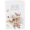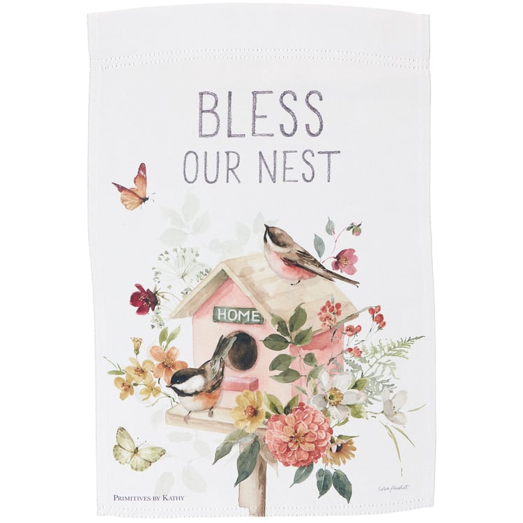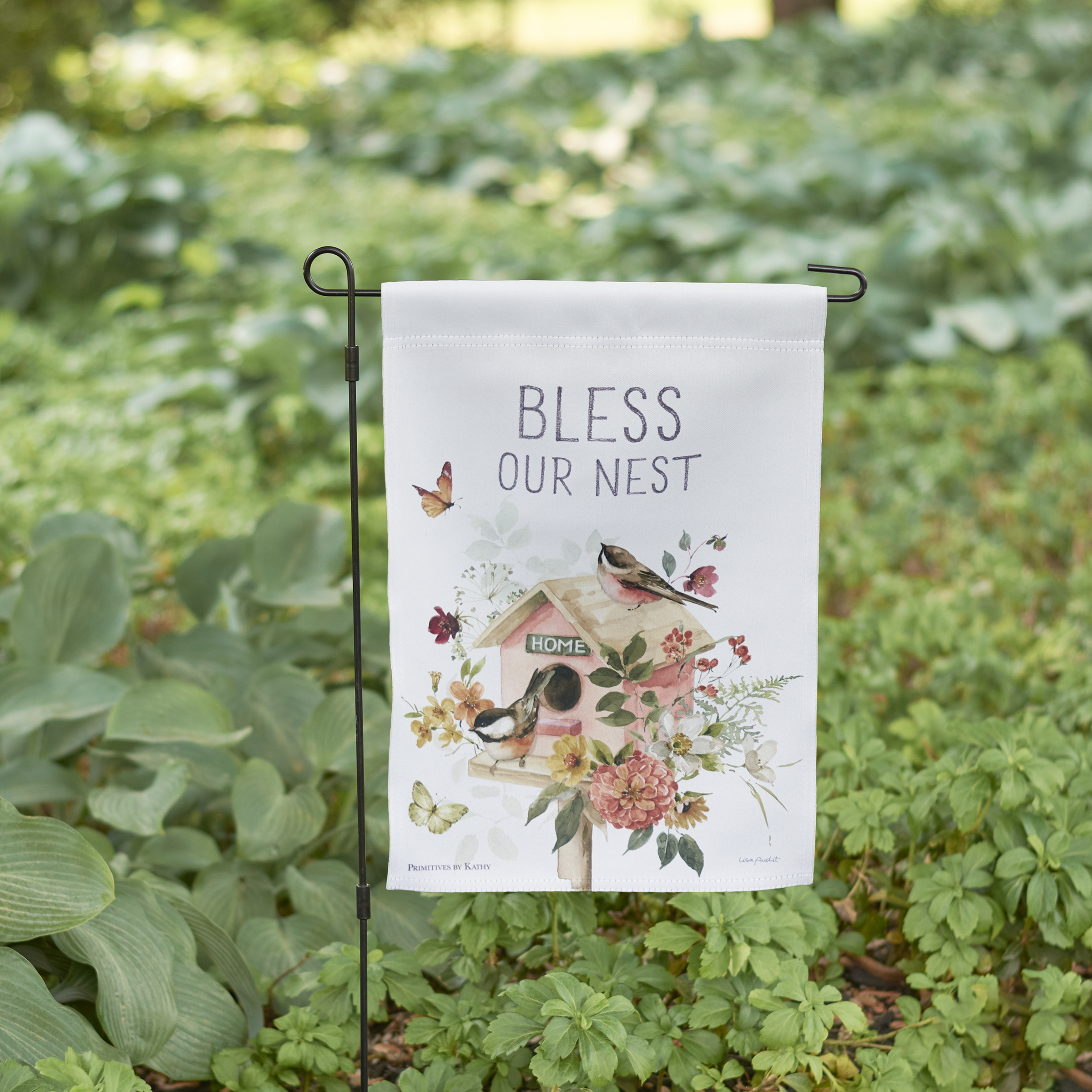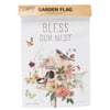 A double-sided polyester garden flag from our Easter & Spring Collection displaying a comforting scene of chickadees living in a birdhouse surrounded by spring flowers with an inspirational sentiment that reads "Bless Our Nest." Design is replicated from original art hand painted in a delicate watercolor style. Garden flag is weather-resistant and features an opening to hang on our Garden Flag Pole. Our Nest garden flag is packaged with a header card and hook to easily hang on rack. Hand wash only. A charming everyday home accent perfect for any yard or garden.