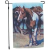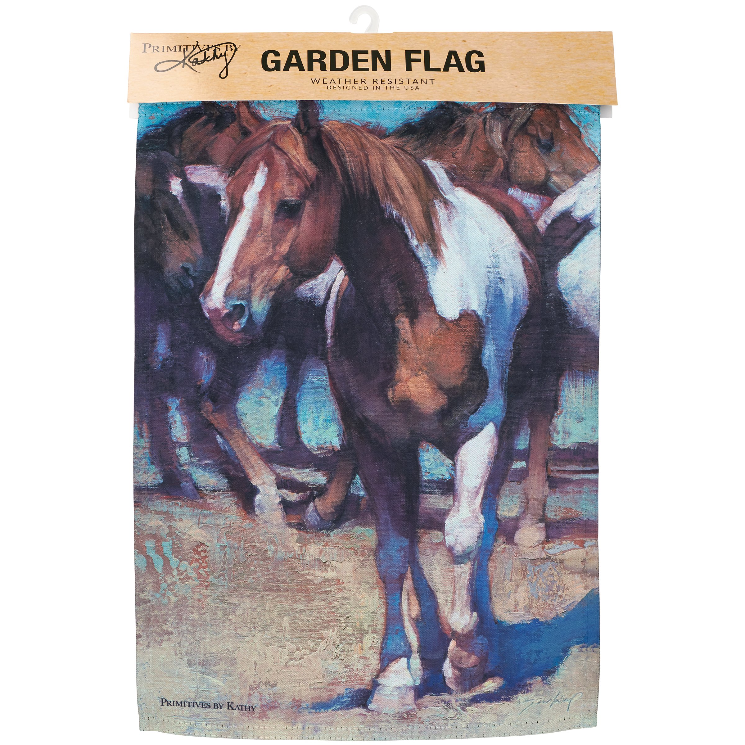 A double-sided polyester garden flag from our Western Collection displaying a vivid hand painted scene of horses in the desert. Design is replicated from original hand painted artwork for added interest. Garden flag is weather-resistant and features an opening to hang on our Garden Flag Pole. Our Painted Horse garden flag is packaged with a header card and hook to easily hang on rack. Hand wash only. A western inspired home accent perfect for everyday display in any yard or garden.