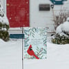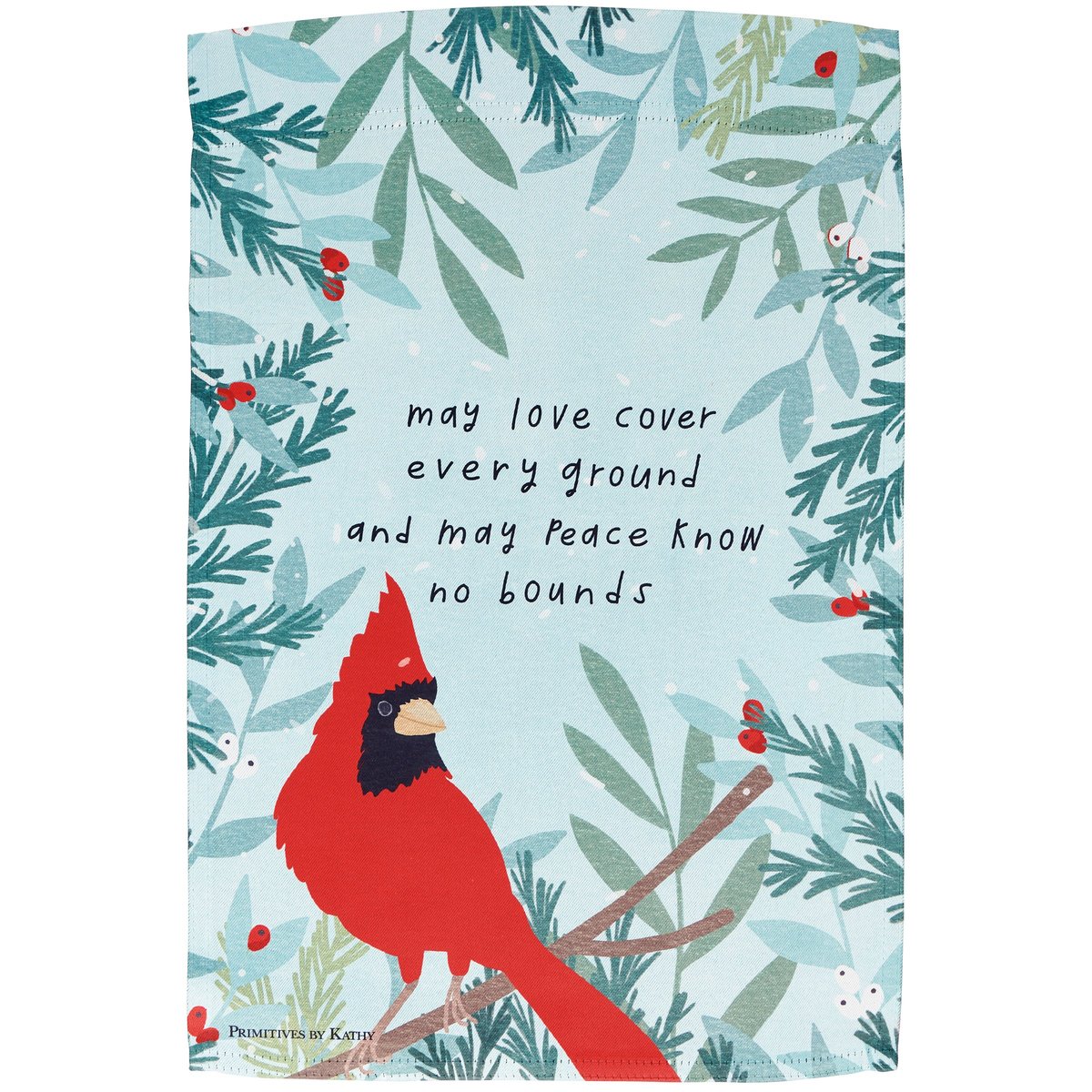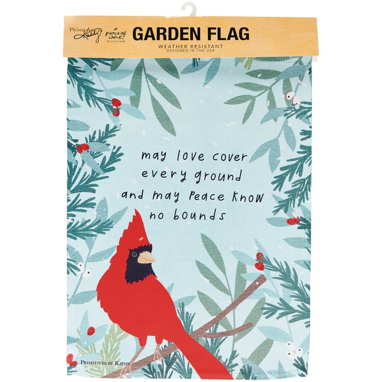 A double-sided polyester garden flag from our Christmas Collection displaying hand illustrated art of a cardinal on a winter branch with an inspirational seasonal sentiment that reads "May Love Cover Every Ground And May Peace Know No Bounds." Seasonal garden flag is weather-resistant and features an opening to hang on our Garden Flag Pole. Our Peace No Bounds garden flag is packaged with a header card and hook to easily hang on rack for store display. Hand wash only. An inspirational Christmas home accent perfect for seasonal display in any yard or garden.