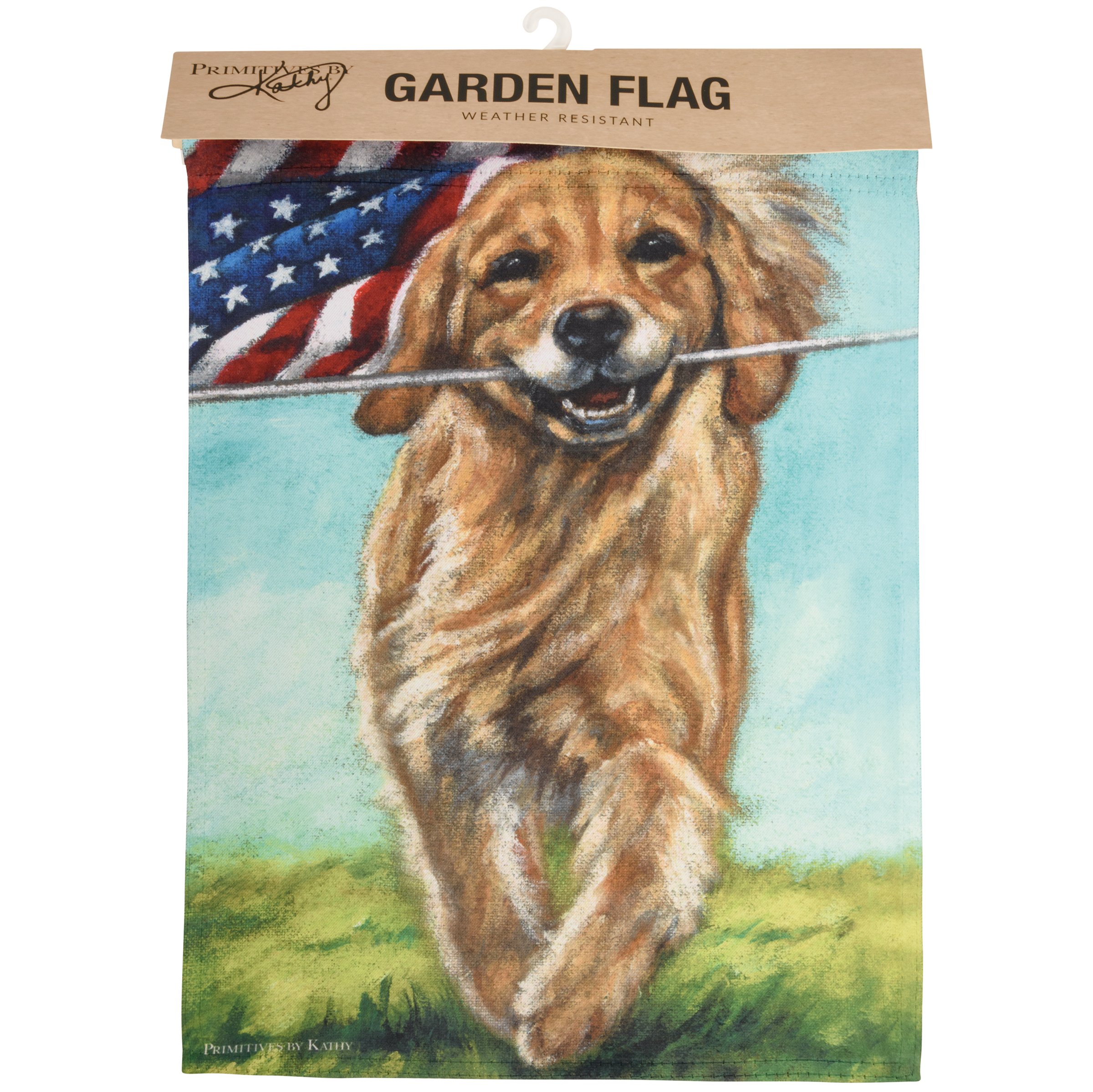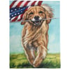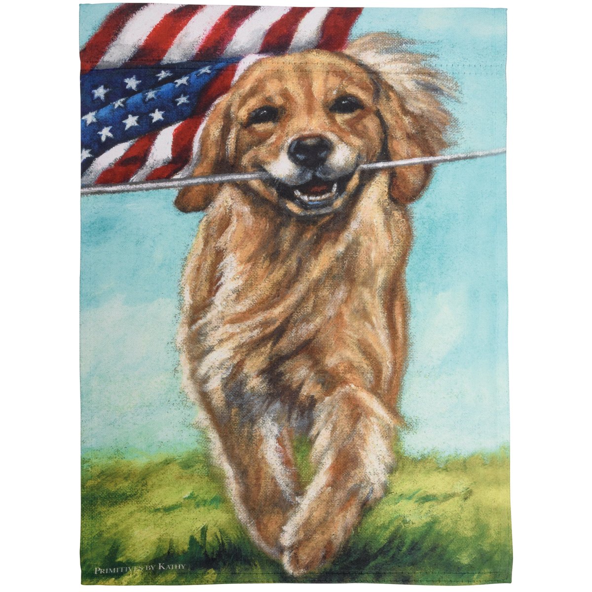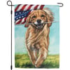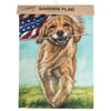 A double-sided polyester garden flag from our Patriotic Collection featuring a design of a dog running with an American flag. design is replicated from original artwork painted onto burlap canvas, giving the art a unique depth and texture. This Running Dog garden flag is weather-resistant and features an opening to hang on our Garden Flag Pole