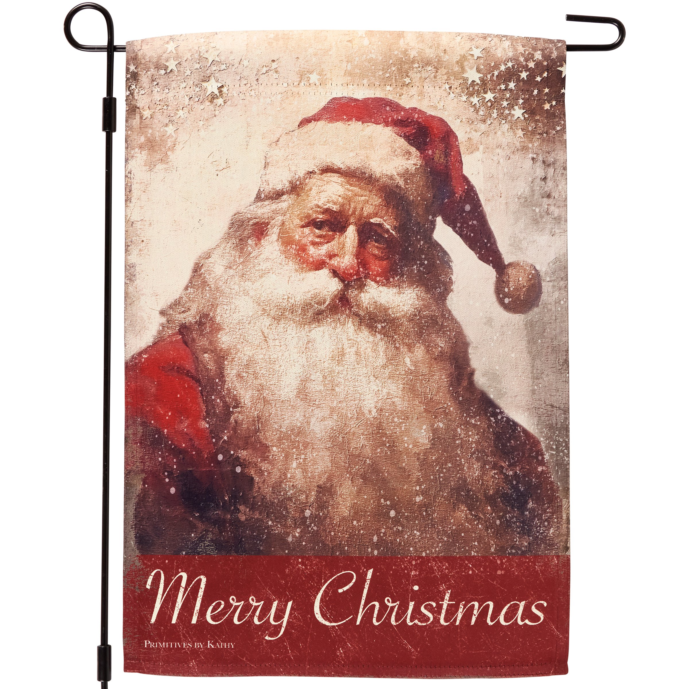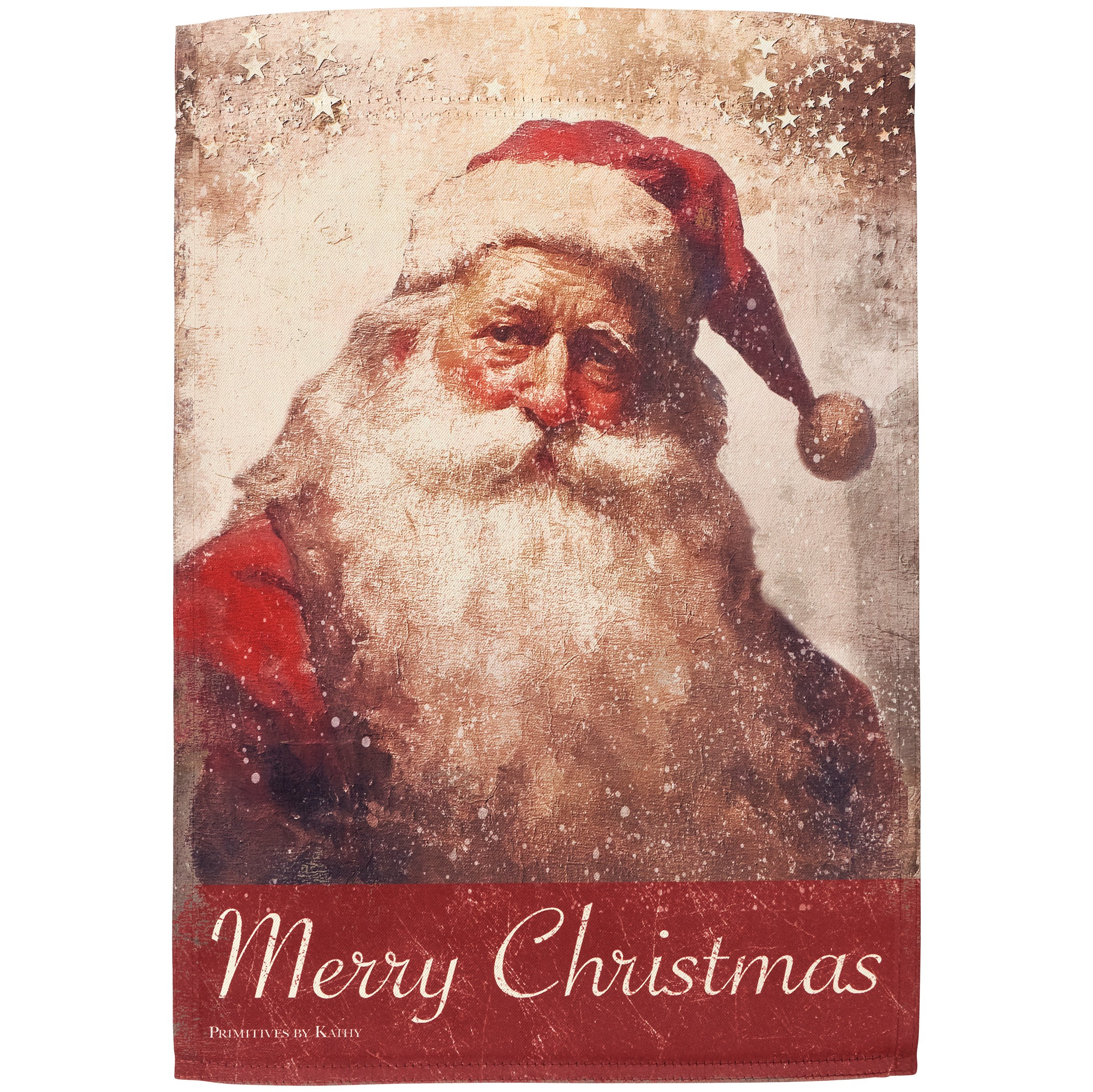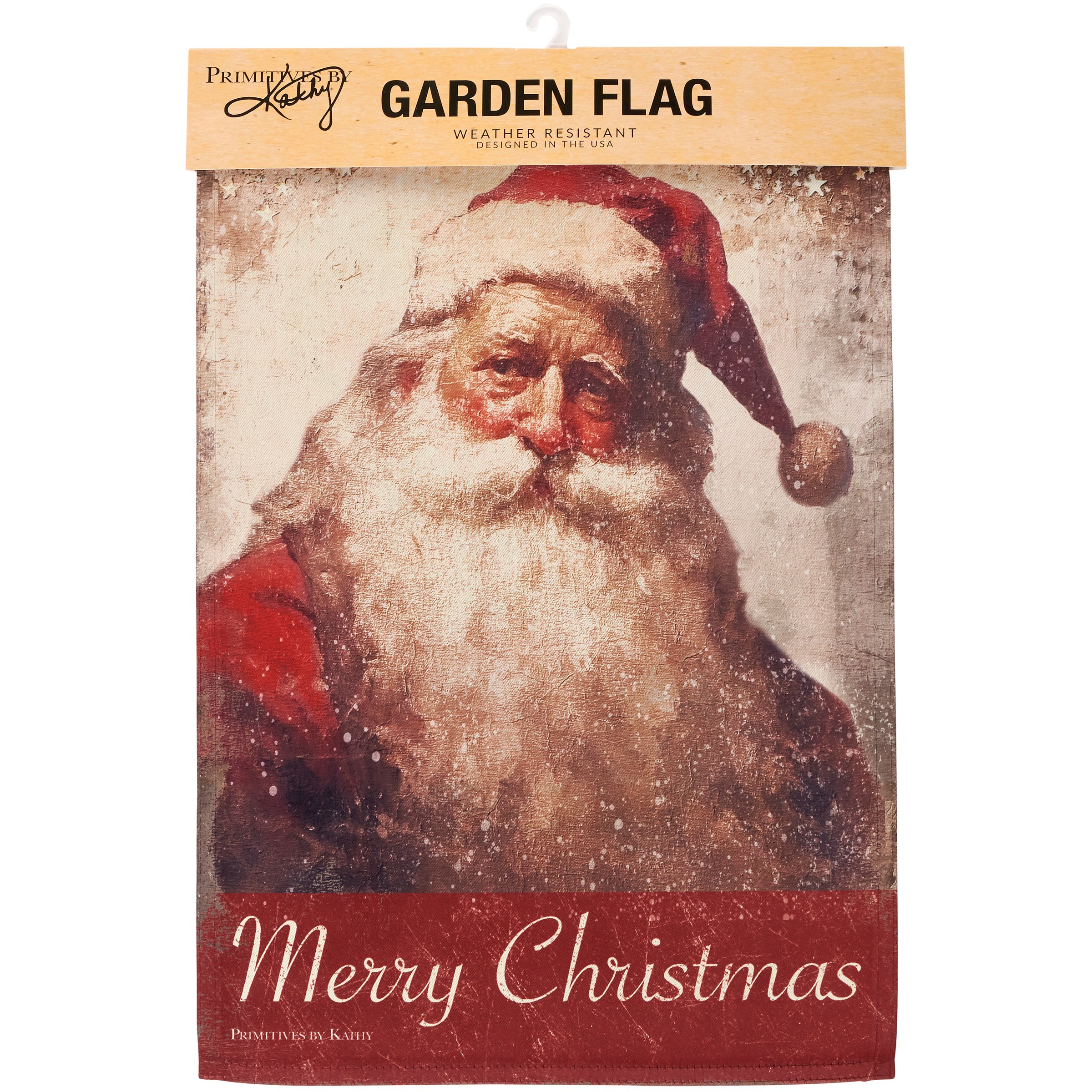 A double-sided polyester garden flag from our Christmas Collection displaying a vintage Santa portrait with textured rustic details and a seasonal sentiment that reads "Merry Christmas." Seasonal garden flag is weather-resistant and features an opening to hang on our Garden Flag Pole. Our Santa's Portrait garden flag is packaged with a header card and hook to easily hang on rack for store display. Hand wash only. A rustic Christmas home accent perfect for seasonal display in any yard or garden.