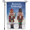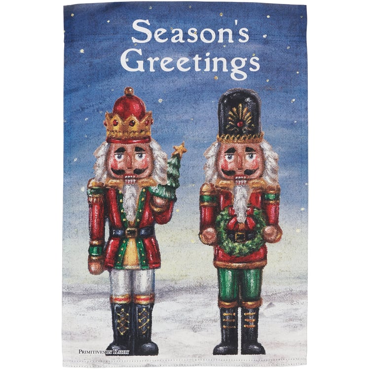 A double-sided polyester garden flag from our Christmas Collection displaying a charming winter scene of nutcrackers with a seasonal sentiment that reads "Season's Greetings." Nutcrackers design is replicated from original artwork painted onto burlap canvas, giving the art a unique depth and texture. Seasonal garden flag is weather-resistant and features an opening to hang on our Garden Flag Pole. Our Season's Greetings garden flag is packaged with a header card and hook to easily hang on rack for store display. Hand wash only. A nutcracker-themed Christmas home accent perfect for seasonal display in any yard or garden.