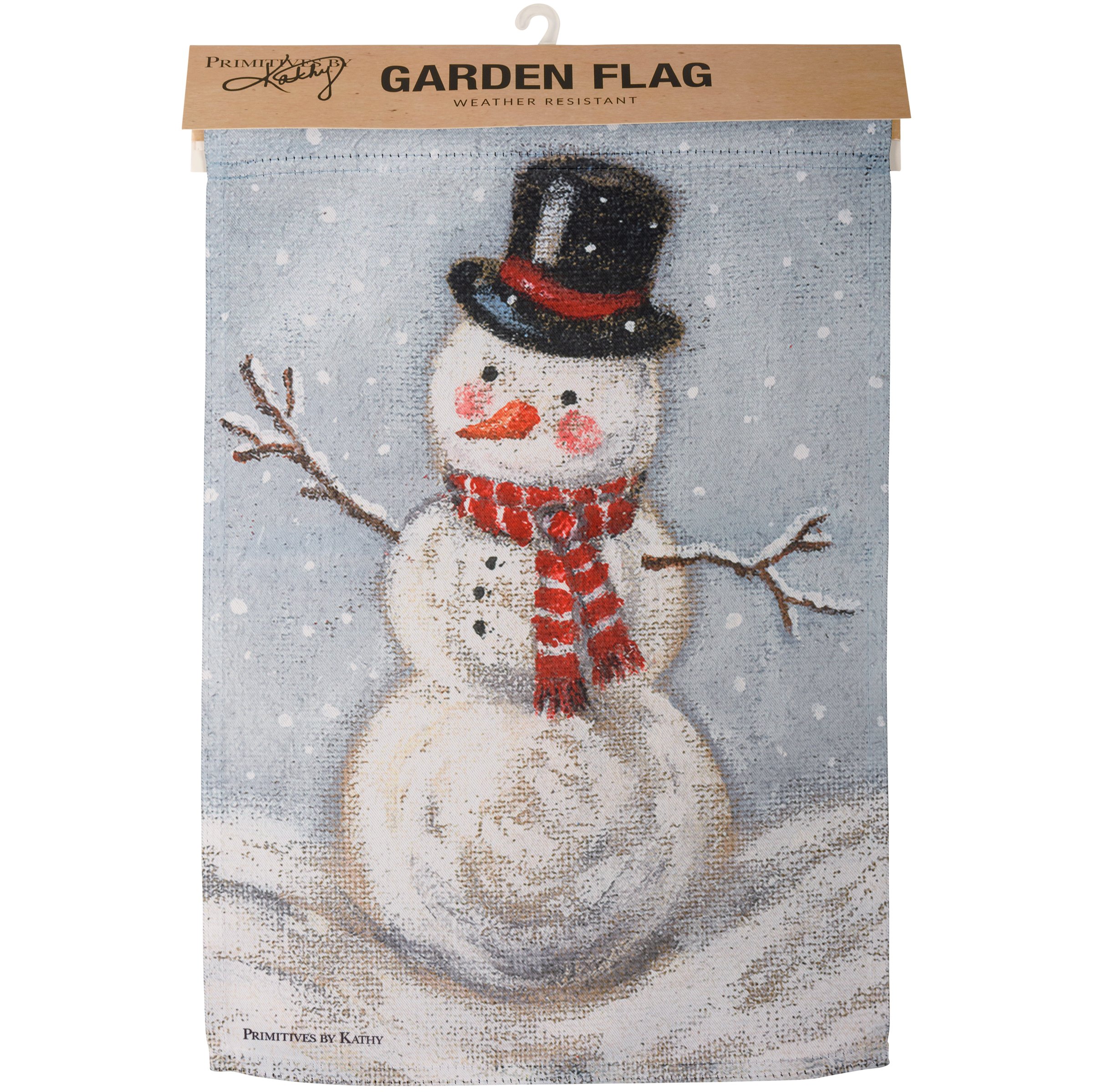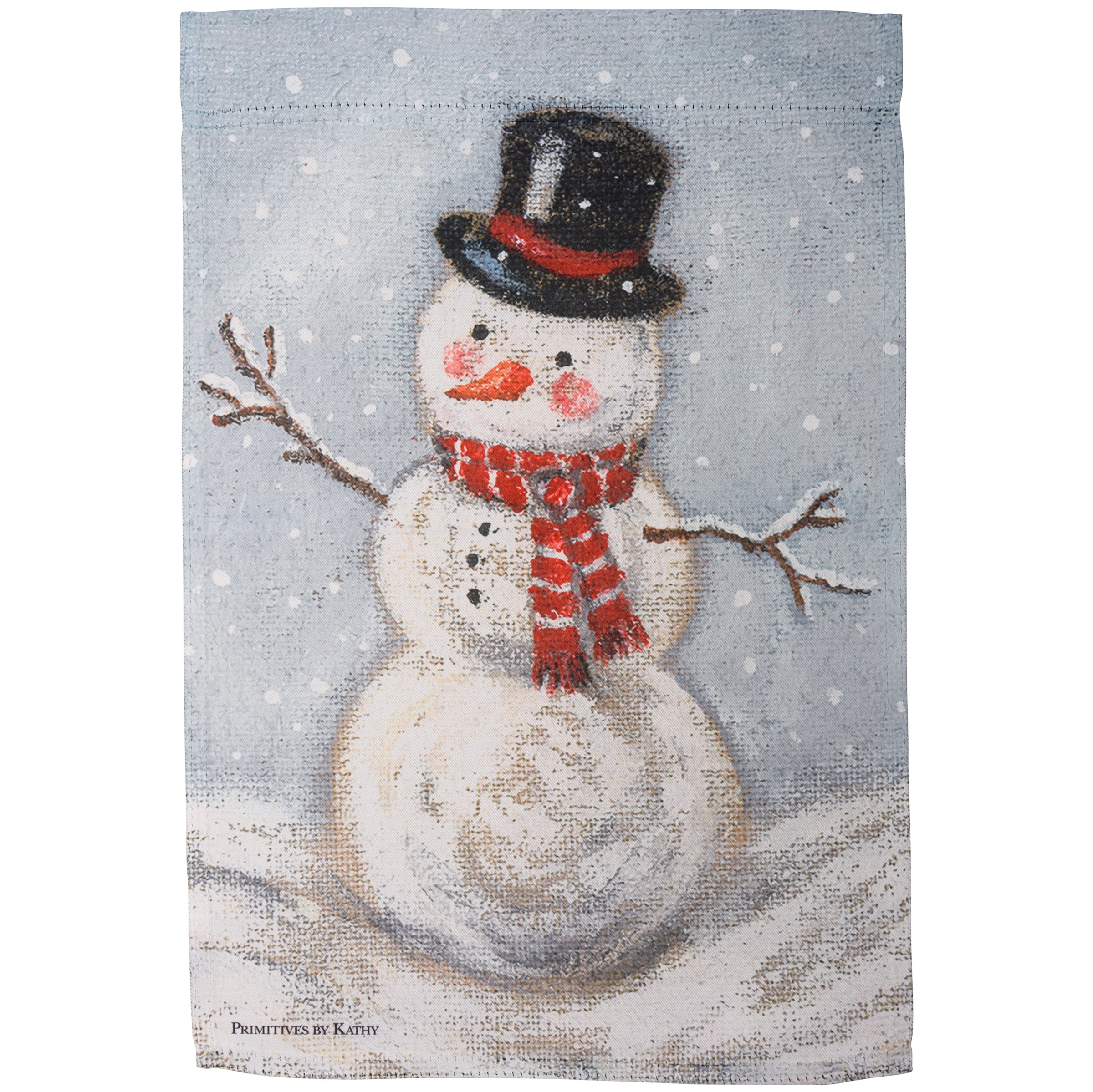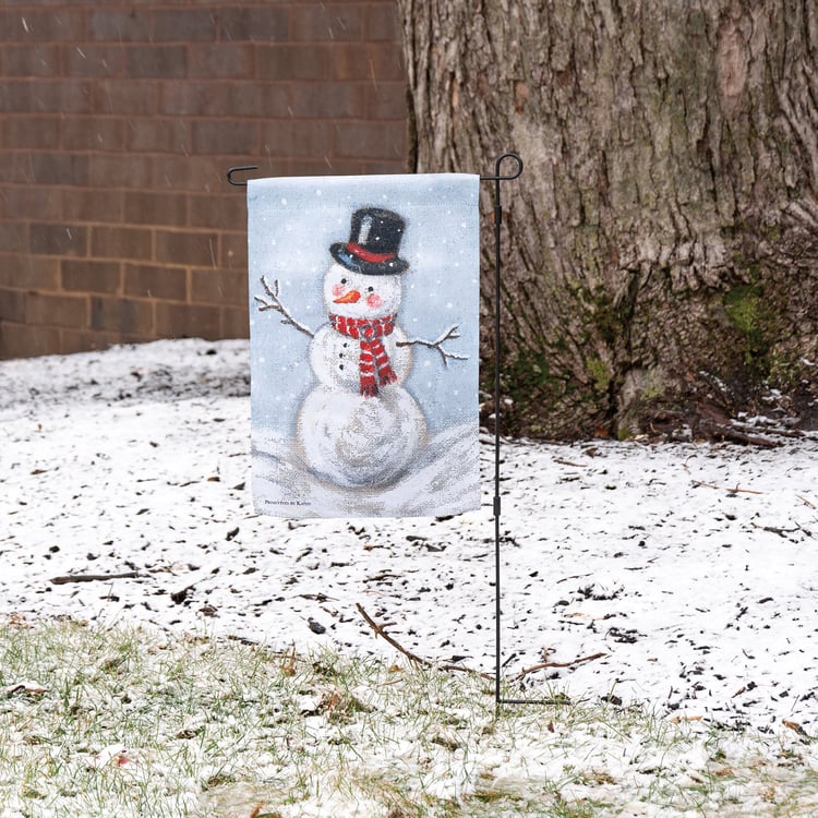 A double-sided polyester garden flag from our Christmas Collection featuring a snowman design. Design is replicated from original artwork painted onto burlap canvas, giving the art a unique depth and texture. This snowman garden flag is weather-resistant and features an opening to hang on our Garden Flag Pole. Hand-wash only.