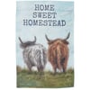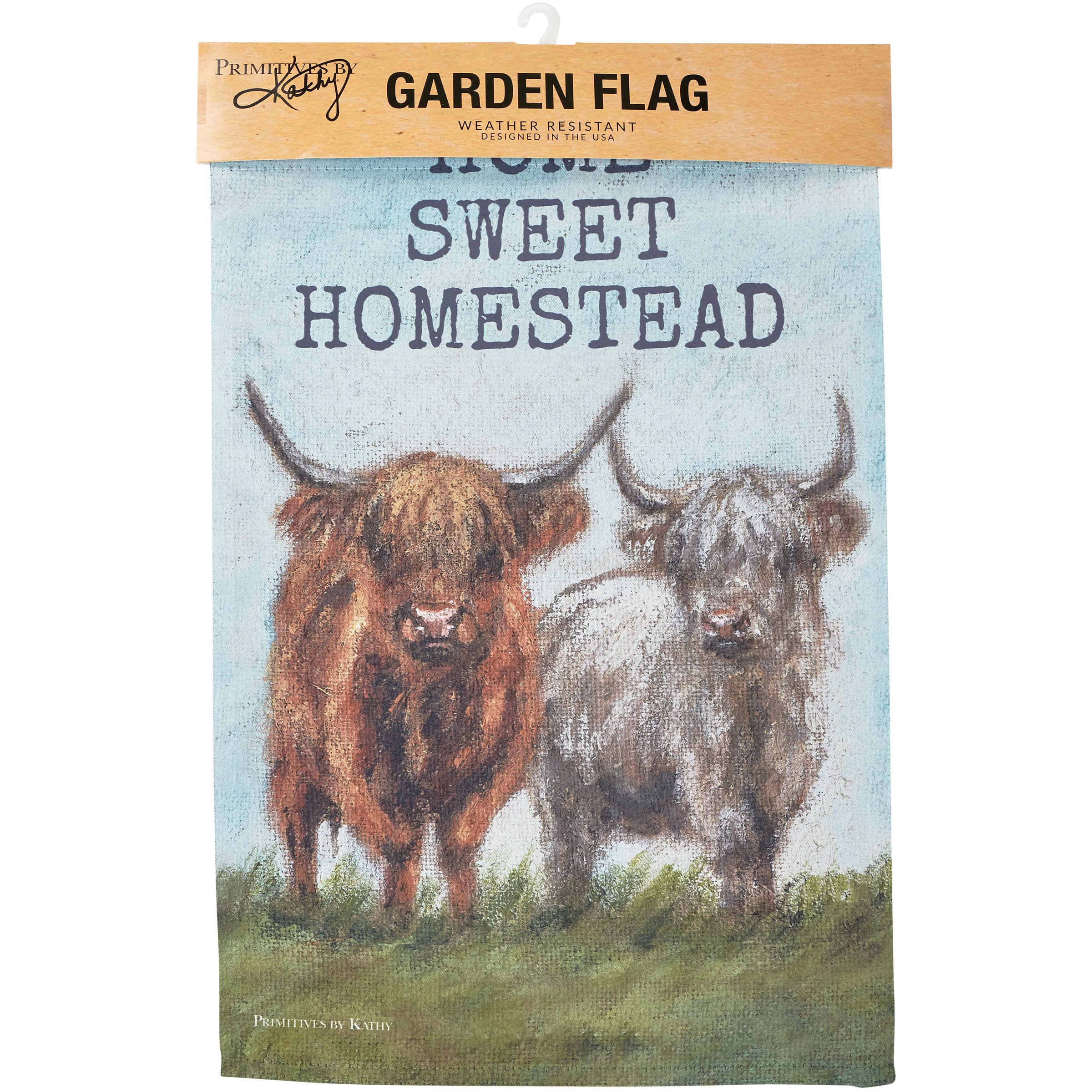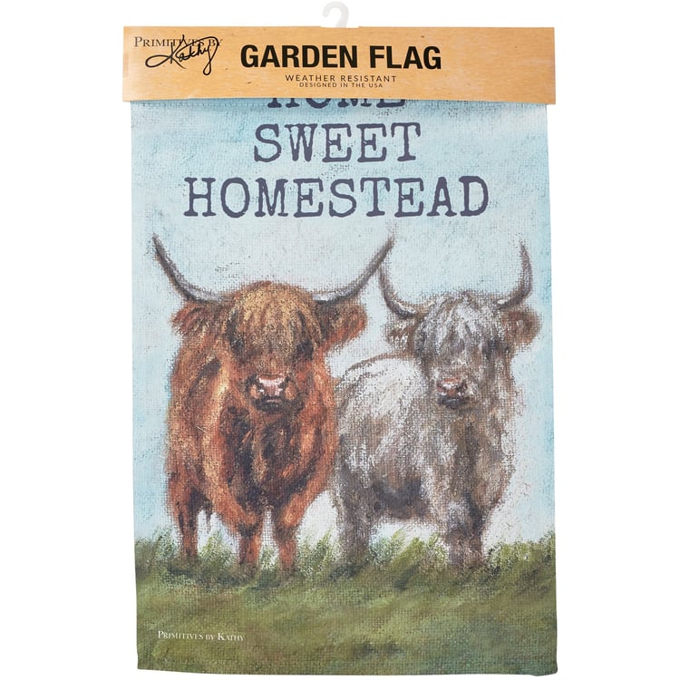 A double-sided polyester garden flag from our Homestead Collection displaying a charming hand painted scene of a brown and a white highland cow in a field with a farm-themed sentiment that reads "Home Sweet Homestead." Design is replicated from original artwork painted onto burlap canvas, giving the art a unique depth and texture. Garden flag is weather-resistant and features an opening to hang on our Garden Flag Pole. Our Home Sweet Homestead garden flag is packaged with a header card and hook to easily hang on rack. Hand wash only. A farm-themed home accent perfect for everyday display in any yard or garden.