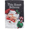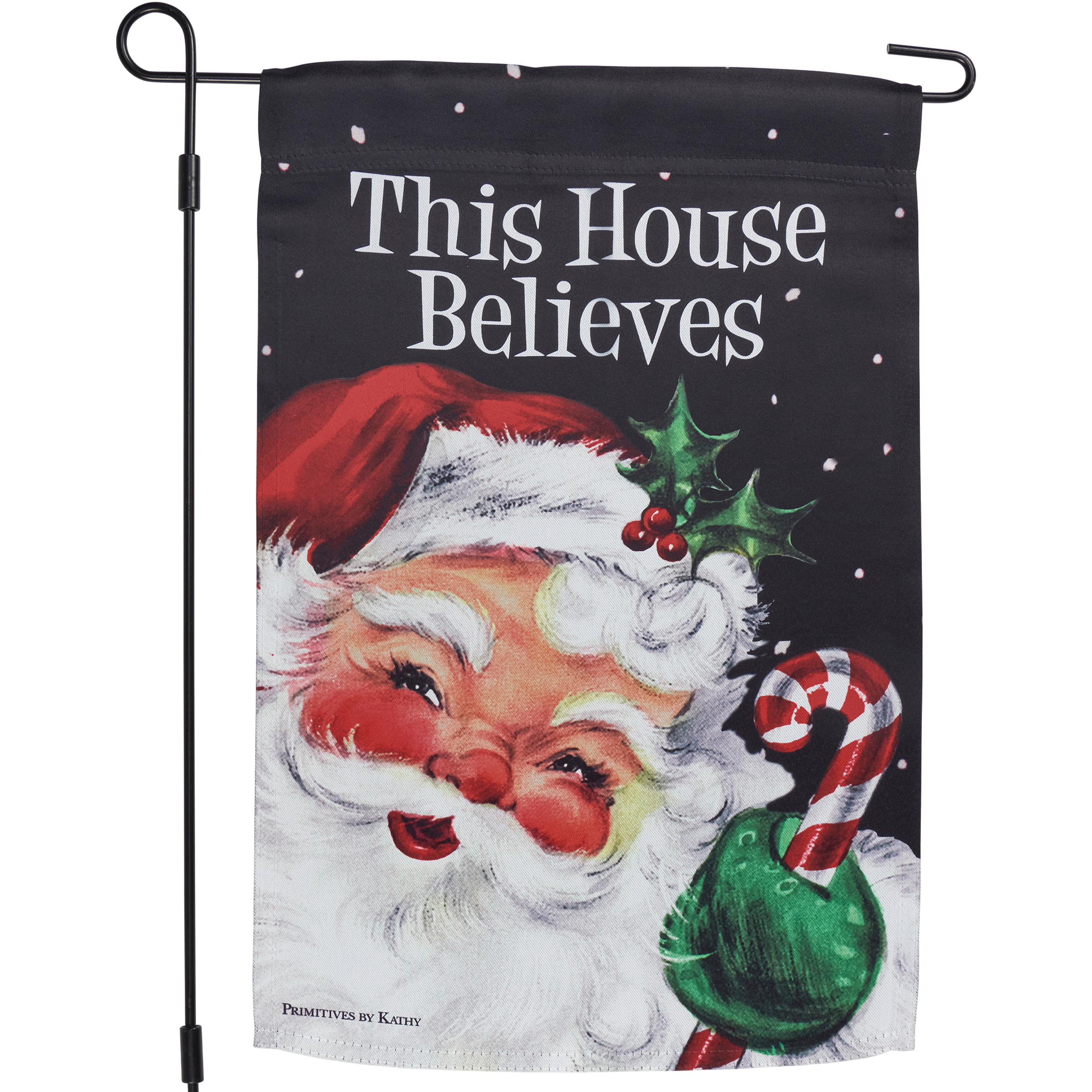 A double-sided polyester garden flag from our Christmas Collection displaying vintage art of a jolly Santa with "This House Believes" sentiment. Flag is weather-resistant and features an opening to hang on our Garden Flag Pole. Hand-wash only. Our This House Believes garden flag is packaged with a header card and hook to easily hang on rack. A fun seasonal home accent perfect for any yard or garden.