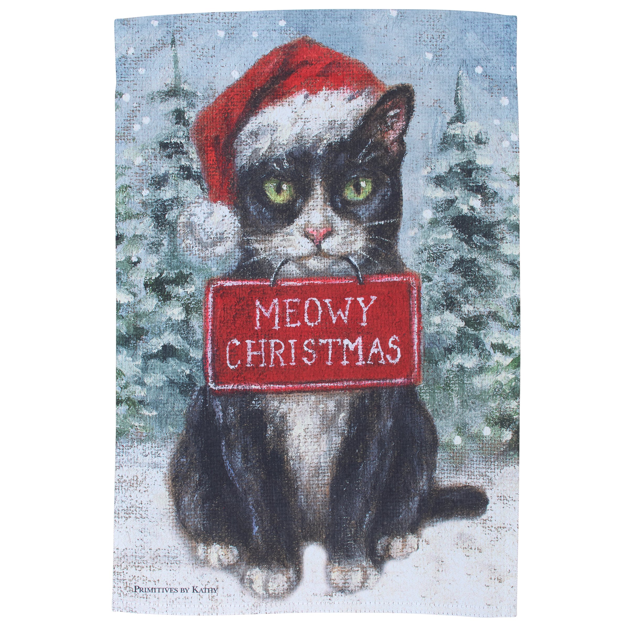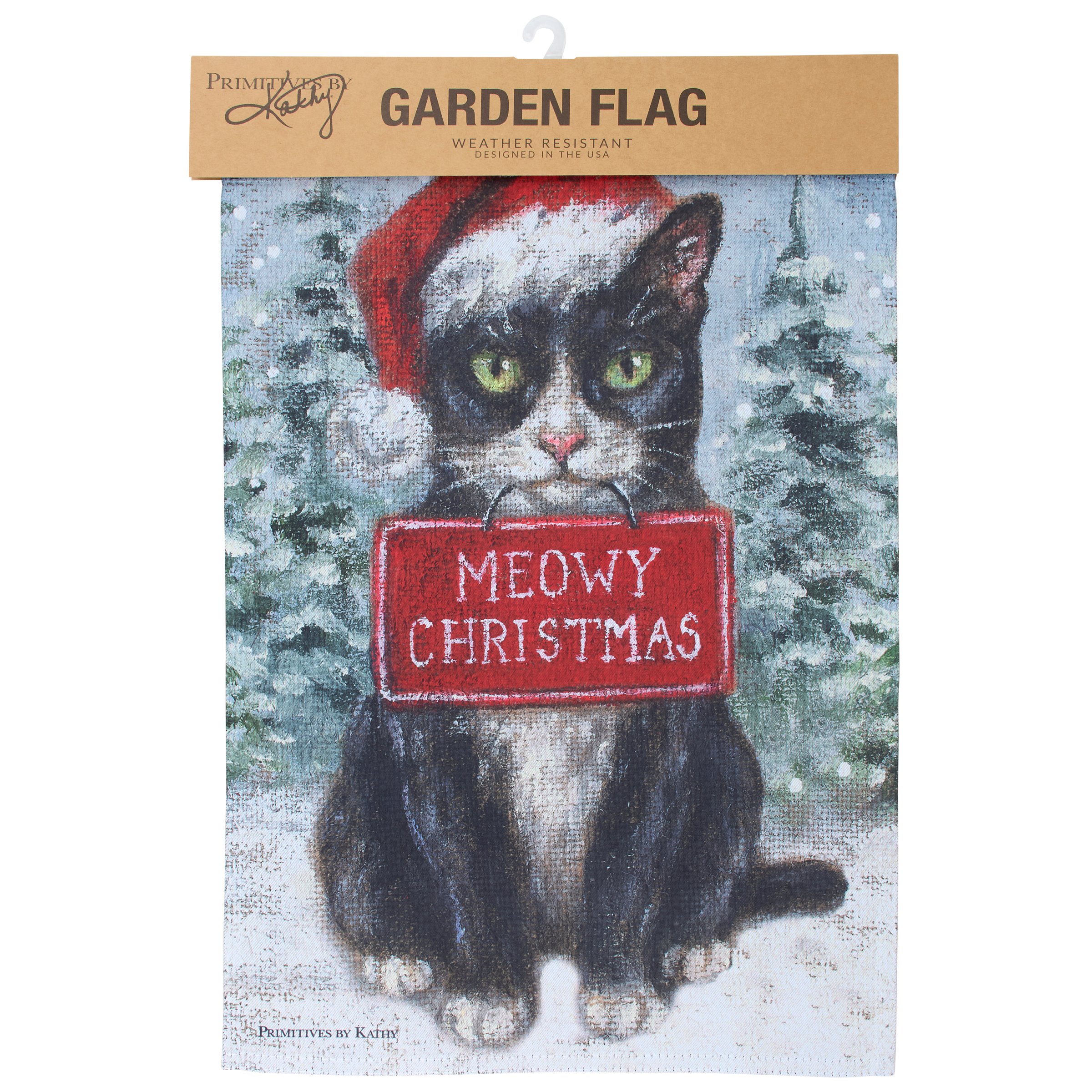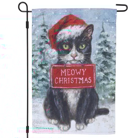 A polyester garden flag from our Holiday Pet Collection featuring a double-sided design displaying a charming winter scene of a tuxedo cat wearing a Santa hat and holding a sign that reads "Meowy Christmas" for a fun combination of a love for Christmas and pets. Christmas cat design is replicated from original artwork painted onto burlap canvas, giving the art a unique depth and texture. Seasonal garden flag is weather-resistant and features an opening to hang on our Garden Flag Pole. Hand-wash only. Our Meowy Christmas Tuxedo Cat garden flag is packaged with a header card and hook to easily hang on rack for store display. A fun cat themed home accent perfect for seasonal display in any yard or garden.