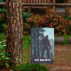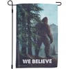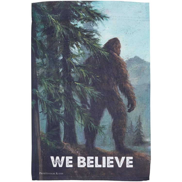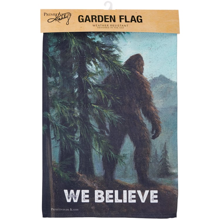 A double-sided polyester garden flag from our Lake & Cabin Collection displaying a scene of bigfoot behind a tree with a fun bigfoot inspired sentiment that reads "We Believe." Bigfoot design is replicated from original artwork painted onto burlap canvas, giving the art a unique depth and texture. Bigfoot garden flag is weather-resistant and features an opening to hang on our Garden Flag Pole. Our We Believe Bigfoot garden flag is packaged with a header card and hook to easily hang on rack for store display. Hand wash only. A fun bigfoot-themed home accent perfect for everyday display in any yard or campsite.