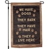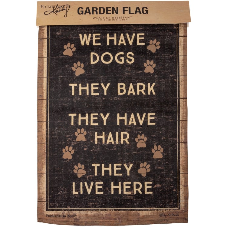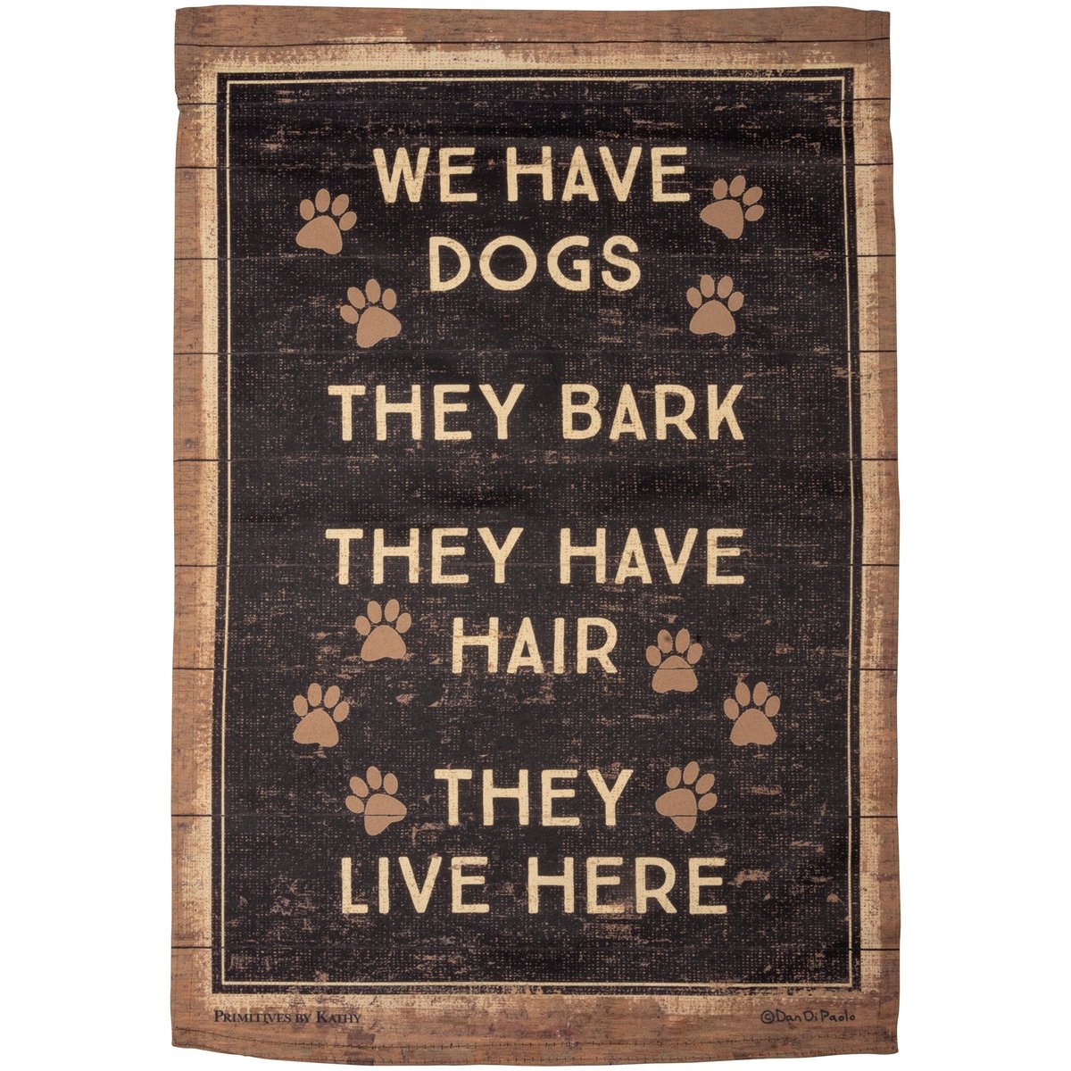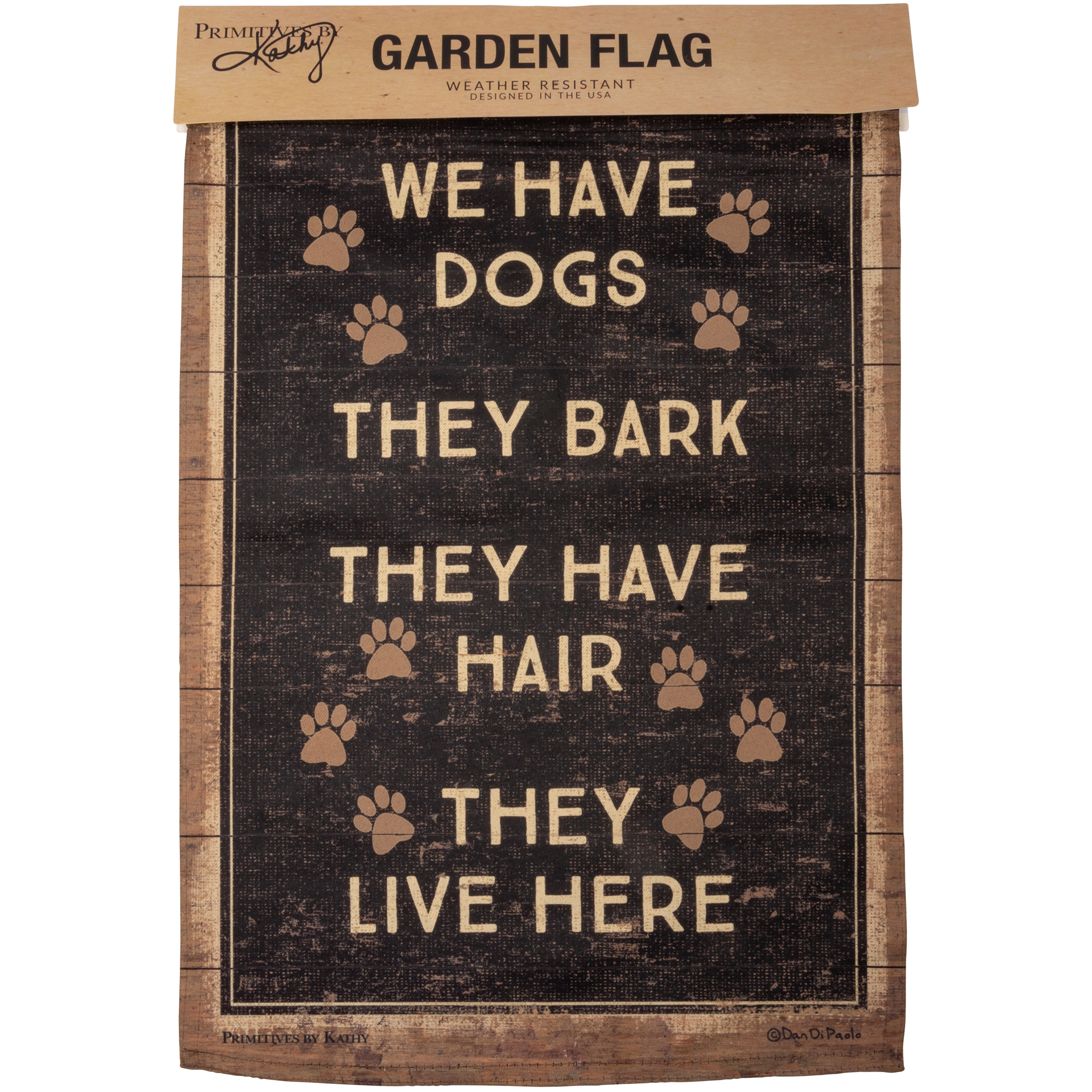 A double-sided polyester garden flag from our Pet Collection featuring a rustic design with paw print icons and "We Have Dogs They Bark They Have Hair They Live Here" sentiment. Garden flags are weather-resistant and feature an opening to hang on our Garden Flag Pole. Hand-wash only.